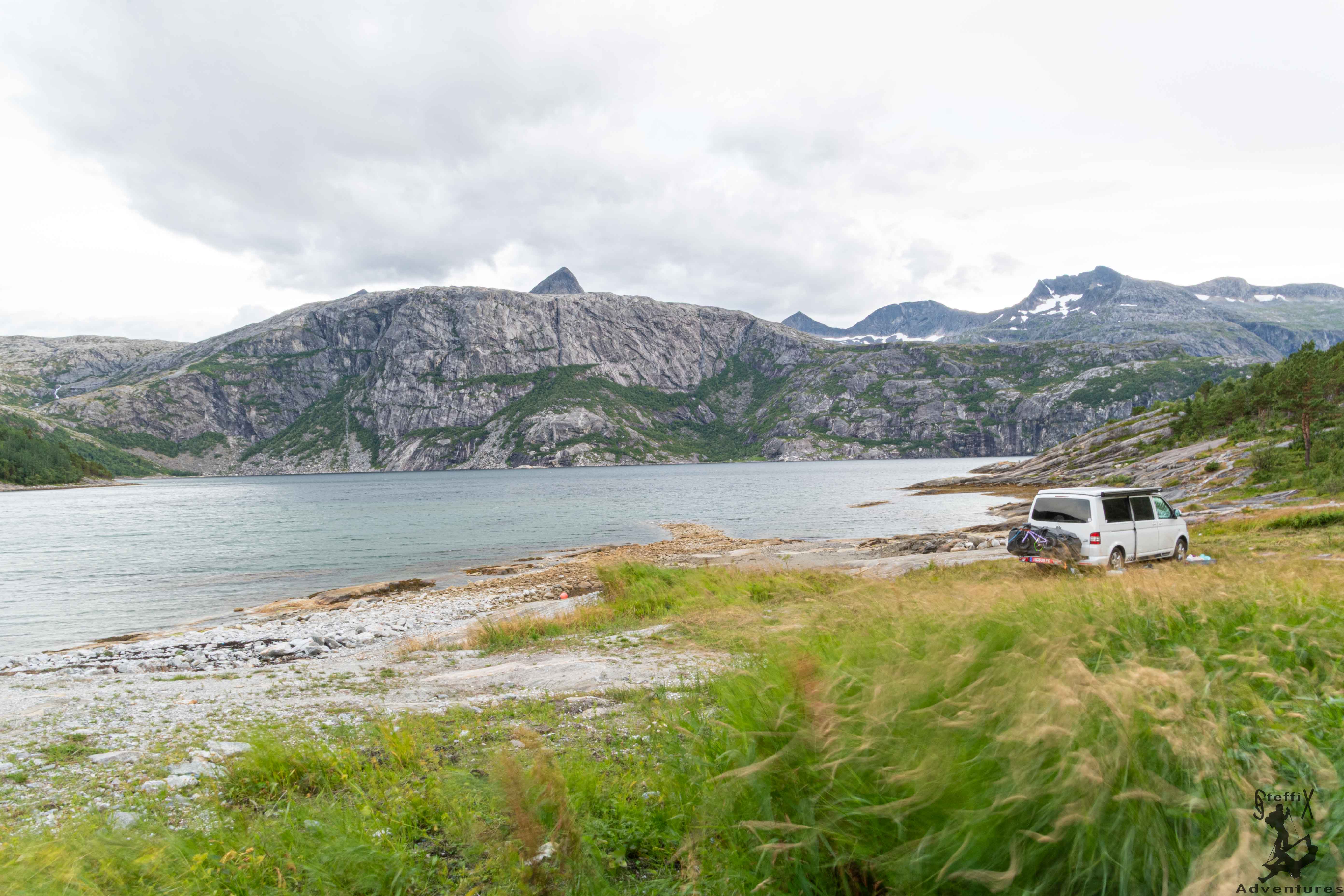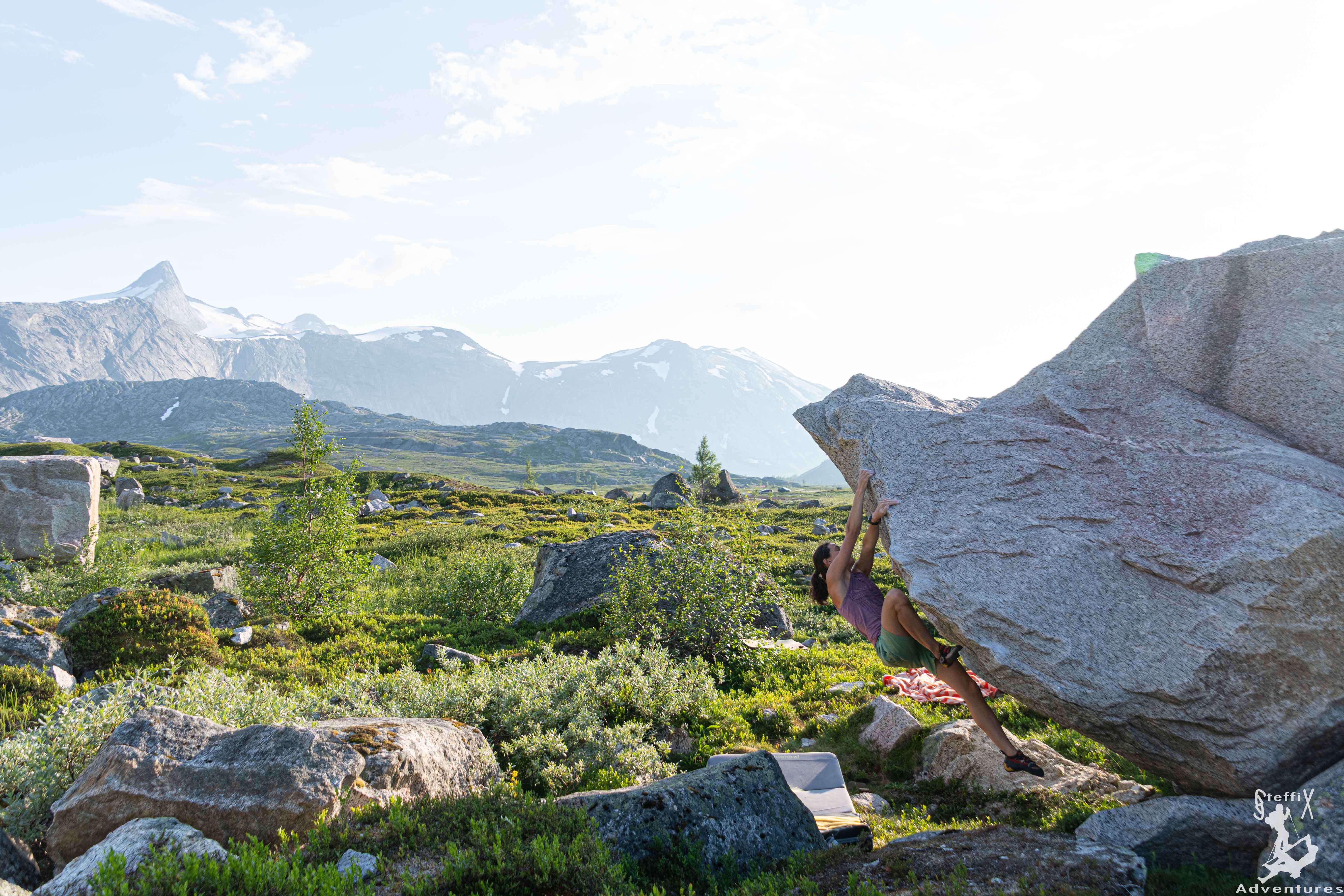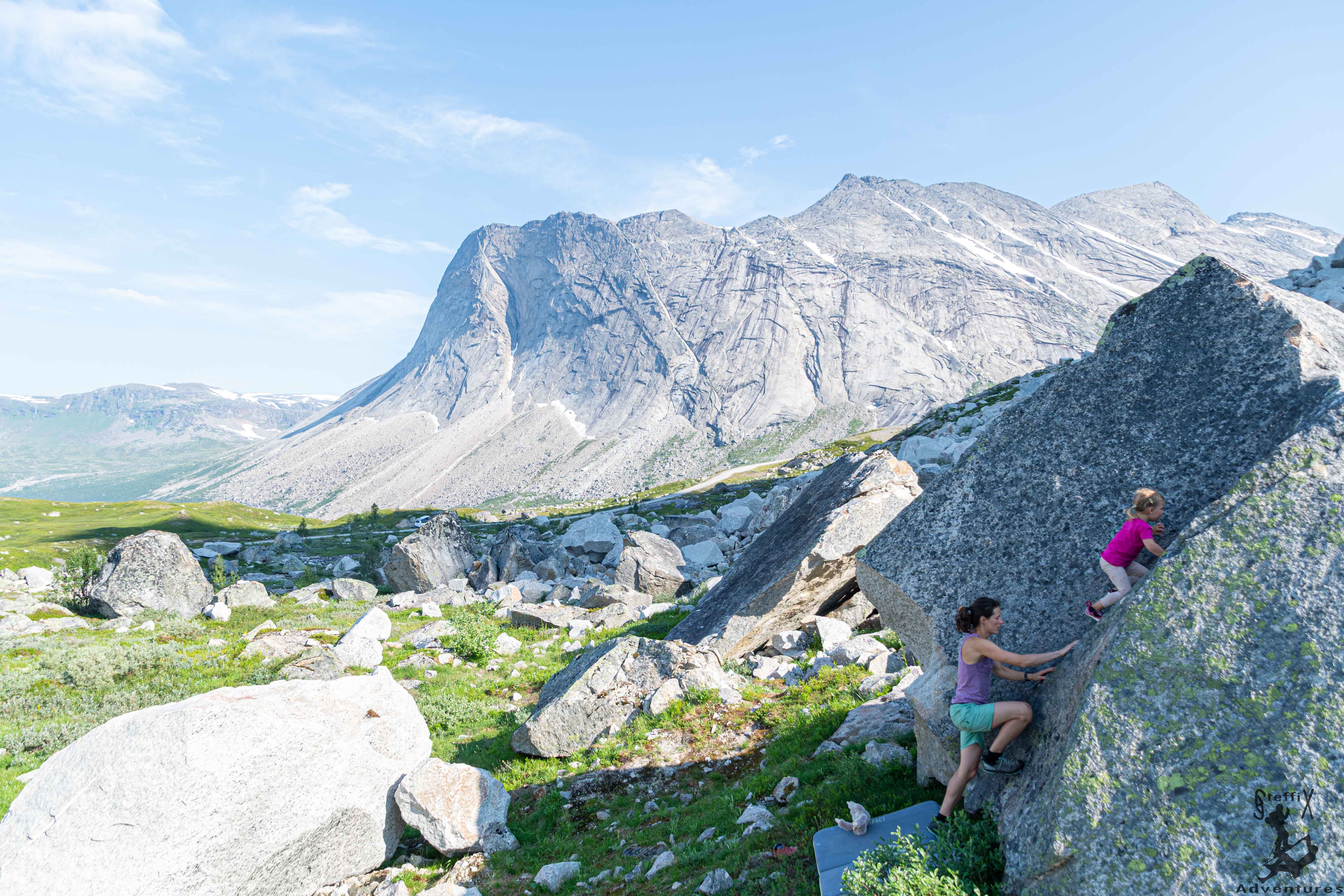 Wir starten am nächsten Tag nach Festvag, wo es auch ein Klettergebiet gibt, das allerdings andere Temperaturen benötigt, denn die Schlechtwetterfront ist Geschichte und es ist wieder sehr warm. So geht es dann für uns noch weiter nach Kjerringoy, eine Halbinsel nördlich von Bodo, welche unfassbar schön ist. Wir genießen die Landschaft, die fischreichen Gewässer und die leeren weißen Sandstrände. Badeurlaub Deluxe mit frischgefangenem Fisch, besser geht nicht. Nach Kjerringoy wollen wir das vielleicht letzte schöne Wetterfenster nutzen und beschließen nach Gjerdalen zu fahren, um dort auch den 4. Geburtstag zu feiern. Die aufleuchtende Kontrollleuchte vom Airbag macht die Fahrt dort hin etwas unentspannt, wir beschließen dennoch, erst nach Gjerdalen in die Werkstatt zu fahren und die Entscheidung war die richtige. 2,5 Tage, kein Handyempfang, Boulderblöcke sowie Wanderungen vom Schlafplatz erreichbar und ein sehr gelungener 4. Geburtstag bei starkem Wind, was ein Frühstück im Bus erforderte. Wir können dieses einsame Tal uneingeschränkt weiterempfehlen, da es landschaftlich genial ist und die Ruhe und Möglichkeiten, die es bietet, einem einfach entspannen lässt.
