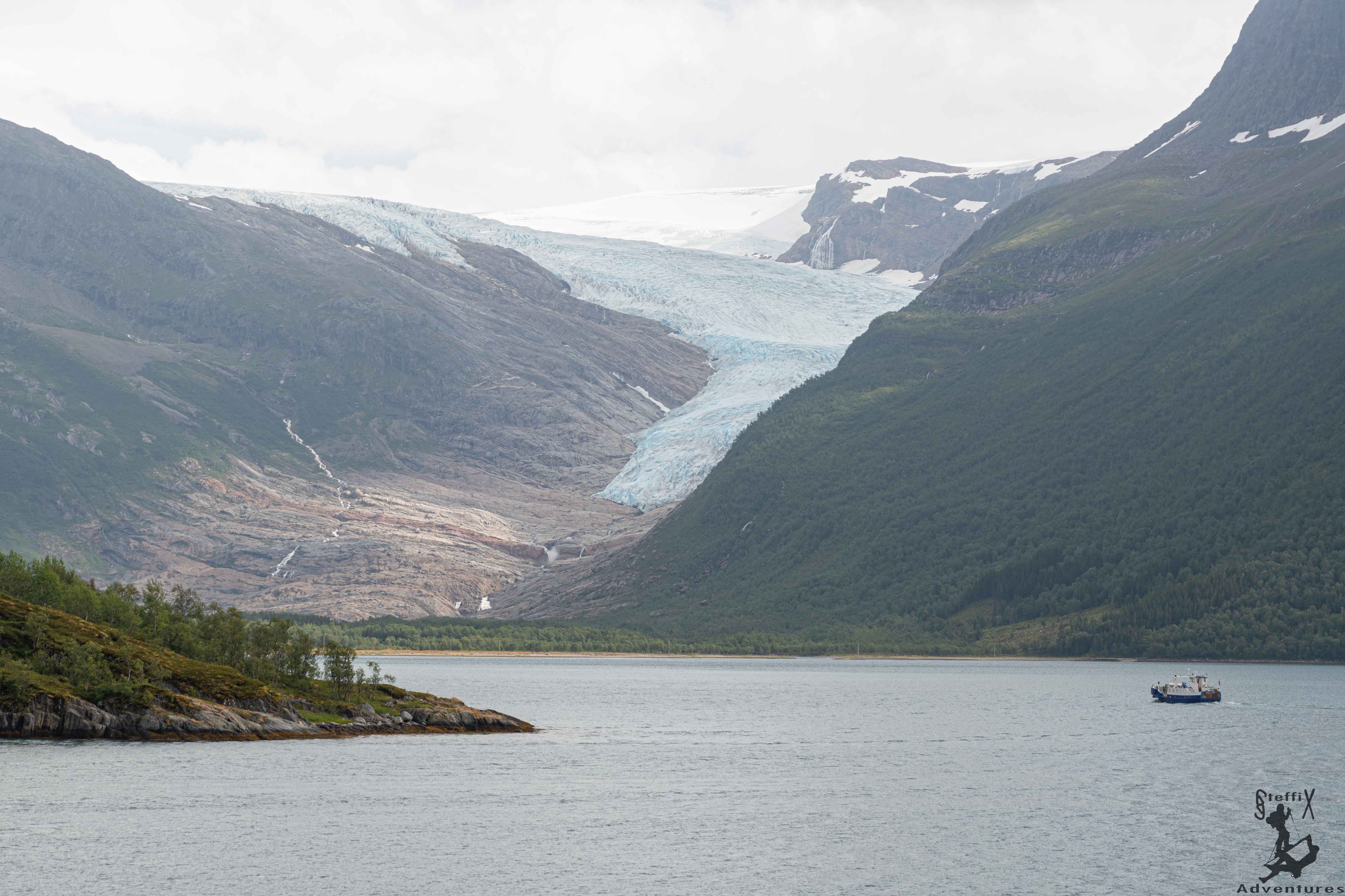 Nach Donna geht es dann ein Stück weiter nördlich bis Svartisdal, wo wir am nächsten Tag bis zum Svartisen Gletscher gehen möchten. Wir lernen am Freicampingplatz, der einen tollen Spielplatz zu bieten hat, eine sehr nette Schweizerfamilie kennen. Mit ihnen gehen wir am nächsten Tag dann mehr oder weniger gemeinsam zum Svartisen Gletscher, was der Start einer sehr schönen gemeinsamen Woche war. Eine kurze Bootsfahrt und eine schöne Wanderung erwarten uns an diesem Tag. Es ist sehr warm, die Kids sind aber superbrav und schlussendlich geht Felix die letzten Meter alleine bis direkt zum Fuße vom Gletscher, damit wir keinen Stress haben, das Boot zurückzuerwischen. Wir fahren dann am Abend mit den Schweizern noch ein Stück in Richtung Norden, bis fast zum Polarkreis. Die nächsten Tage sollten wettertechnisch nicht so gut werden. Gemeinsam mit den Schweizern machen wir aber das Beste draus und haben eine sehr schöne Zeit gemeinsam. Sind viel erfolgreich angeln, wandern, Fahrrad fahren und erkunden sogar das größte Höhlensystem in Skandinavien. Die Mädls verstehen sich super, sind ja auch nur einen Tag hintereinander auf die Welt gekommen. In Bodo nehmen wir dann eine gemeinsame Airbnb Unterkunft für 2 Nächte, was Felix gut arbeiten lässt und auch das regnerische Wetter kann gut vorbeiziehen. Zum Abschluss einer sehr spontanen und mehr als nur gelungen Woche gehen wir dann alle gemeinsam sogar noch klettern und es macht richtig Spaß Fels zu spüren und sich an der Wand zu bewegen und danach beenden wir den Traumtag mit baden noch an einem schönen See, an dem wir auch schlafen und uns dann von den Schweizern verabschieden, die am nächsten Tag zu den Lofoten starten.