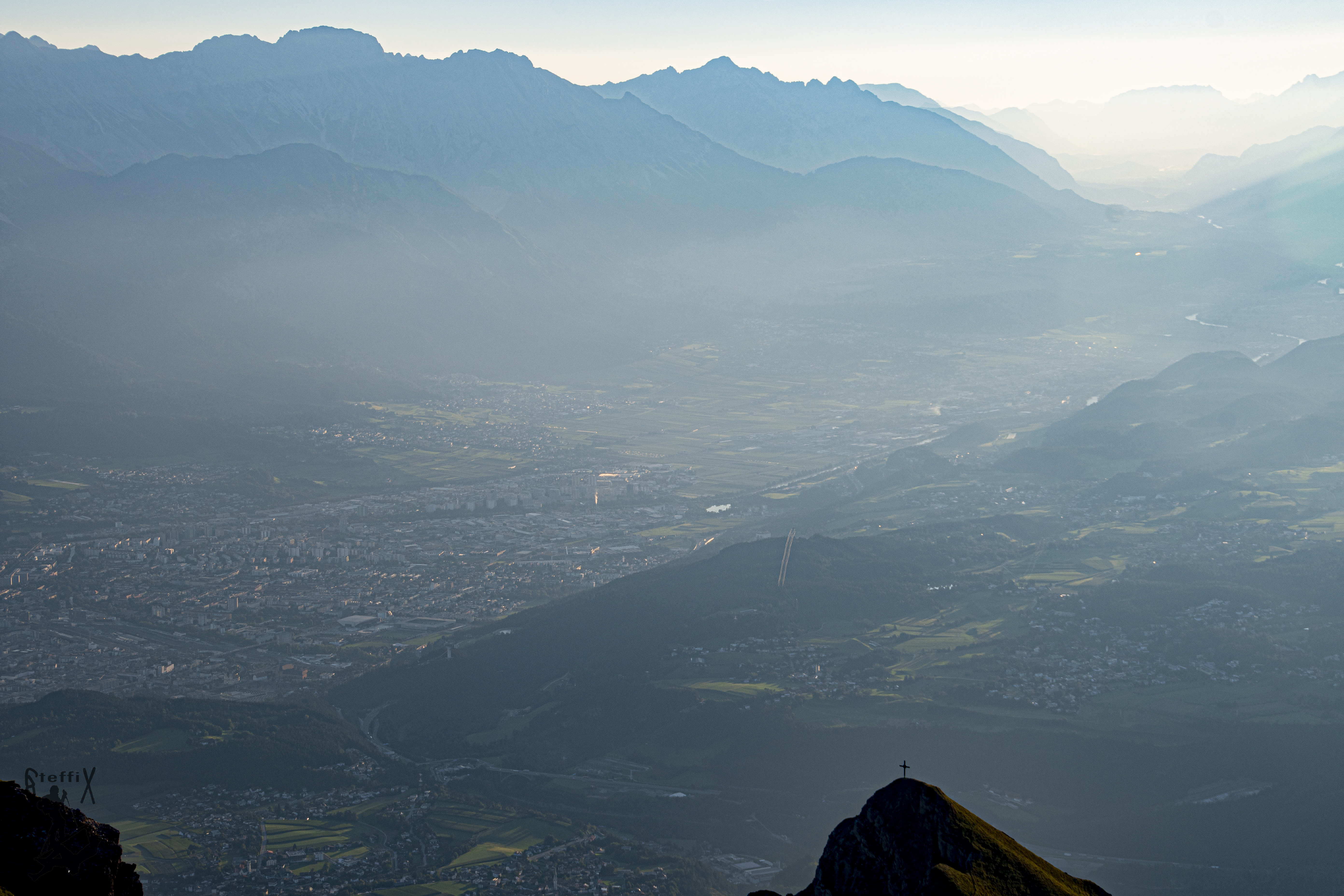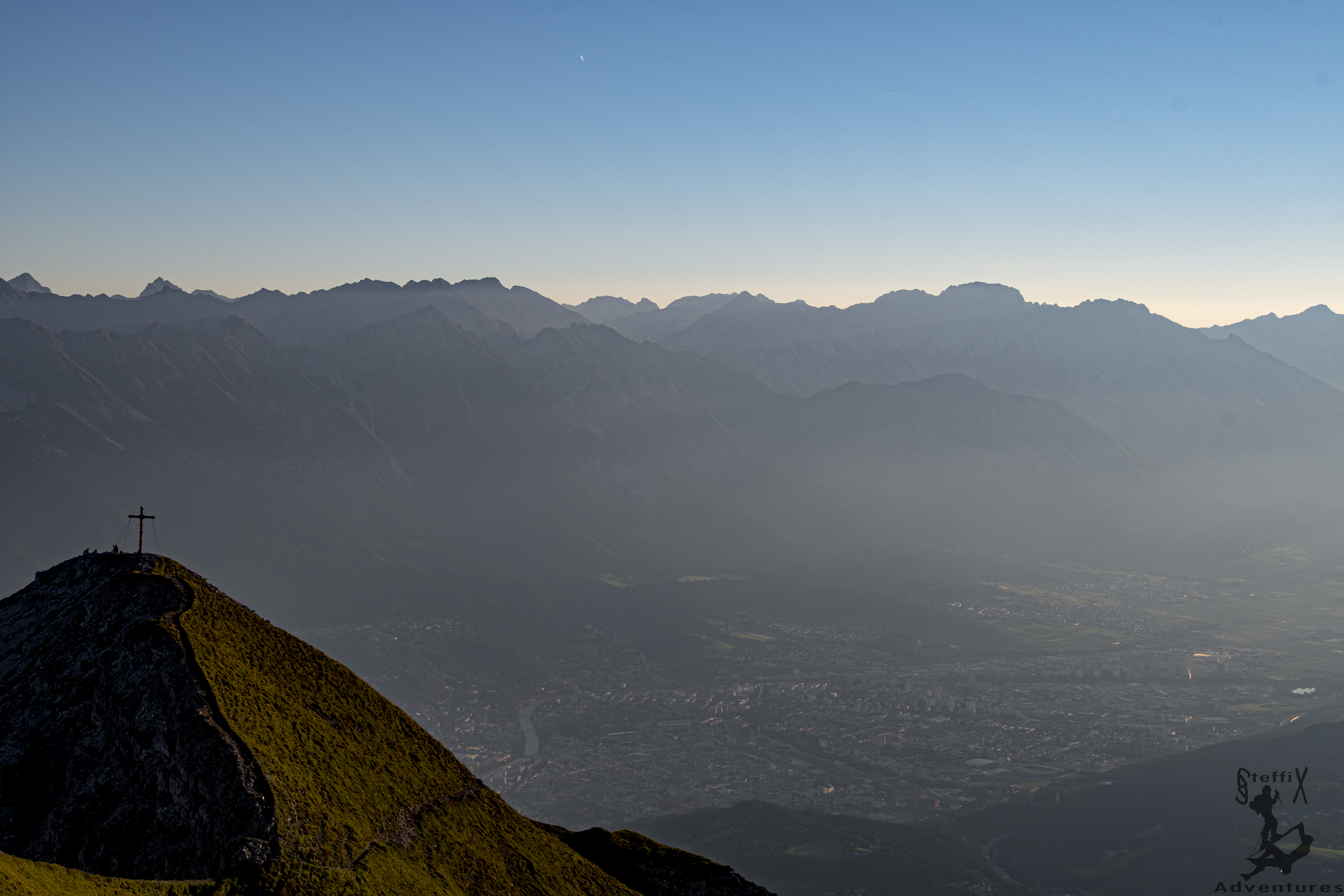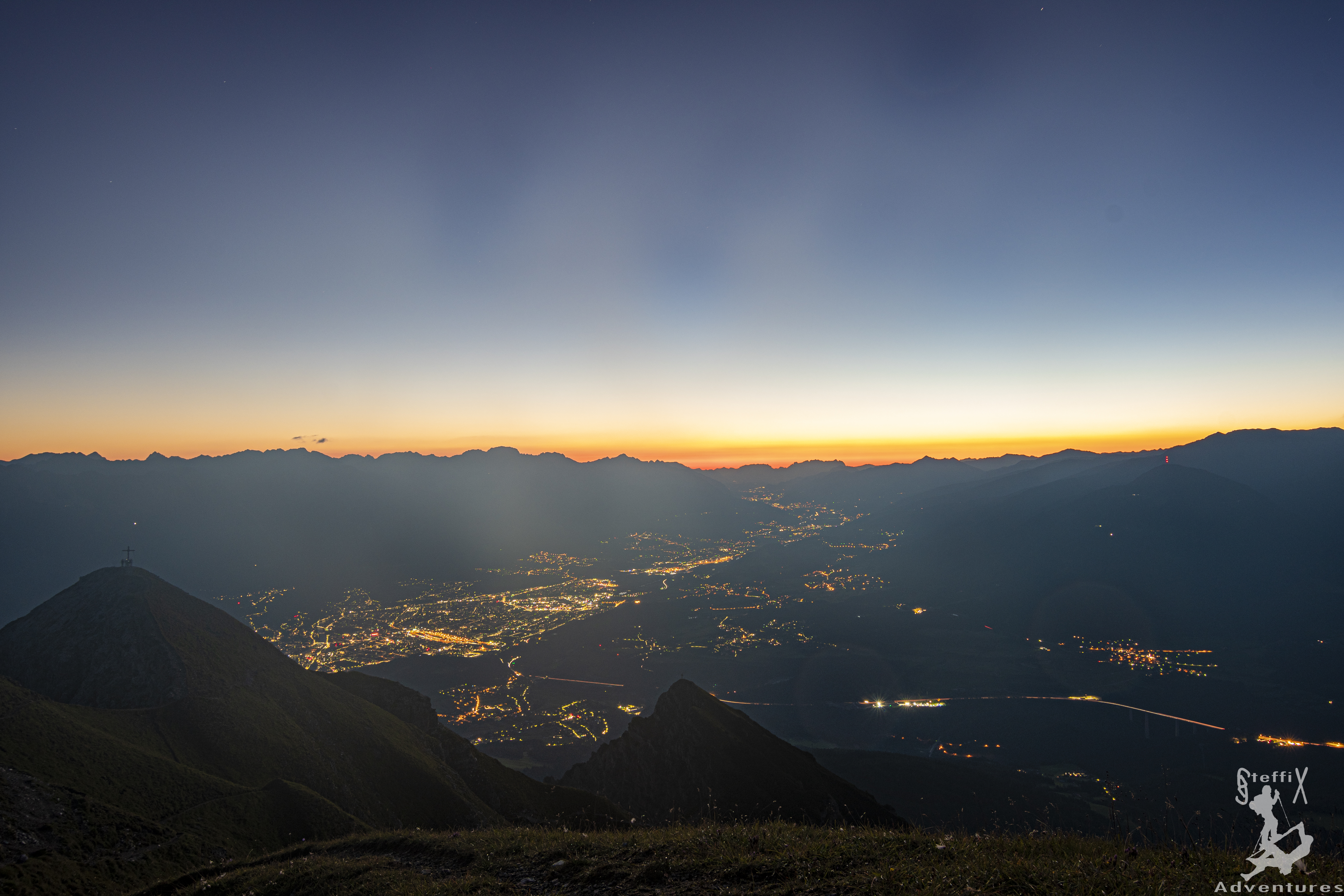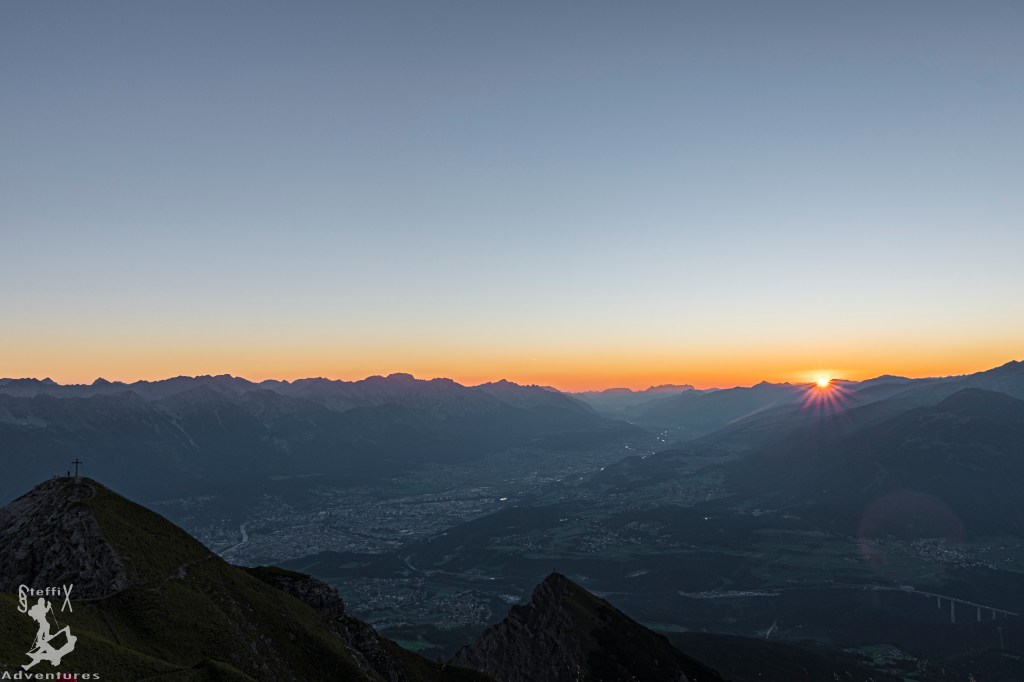 Der Aufstieg über’s Halsl bis zum Gipfel konnte fast noch ohne Stirnlampe absolviert werden. Oben angekommen begrüßten uns ein paar Gipfelstürmer, die die gleiche Idee hatten und den immer wieder atemberaubenden Blick mit uns genossen. Das Gipfelplateau ist ja zum Glück groß genug und so gab es auch für uns noch eine Mulde, die wie gemacht für unsere zwei Isomatten war, „natürlich“ mit direktem Blick ins Inntal.