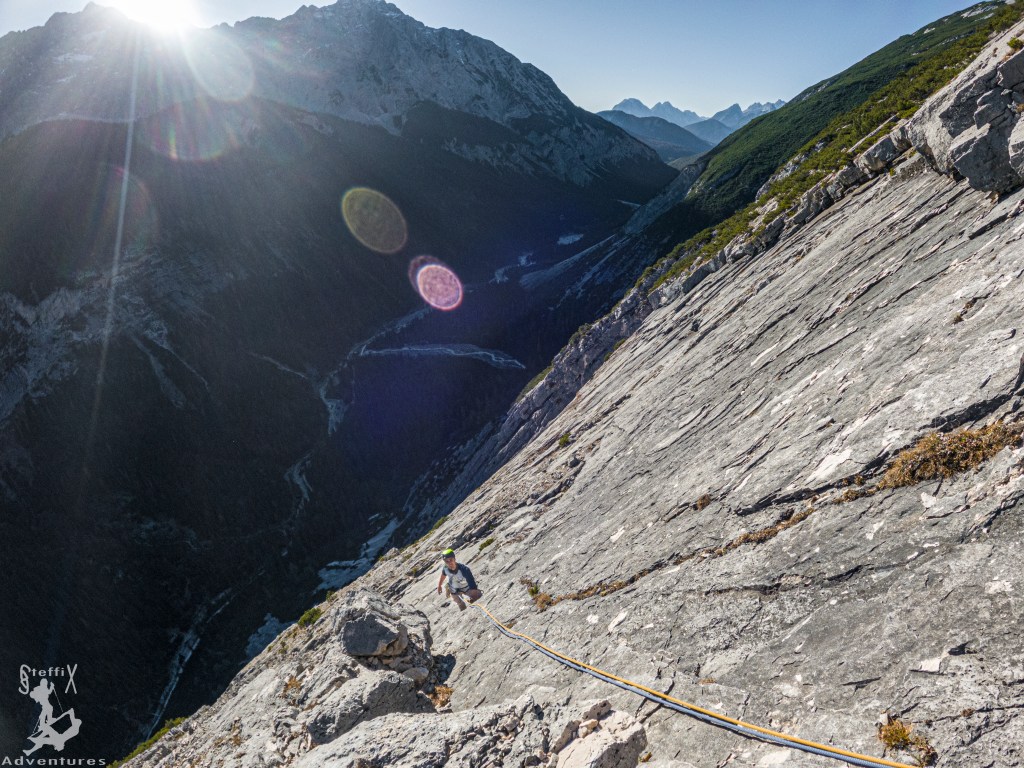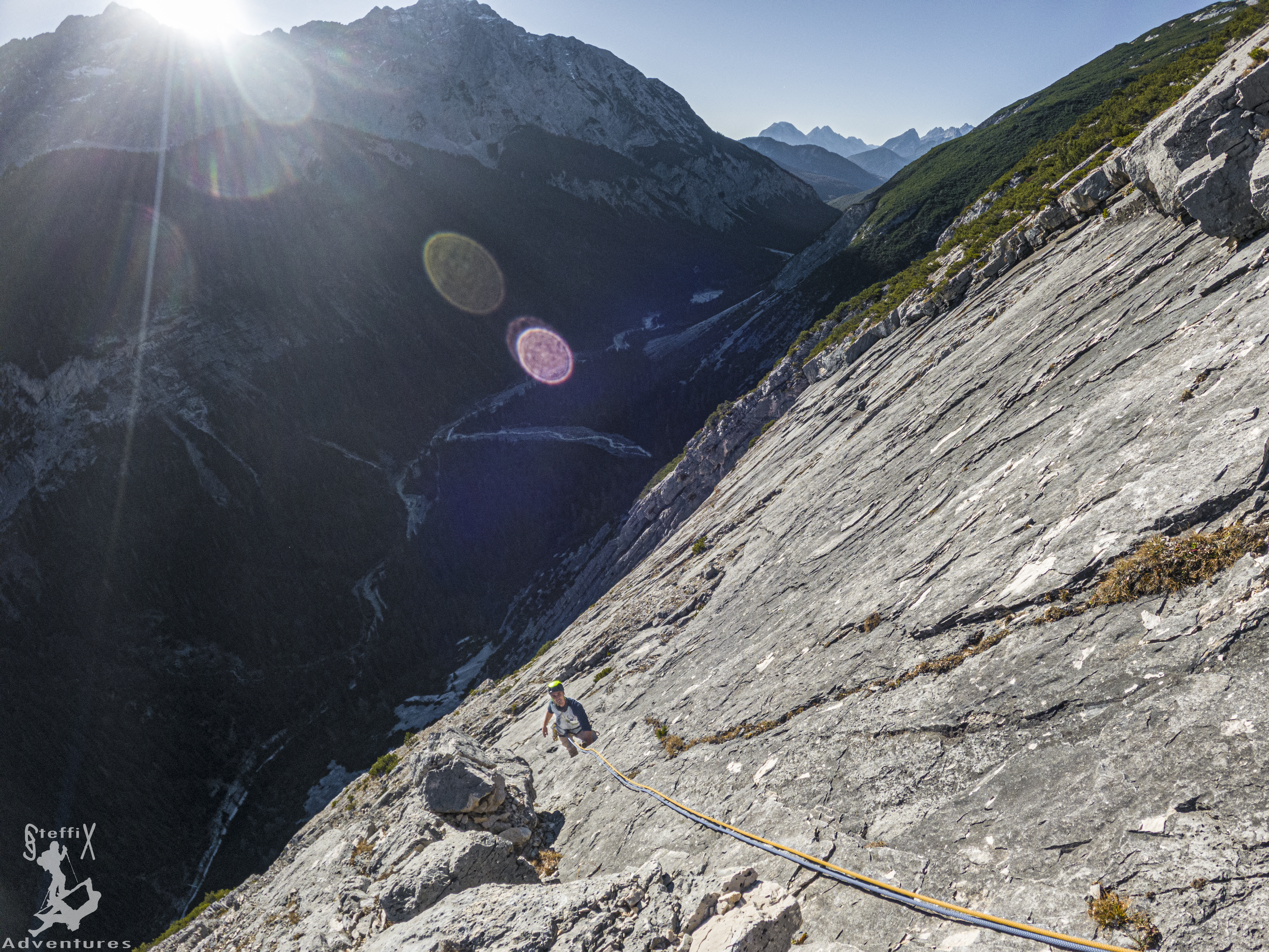SL #12: Die letzte Länge zieht nochmals etwas nach links in eine weitere Platte. Spätestens jetzt sollte aber jeden den Bogen raus haben und man kann diese letzte Länge nochmals vollends genießen, ehe es nach Eintrag ist das sehr originelle Wandbuch ans Abseilen geht. Wir kamen bei den letzten Sonnenstrahlen dieses Tages oben an und genossen die letzten warmen Strahlen.