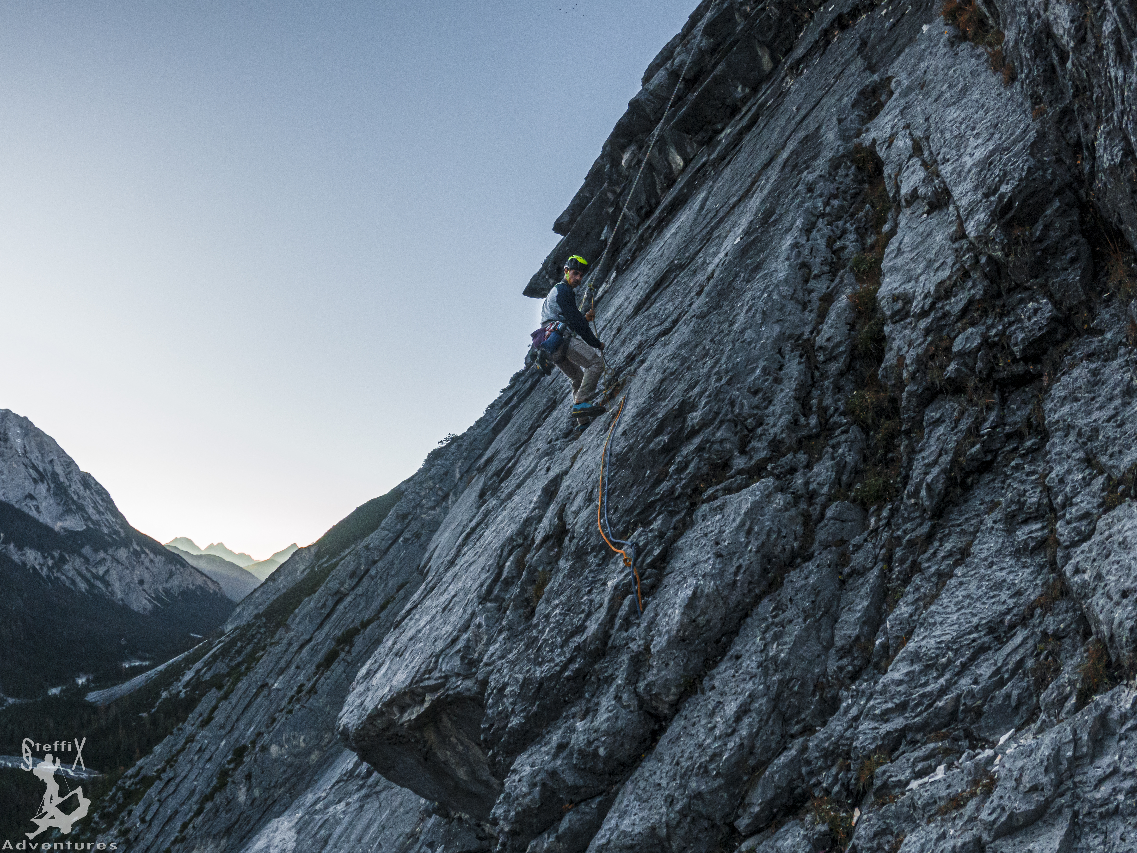 Das Abseilen geht problemlos und kann genau so gehandhabt werden wir im bergunsteigen.com Topo beschrieben. Über die oberen Platten ist es etwas mühsam, geht aber auch. Der letzte Abseiler in der unten gelegene Rinne geht sich mit 60m Doppelseil gut aus, auch wenn es von oben nicht so aussieht. Das Topo stimmt hier wirklich sehr gut! Wir kamen genau zur Dämmerung wieder unten an, holten unsere Rucksäcke am Einstieg und gingen zu den Fahrrädern. Die Isar versorgte uns mit Frischwasser, wir zogen uns warm an und fuhren dann gemütlich bis zum Auto. Was für eine grandiose Tour!