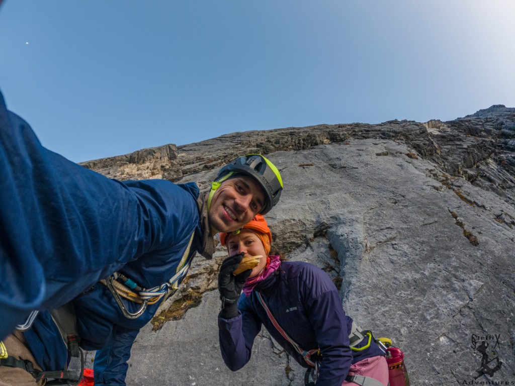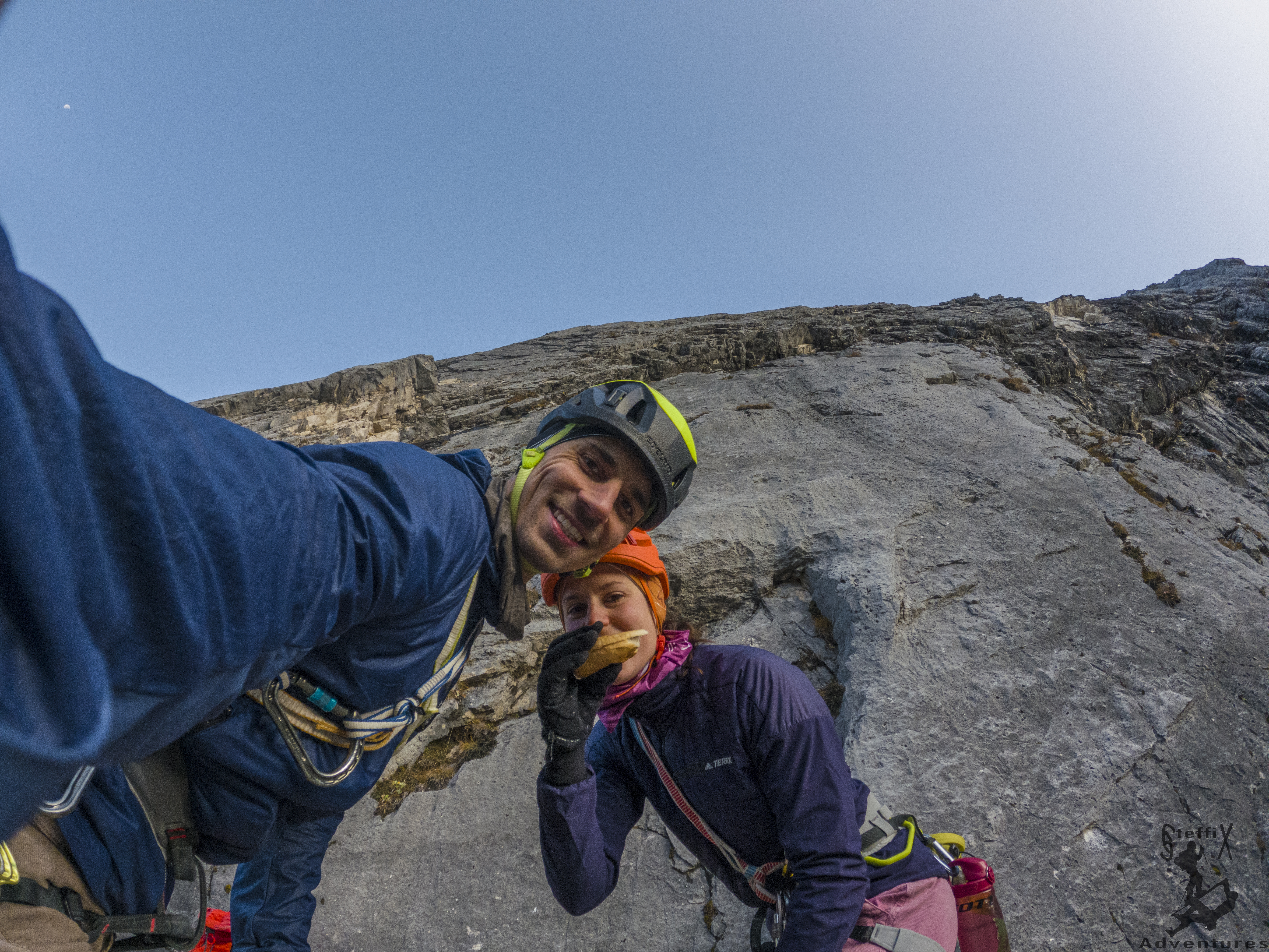 SL #1: In einem anderen Blog lasen wir etwas von einem „Kaltstart“ und das hätte an diesem Tag nicht zutreffender sein können. Die 1. Länge war für uns gleich die größte Herausforderung, besonders da wir Plattenklettern eher selten praktizieren. Mit gefühllosen Händen und Füßen aufgrund der Kälte aber umso interessanter. Der Überhang hingegen löste sich sehr gut auf und die Länge machte Lust auf mehr.