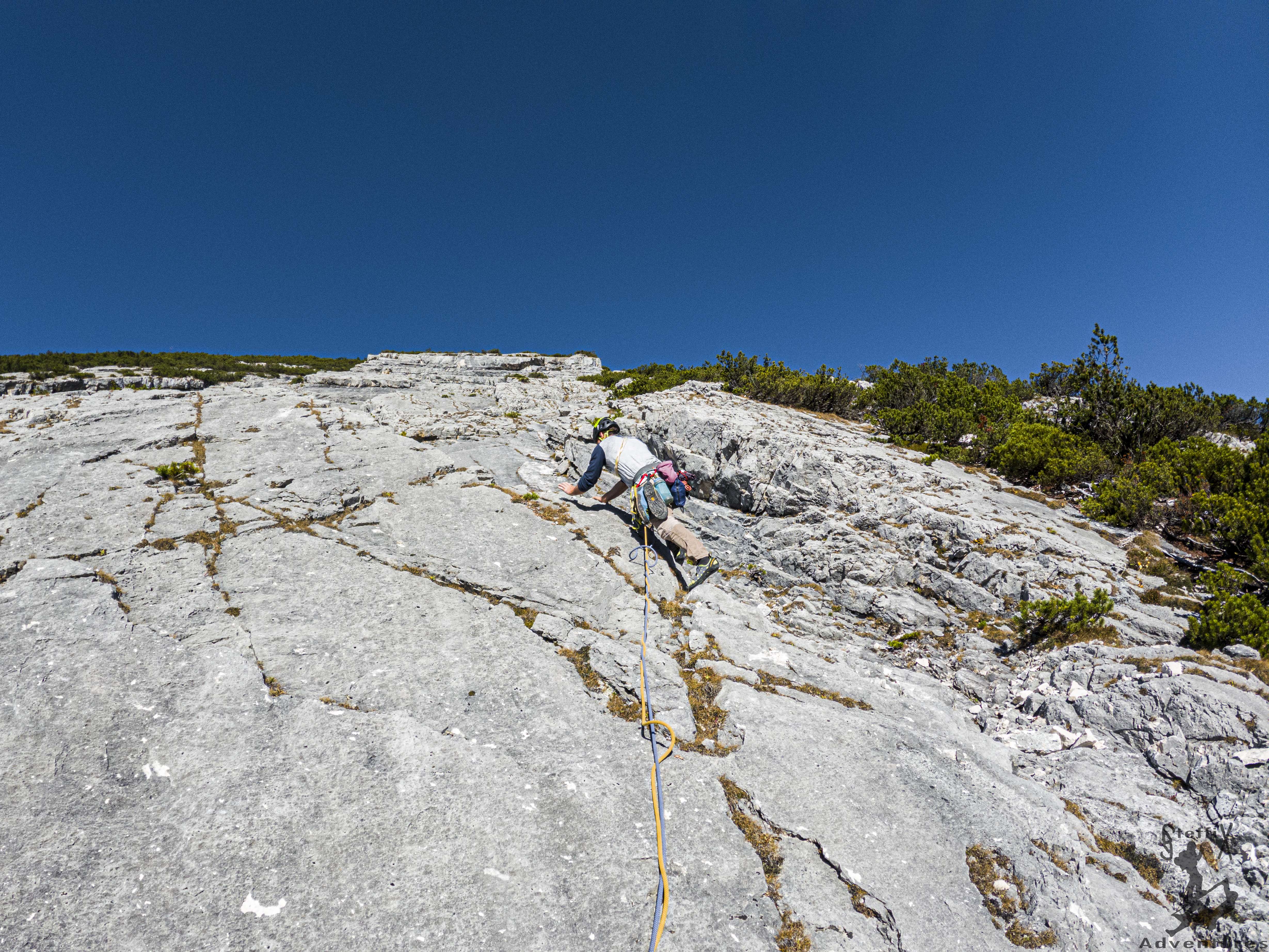 SL #2: Kurze Stelle direkt vom Stand weg etwas kniffelig, danach einfaches Gelände immer linkhaltend bis zu einer Latsche. Dort befindet sich ein Bolt, an dem wir Stand machten.