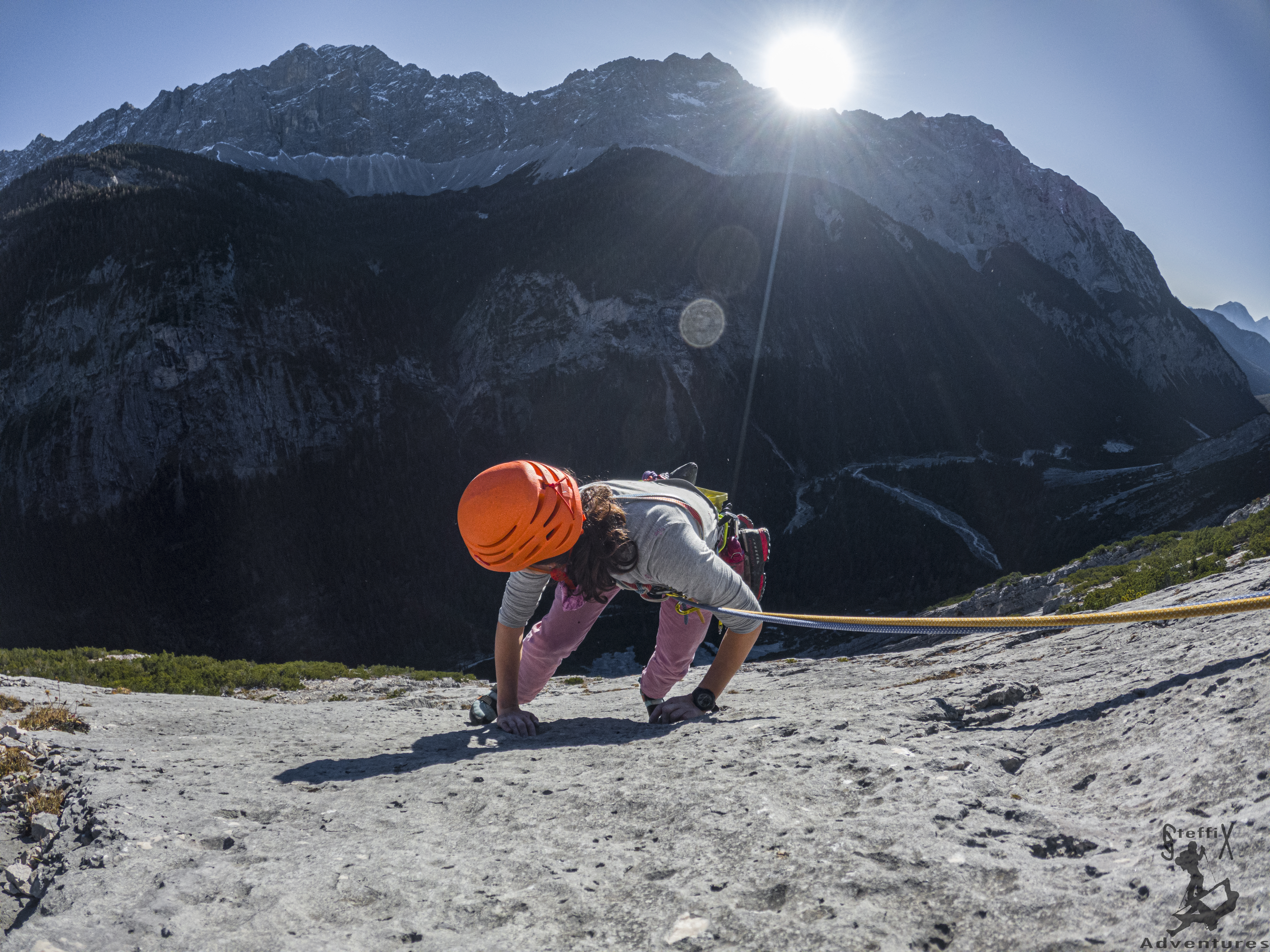 SL #5: Die wahrscheinlich fordernste Länge, da die Schwierigkeit sehr anhaltend ist, zieht die sich nach oben erstreckende Rinne entlang und fordert von Platten-, über Verschneidungs- und Piaz-Klettern einiges an Bewegungstalent ab. Geniale Länge!