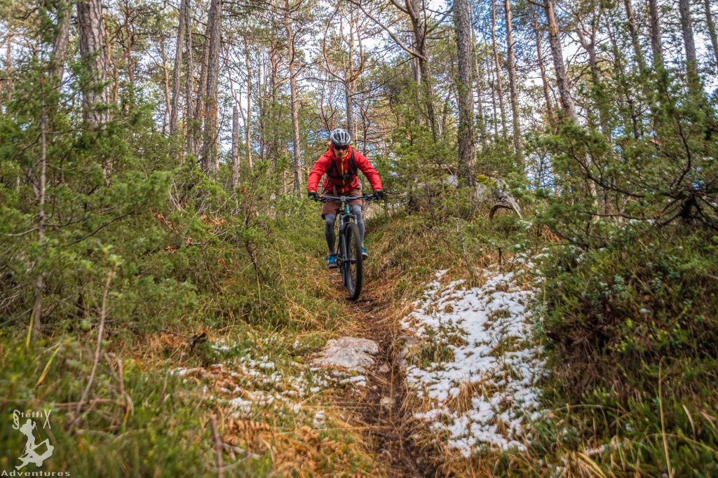 Mal wieder war ein Tag Martinswand mehr als ausreichend, dass die Finger komplett kaputt waren und so waren wir froh, dass am nächsten Tag Biken am Weg stand. Der Sonntag stand also unter dem Zeichen: Sonne genießen (zum Glück haben wir uns für die Südseite entschieden😊), etwas schnaufen, erstes Mal Schneefelder biken und das alles mit netter Begleitung. Die Tourenwahl war an diesem Tag perfekt, nette Forstwege gepaart mit flowigen Trails, die auch uns Anfängern Spaß bereiteten – danke Pati für’s hervorragende guiden.