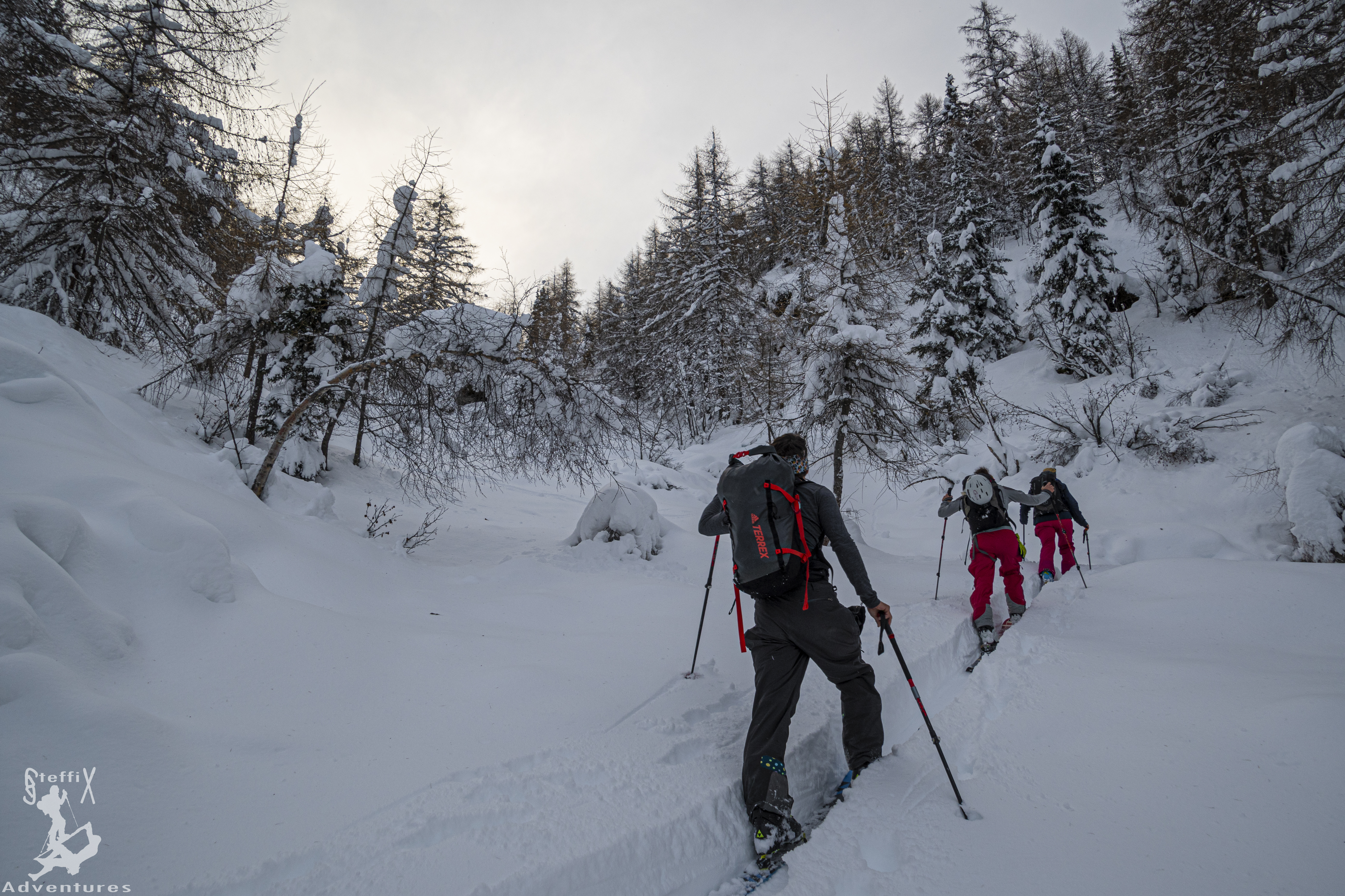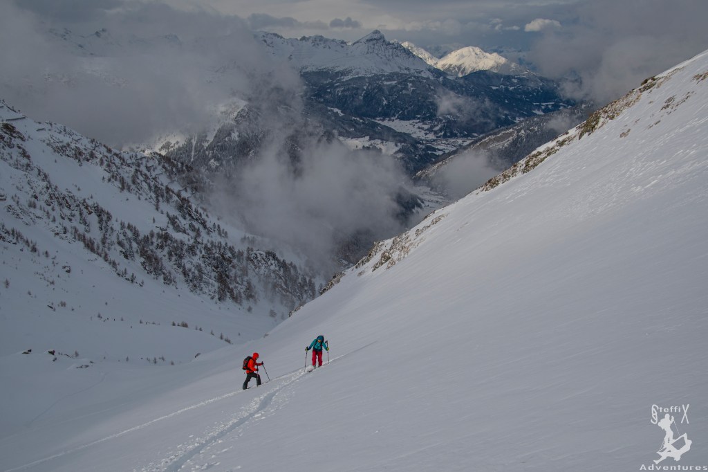Letztes Wochenende noch in der Sonne die Geierwand emporgeklettert, musste die Skitourensaison 2020 noch eröffnet werden. Nach den ergiebigen Schneefällen Anfang Dezember konnte es nun auch endlich losgehen. Nur wohin? Der Schnee fiel leider mit gleichzeitig starkem Wind und die Lawinensituation war regional sehr angespannt. Wir entschieden uns zusammen mit July und Hannes auf den Silleskogel im Valsertal zu gehen, da wir alle den Gipfel von bereits gemachten Touren kannten und er eine gute Beurteilung zulässt. Zudem ist er zu keinem Zeitpunkt gefährlich steil. Um 8:00 Uhr starteten wir aus Innsbruck in Richtung Brenner, fuhren bei Gries ab und weiter nach St. Jodok am Brenner und von dort ins Valsertal. Wir hatten schon Angst keinen Parkplatz zu bekommen, da Feiertag in Österreich war und einigermaßen gutes Wetter angesagt war. Wir waren das 3. Auto am Parkplatz und es blieb glücklicherweise auch relativ ruhig an diesem Tag. Es deutete sich sogar an, dass wir stellenweise spuren müssen, womit wir absolut nicht gerechnet haben. Beschwert haben wir uns aber auch nicht. Danke an dieser Stelle auch an die beiden Jungs, die fast die gesamte Zeit spurten.