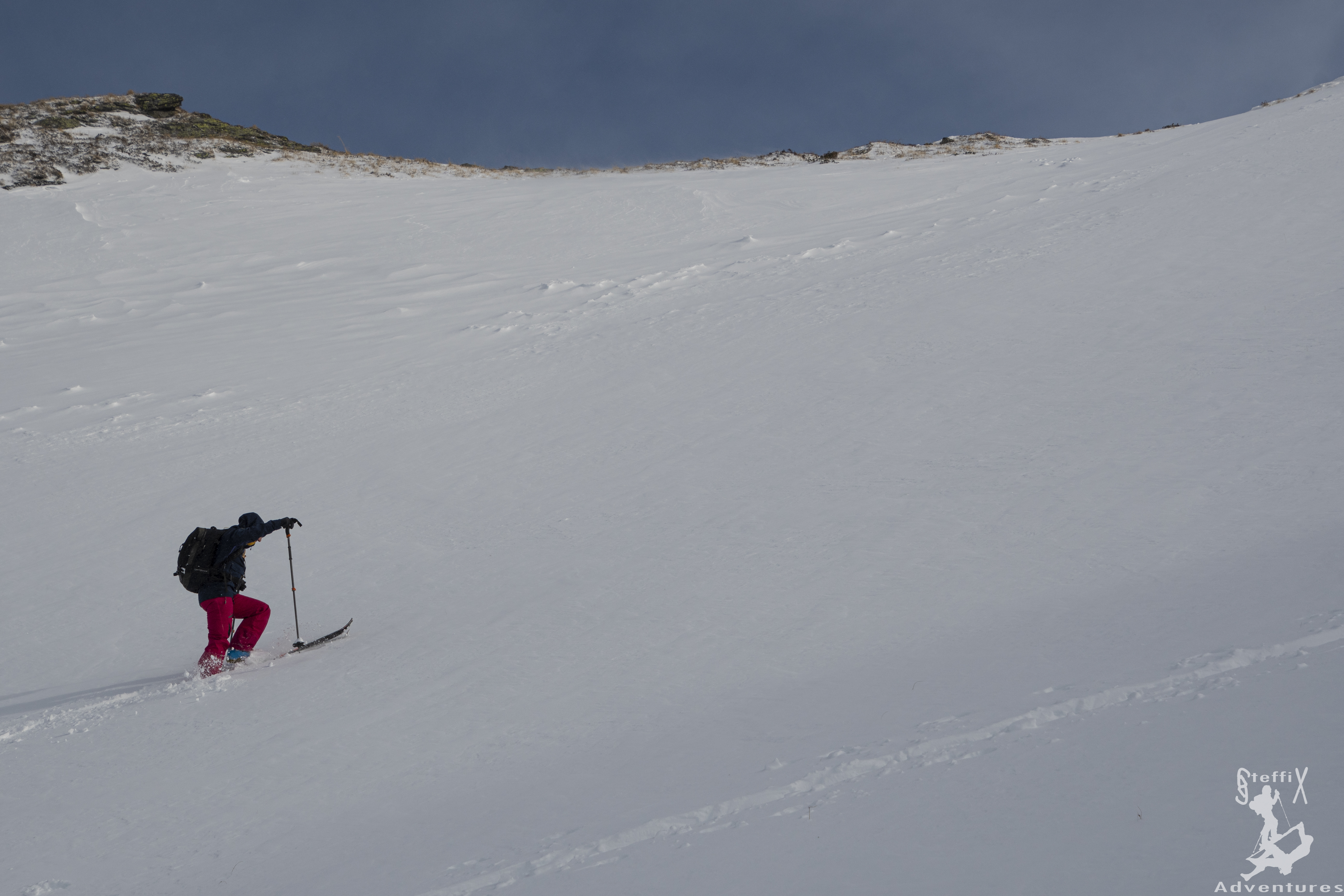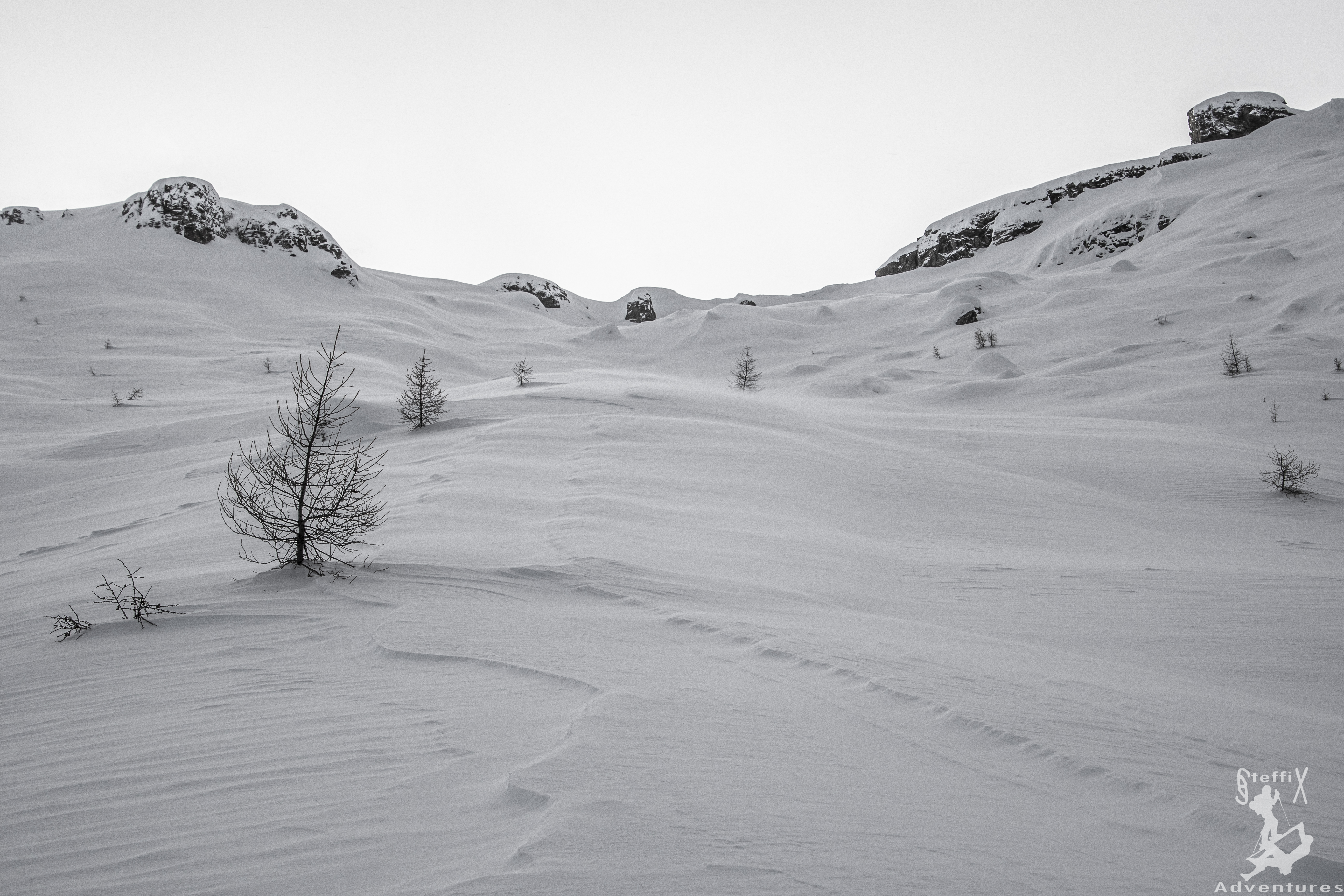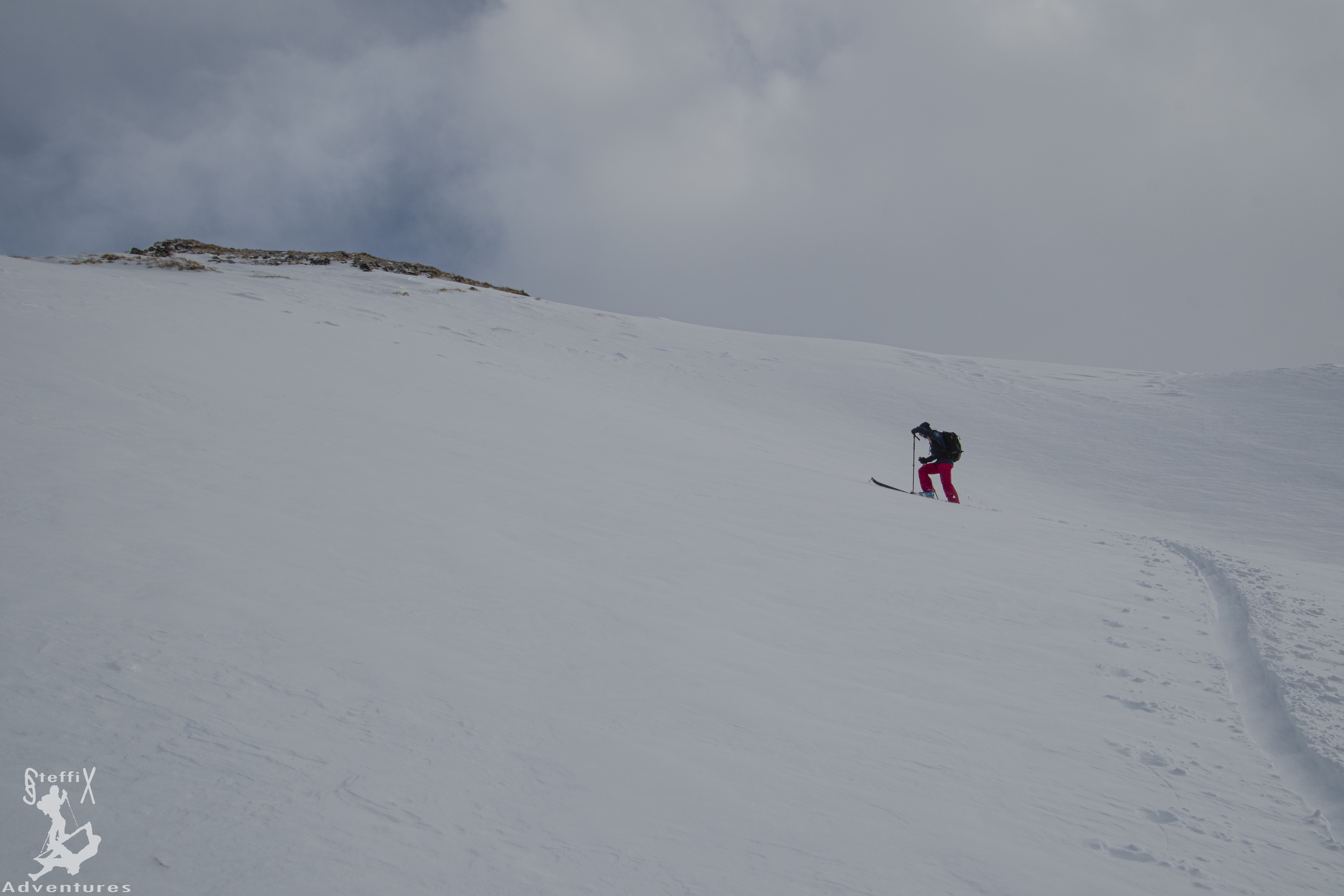 So ging es den Forstweg in angenehmer Steigung in Richtung Sillalm und dann durch den engen Graben empor zum großen Kessel der Roßgrube. Die Schneequalität sorgte bereits für einen Grinser im Gesicht und die Vorfreude auf die Abfahrt wuchs stetig. Selbst der oben doch recht kräftig wehende Wind trübte die gute Stimmung nicht. Bei der Spurenwahl waren wir jedoch sehr konservativ, da sich doch einige Triebschneepakete durch den vielen Wind gebildet hatten. Gut, dass wir heute nicht steiler unterwegs waren.