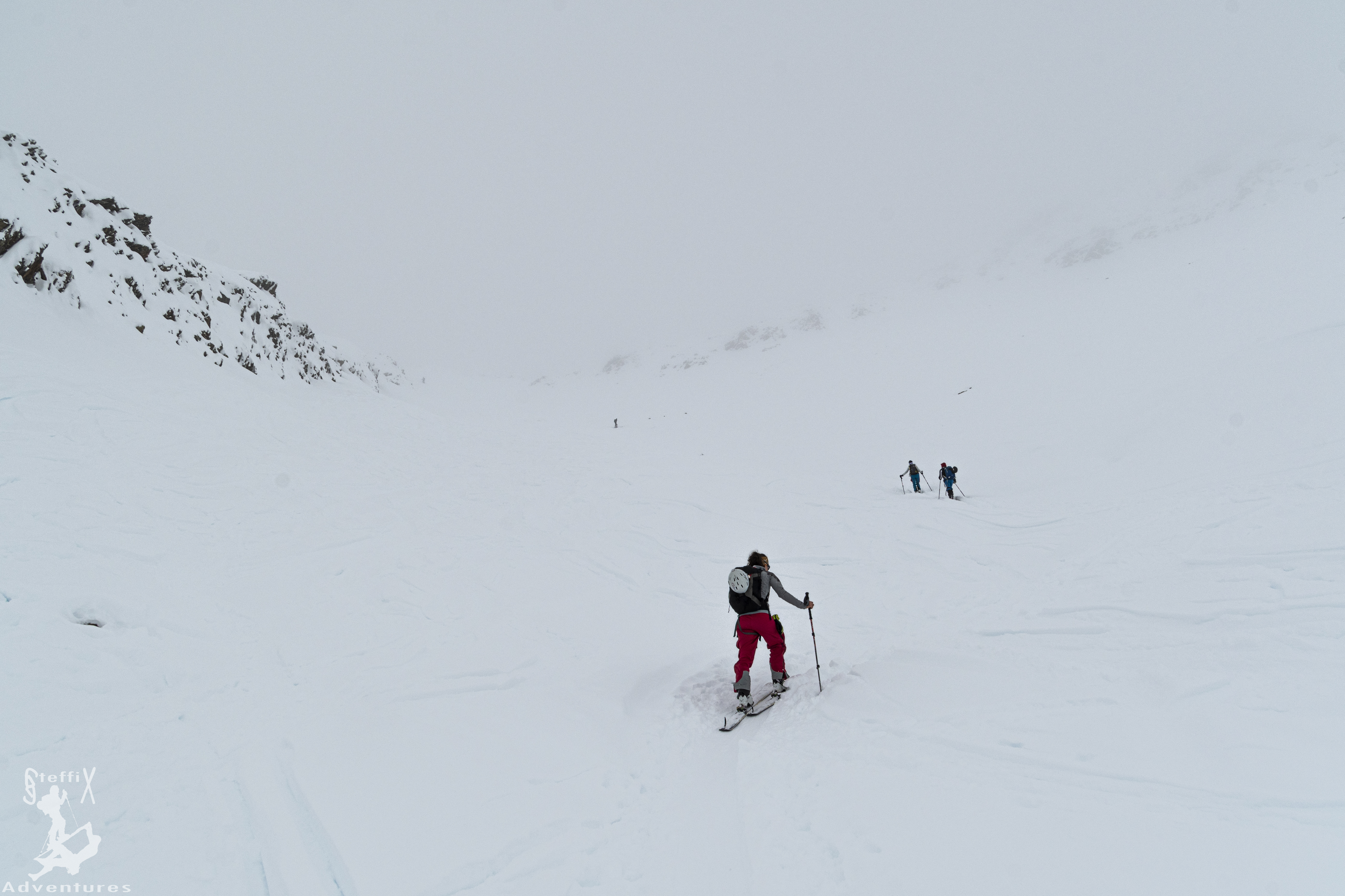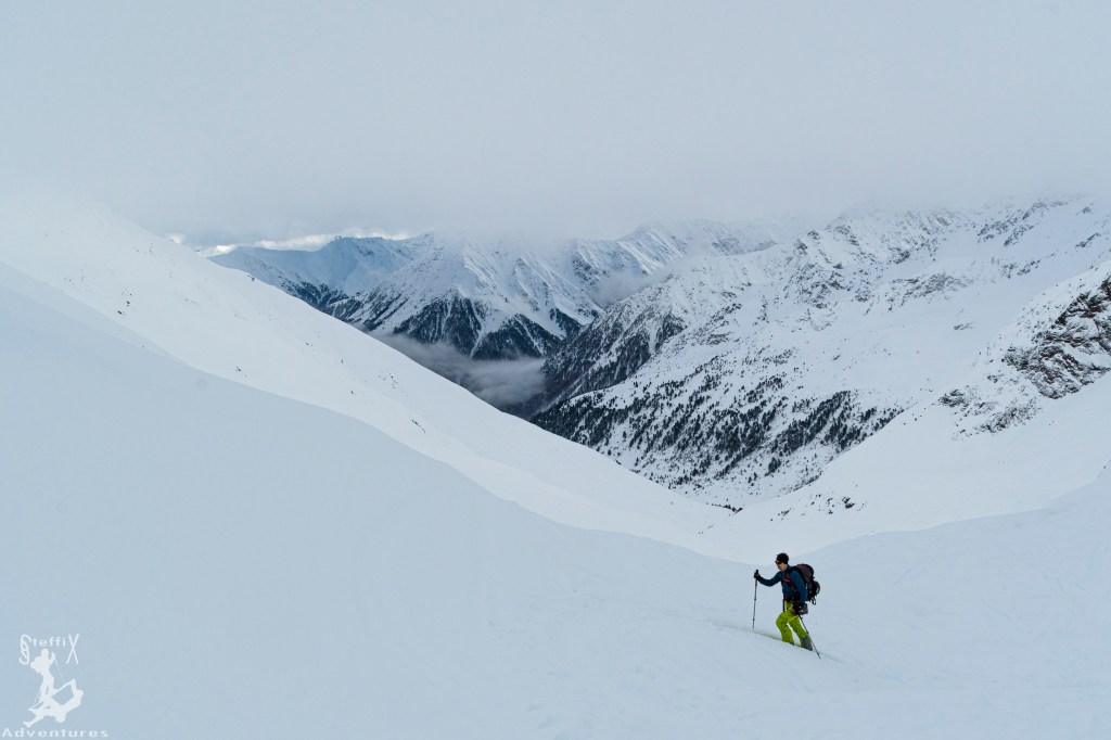Am Sonntag hieß es vom Wetterfrosch, dass es erst gegen Nachmittag Risse in der Wolkendecke geben soll. Perfekt, das bedeutete Ausschlafen 😊 Nach gemütlichem Frühstück und Tourenplanung bei der zweiten Tasse Kaffee, fuhren wir wieder ins Sellrain, dieses Mal ohne Begleitung – vorerst. Ziel für heute war der Mitterzaigerkopf (Mitterzaigerkogel), da häufig begangen, gut einsehbar und dementsprechend auch lawinentechnisch problemlos für den heutigen Tag. Vom Parkplatz zwischen Sankt Sigmund und Kühtai ging es am Klammbach entlang in nordwestliche Richtung leicht steil aufwärts.