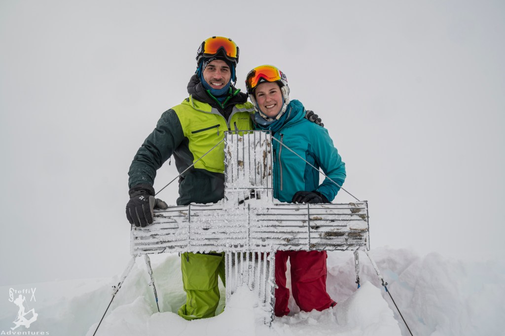 Das Wetter versprach leider noch keine Besserung, aber „die Hoffnung stirbt zuletzt“ dachten wir uns. Durch die Grünbödele ging es langsam steiler werdend hinauf und bald erreichten wir das Kreuzjoch. Sicht nach wie vor leider gegen Null tendierend. Hier lernten wir Anne-Lise, Maria und Bernhard kennen, mit denen wir dann noch zusammen über den einfachen Grat in südwestliche Richtung zum Gipfel des Mitterzaigerkopf aufstiegen. Das Kreuz auf dem Gipfel lässt einiges an Spekulationen zu: Hat es wirklich so viel Schnee? 😉