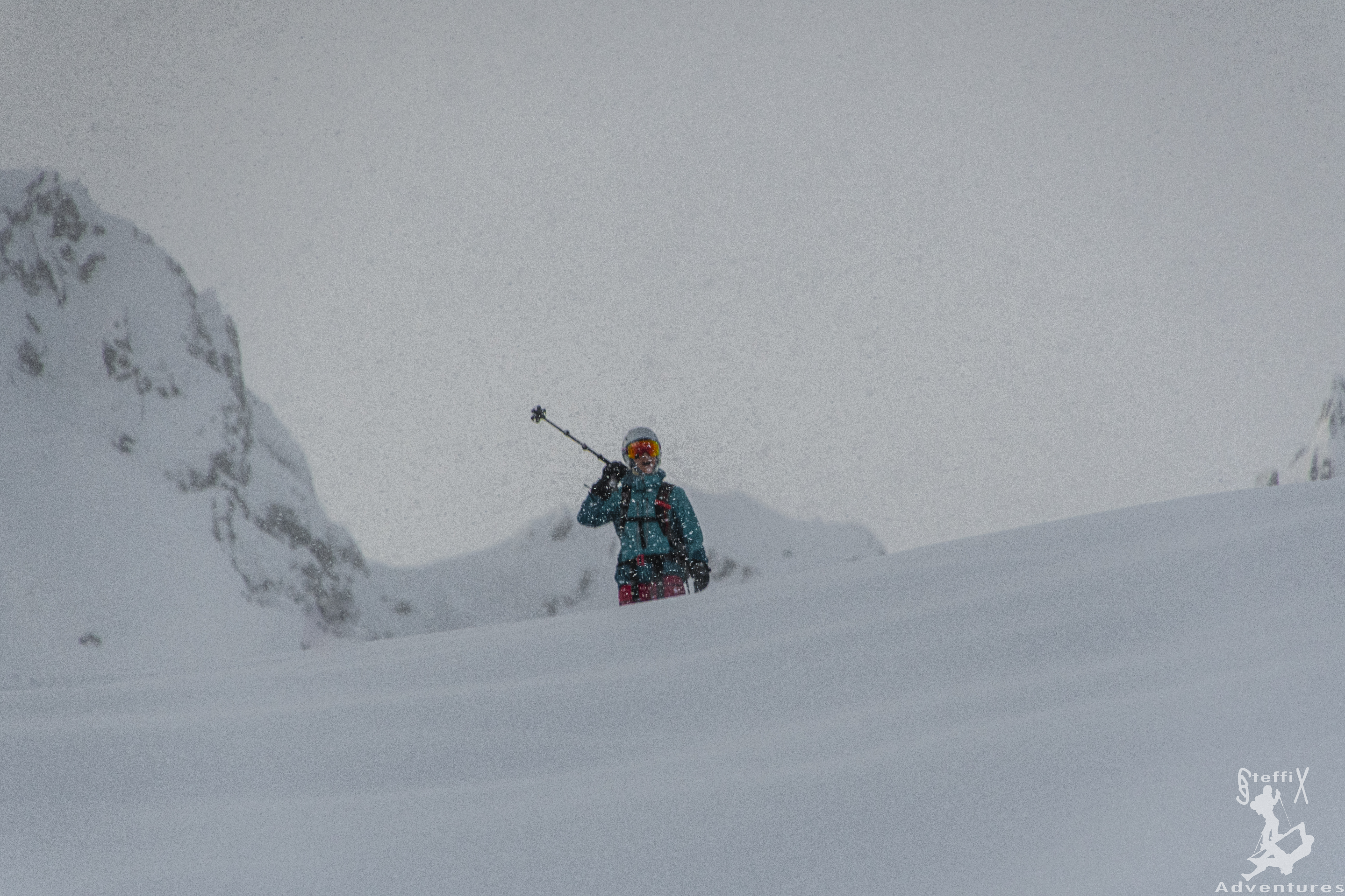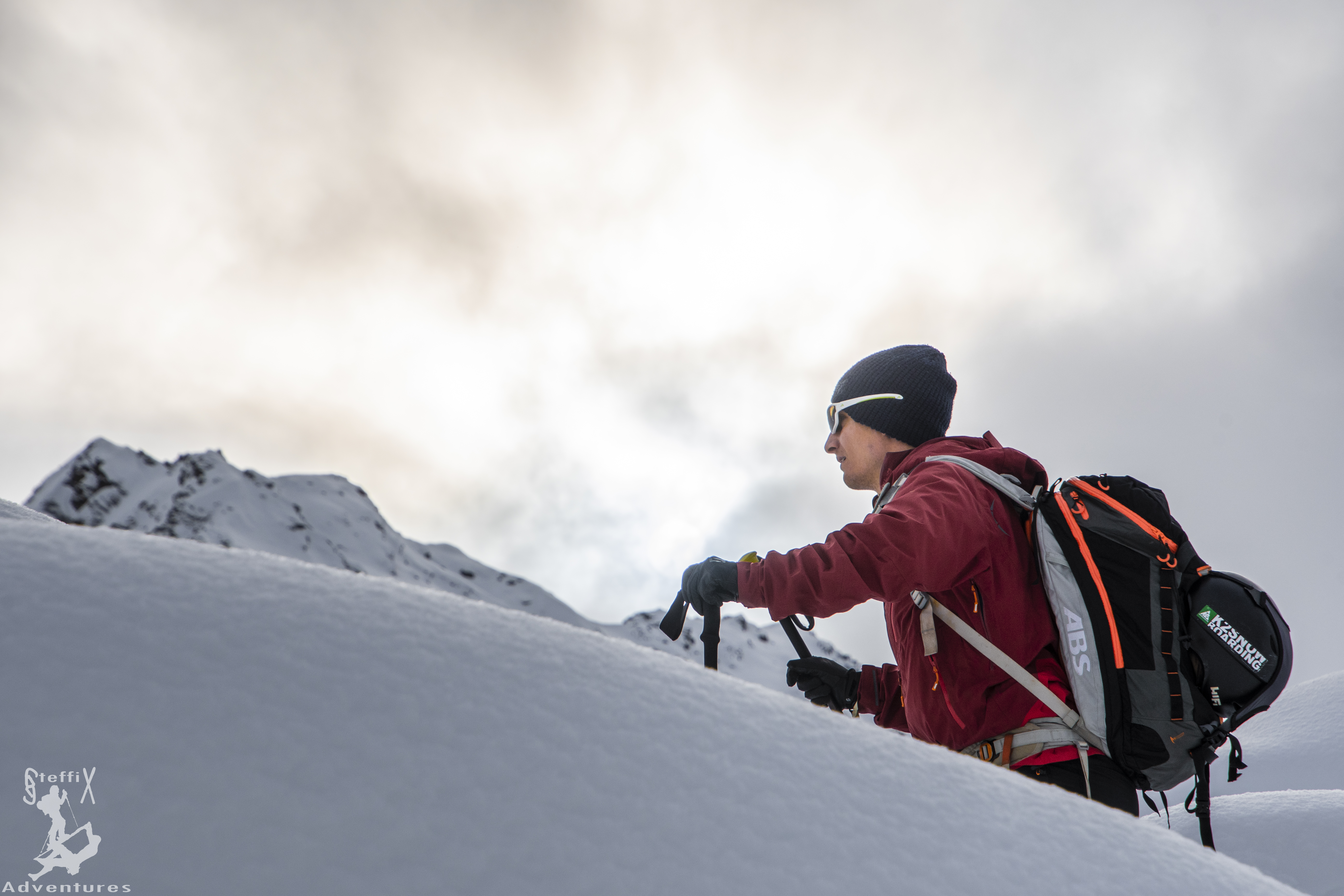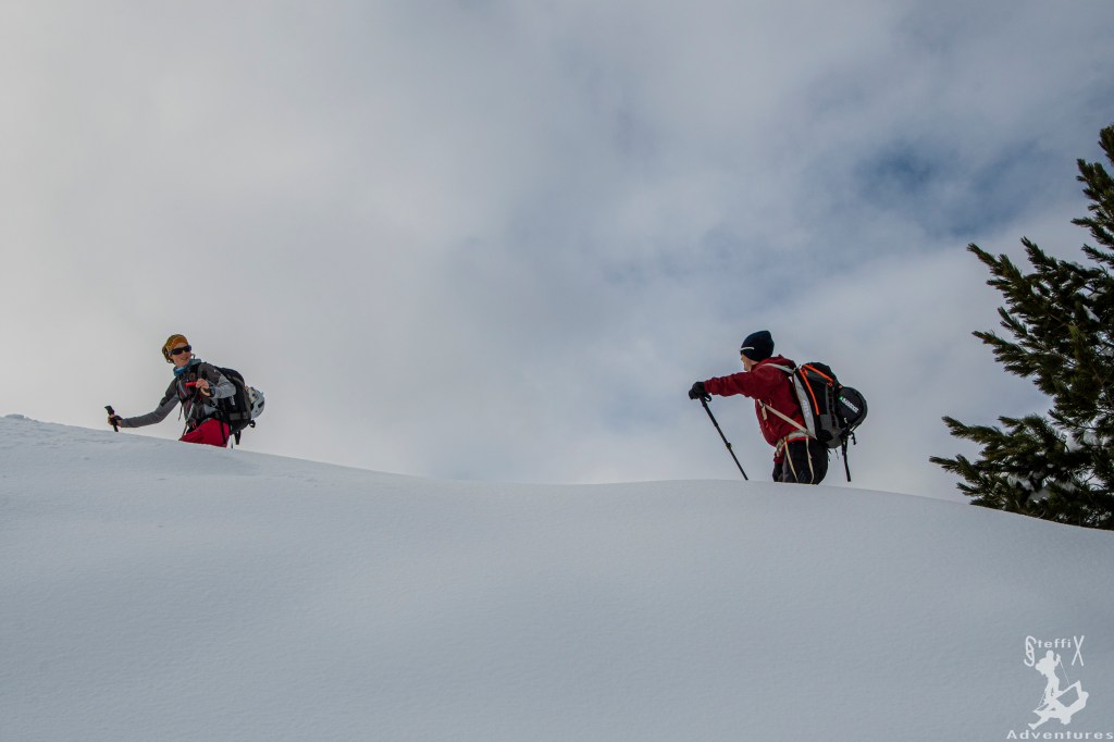 Durch formschön eingeschneite Blockfelder zogen wir weiter und wir tendierten mehr und mehr dazu, nicht auf das Wetterkreuz selbst zu gehen, sondern den kleinen Gupf nördlich davon anzupeilen. Zum einen war dort wesentlich weniger los und zum anderen kannten alle den Gipfel des Wetterkreuzes schon. Warum also nicht mal etwas anderes sehen. Zudem wies er weniger Spuren auf und wir hofften dort noch schöne Linien zu finden, da der Gipfelhang des Wetterkreuzes bereits sehr zerfahren war. Wir fellten also ab, fuhren ein paar Höhenmeter in den Oberen Boden ab und fellten wieder auf. Wir stiegen über den breiten Rücken den Spuren folgend hinauf und machten ungefähr 100 Höhenmeter unter dem Gipfelgrat halt, wo auch die bereits vorhandenen Spuren endeten.