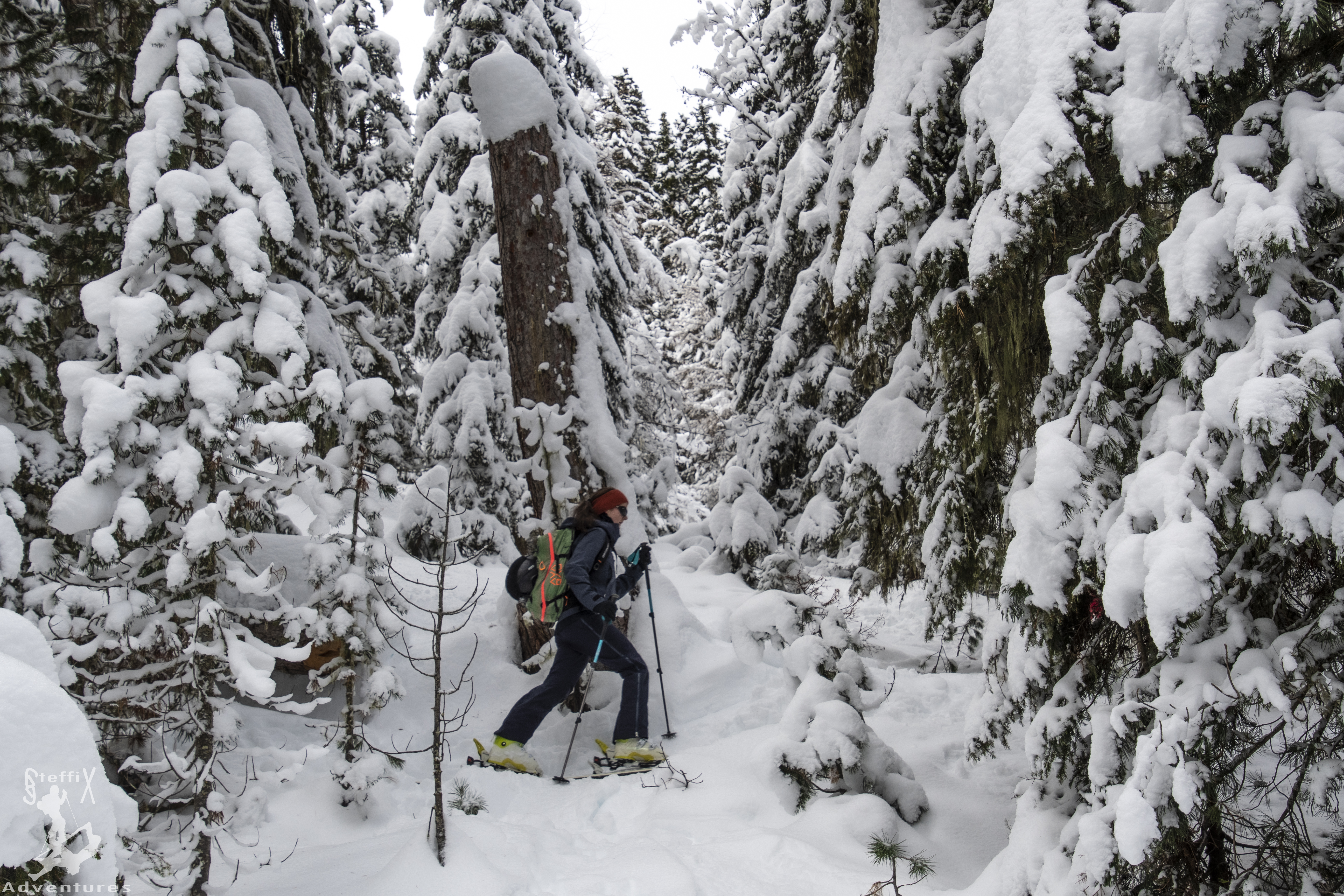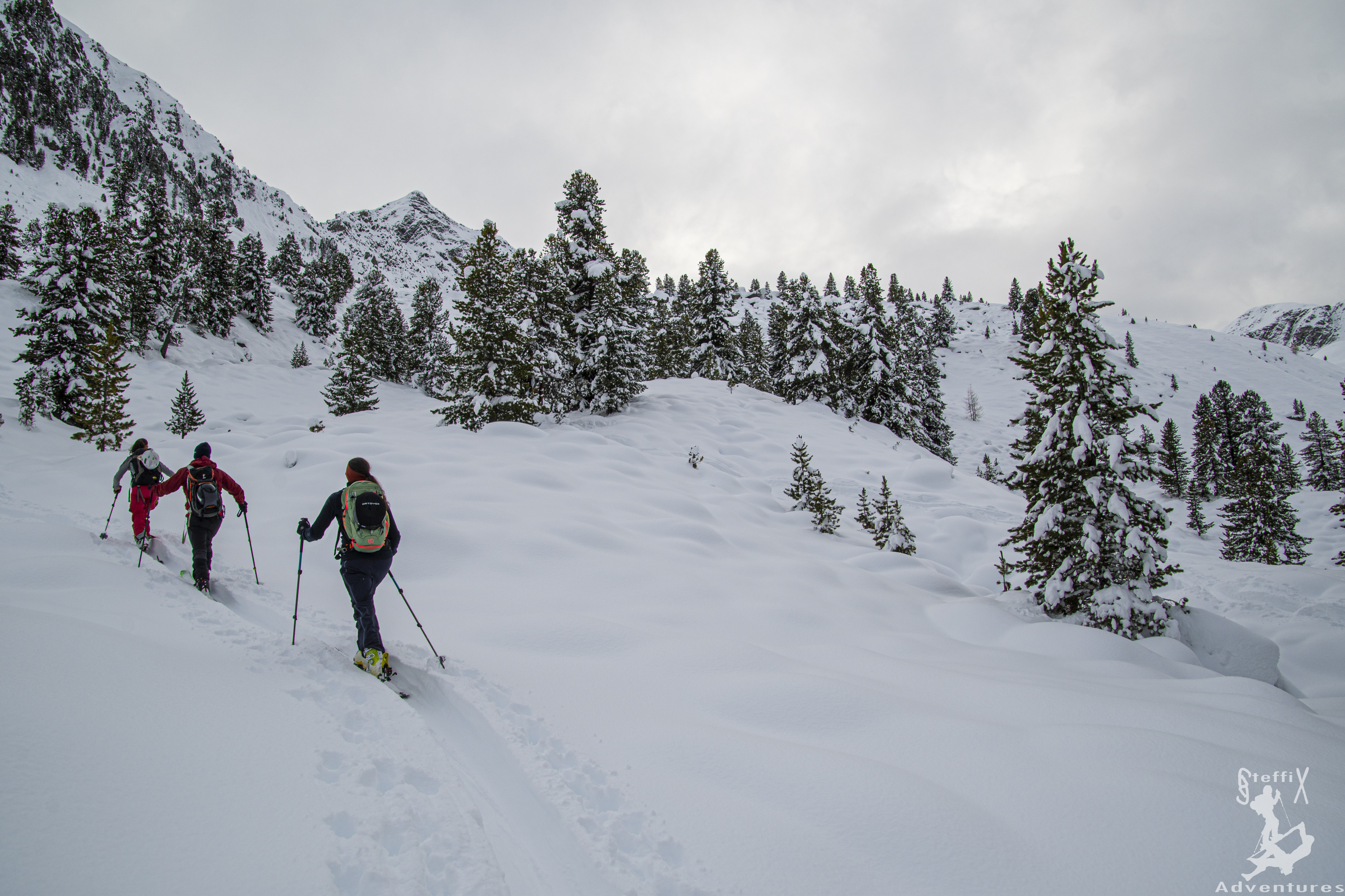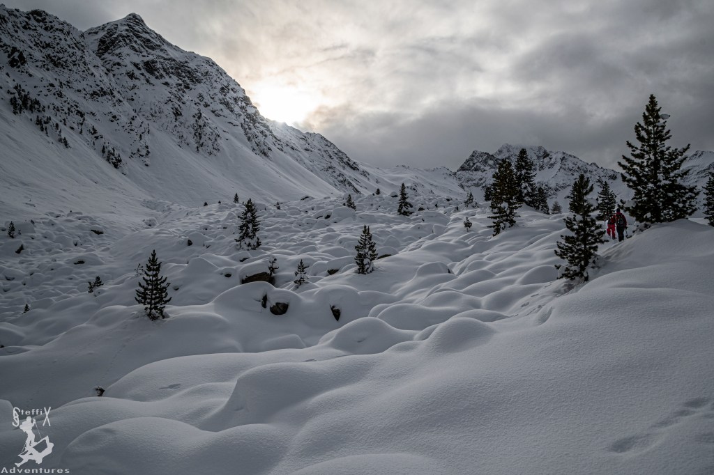 Um das vorweihnachtliche Schneegeschenk noch auszunutzen, standen dieses Wochenende trotz unsicherer Wetterprognosen wieder Skitouren auf dem Programm. Dieses Mal ging es ins Sellrain, da es auch hier für die Zeit vor Weihnachten untypisch viel Niederschlag gegeben hat. Zusammen mit Bella und Felix machten wir uns auf den Weg, das Ziel sollte ein Gipfel werden, den wir alle bereits kannten: Das Wetterkreuz. Dadurch, dass wir die Tour bereits kannten, wollten wir uns zum einen die Beurteilung der Lage vor Ort vereinfachen und zum anderen wussten wir, dass die Tour bei guter Spurwahl nur wenig lawinengefährdet ist. Bereits im unteren Waldstück offenbarten sich die Schneemengen und die eingeschneiten Bäume sorgten für ein wahres „Winterwonderland“. Entspannt ging es durch den Wald, bis wir den offenen Bereich der Unteren Böden erreichten.