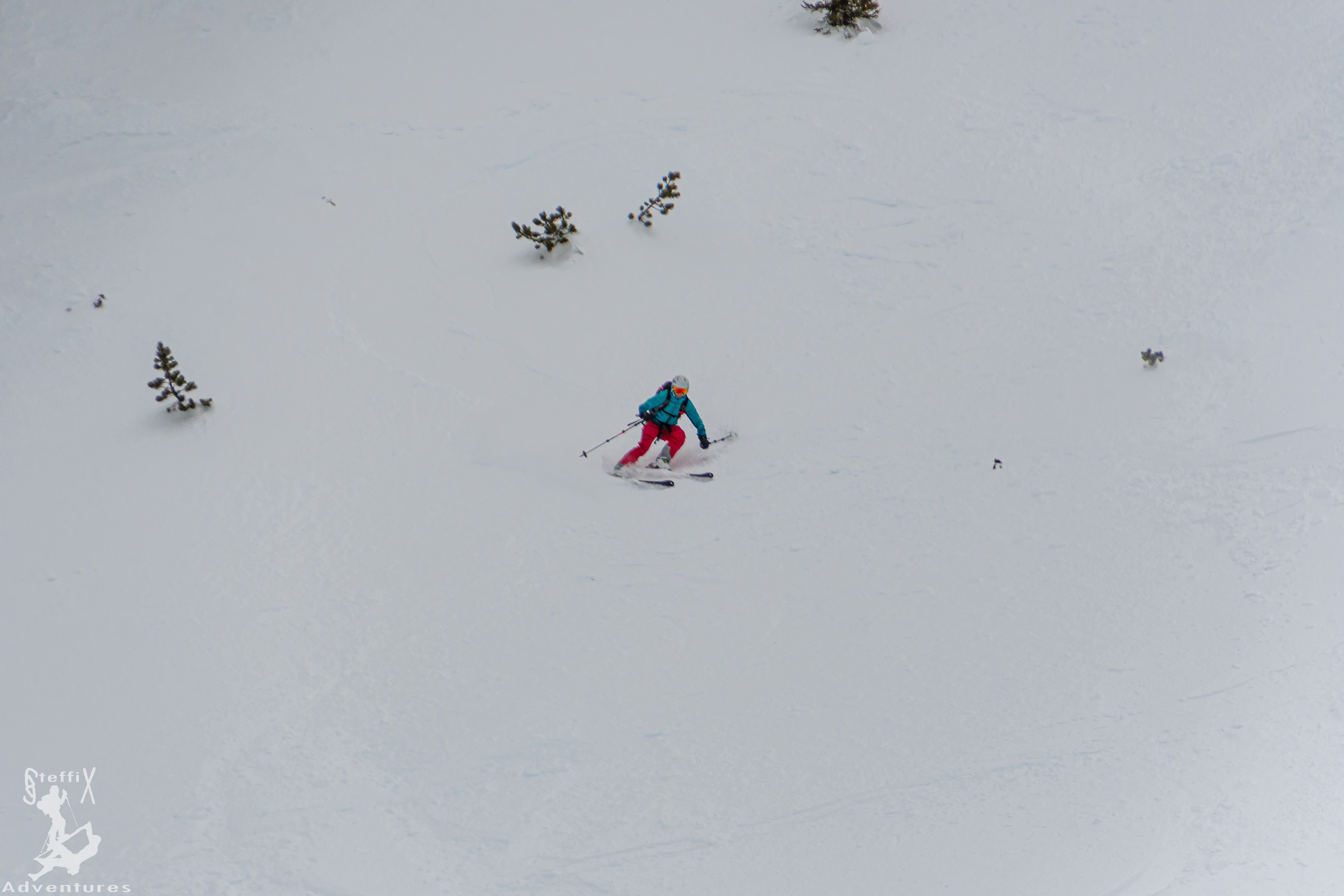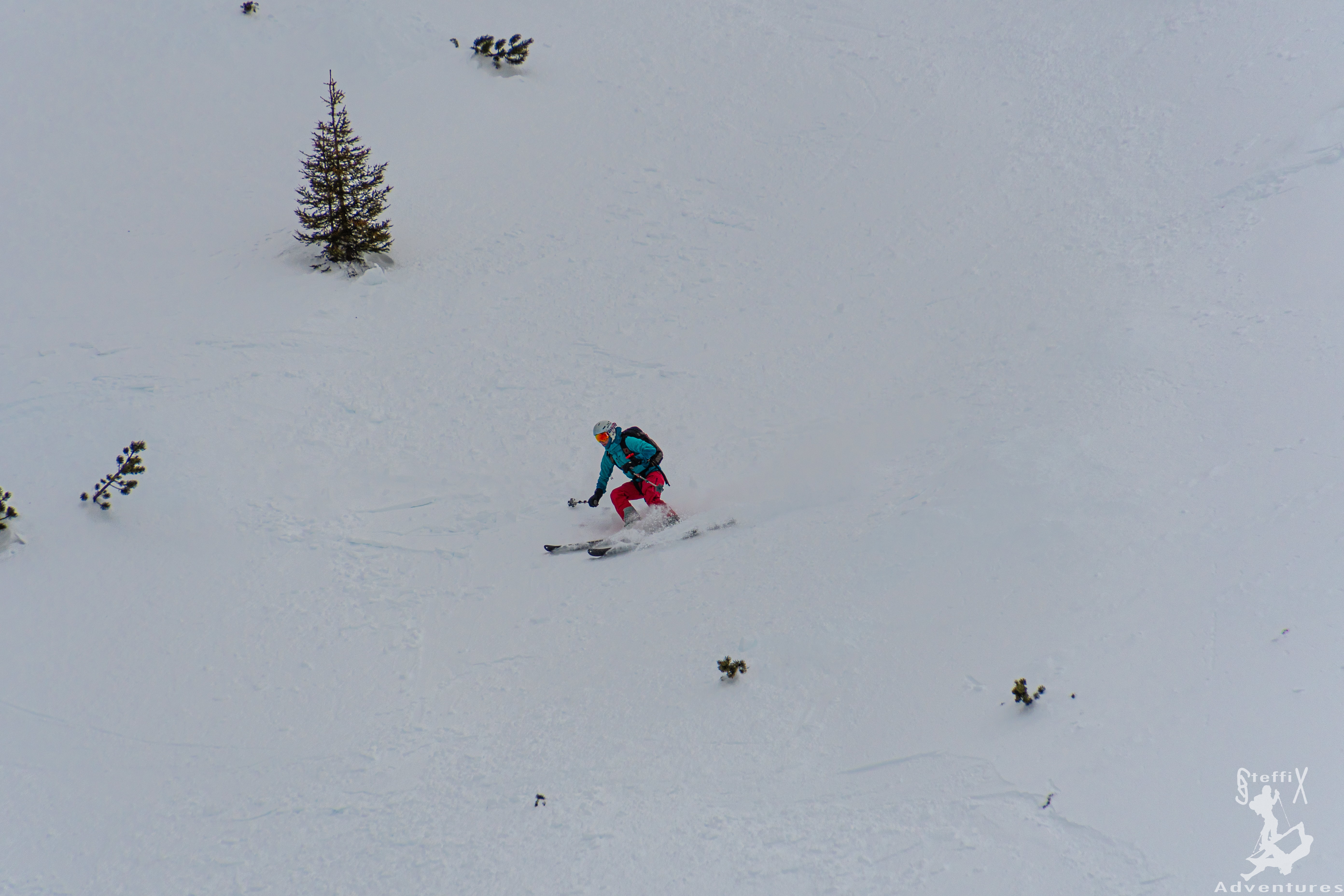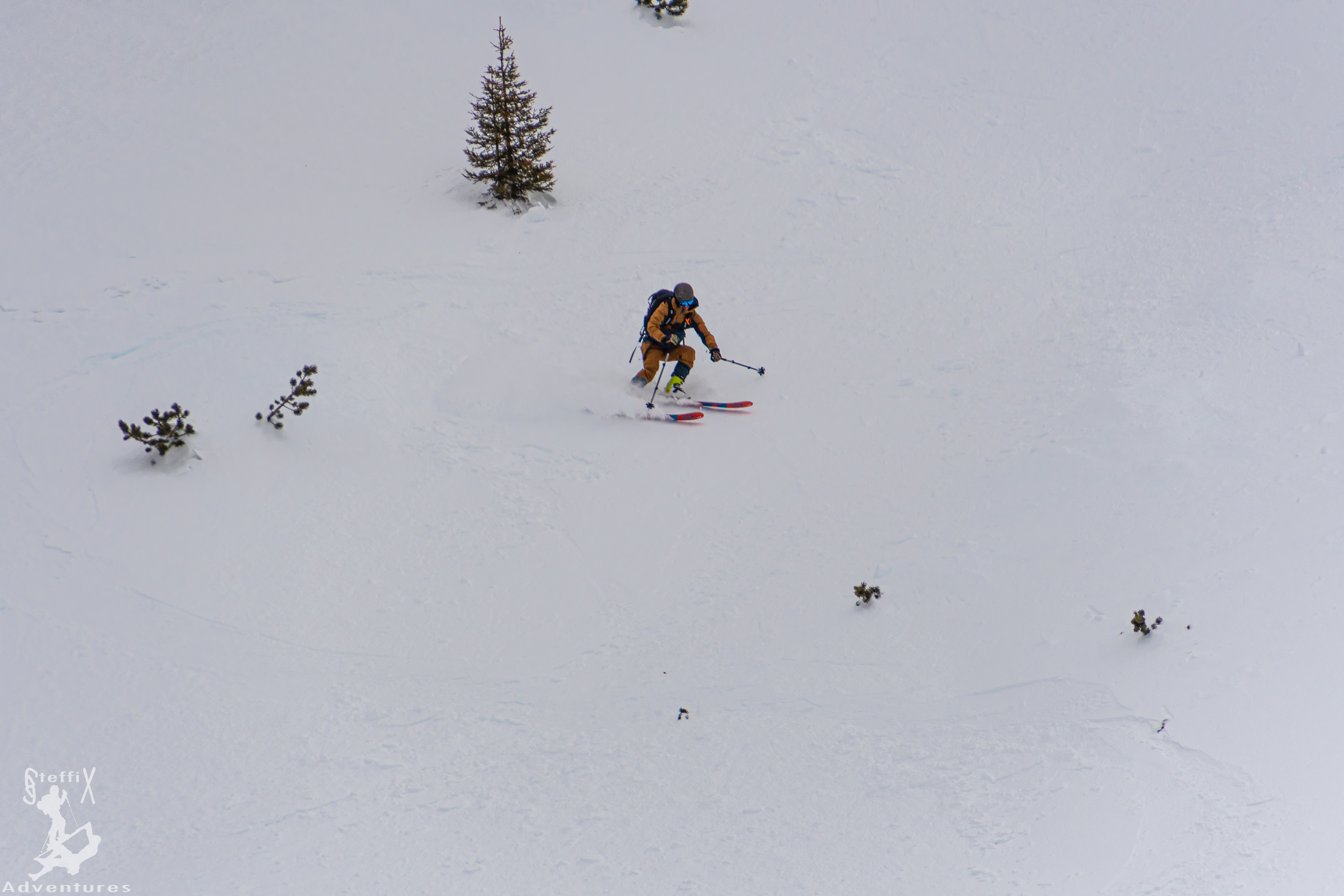 Wir verzichteten auf den höchsten Punkt der Scharte, um die im Lagebericht erwähnten Problemstellen von wenig auf viel Schnee nicht zu provozieren. Nach dem Abfellen ging es den Aufstiegsspuren folgend abwärts und wie erhofft hatten wir unseren Spaß. Wir bahnten uns unseren Weg zurück auf die Damenabfahrt und waren schließlich schnell wieder beim Auto. Unsere Begleitung drehte als Freizeitticketbesitzer noch ein paar Runden auf den perfekten Pisten. Die FFP2-Masken waren natürlich eingepackt. Für uns ging es heimwärts, wieder einmal ein schöner Tag mit netter Gesellschaft und besserem Schnee als man geglaubt hätte.