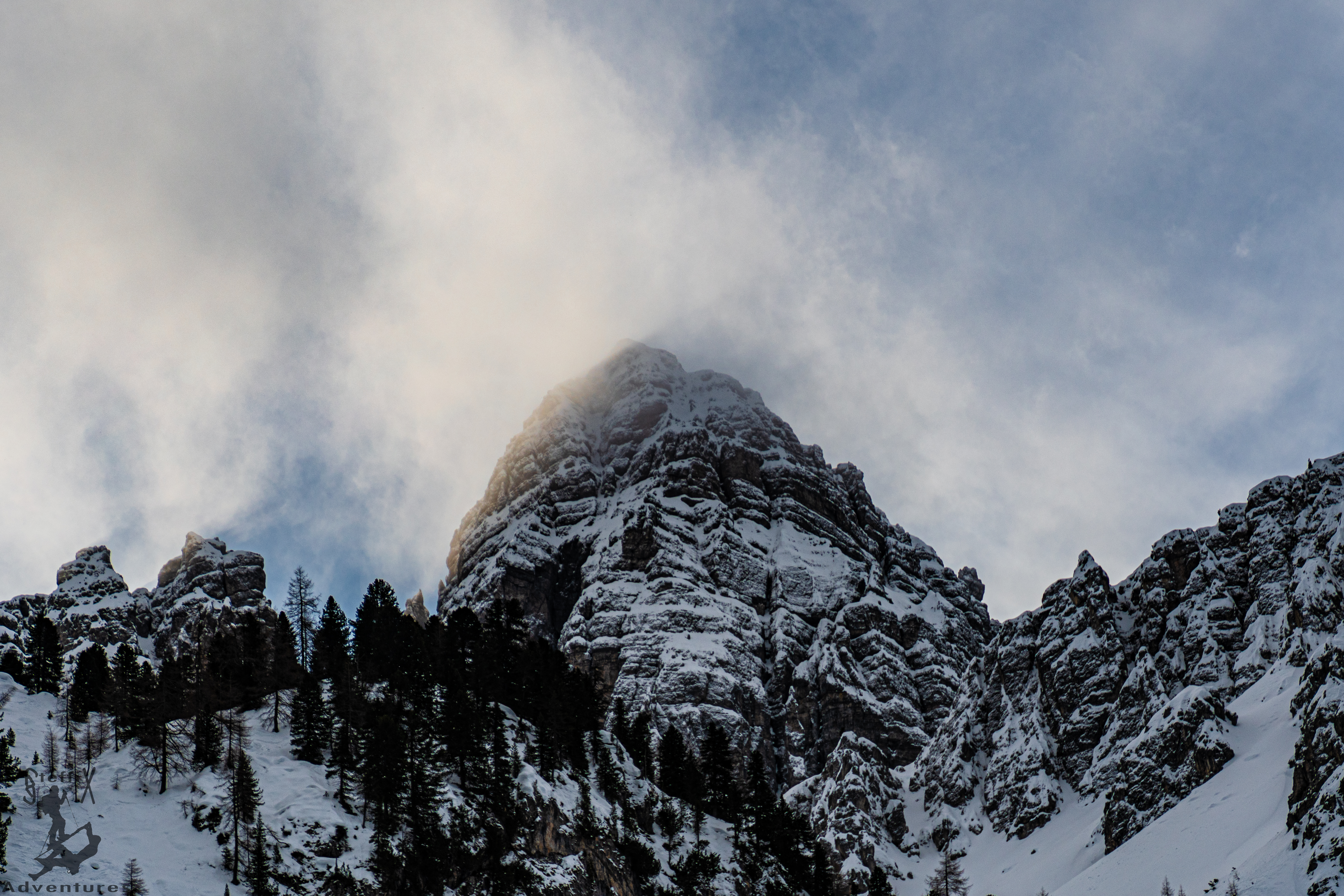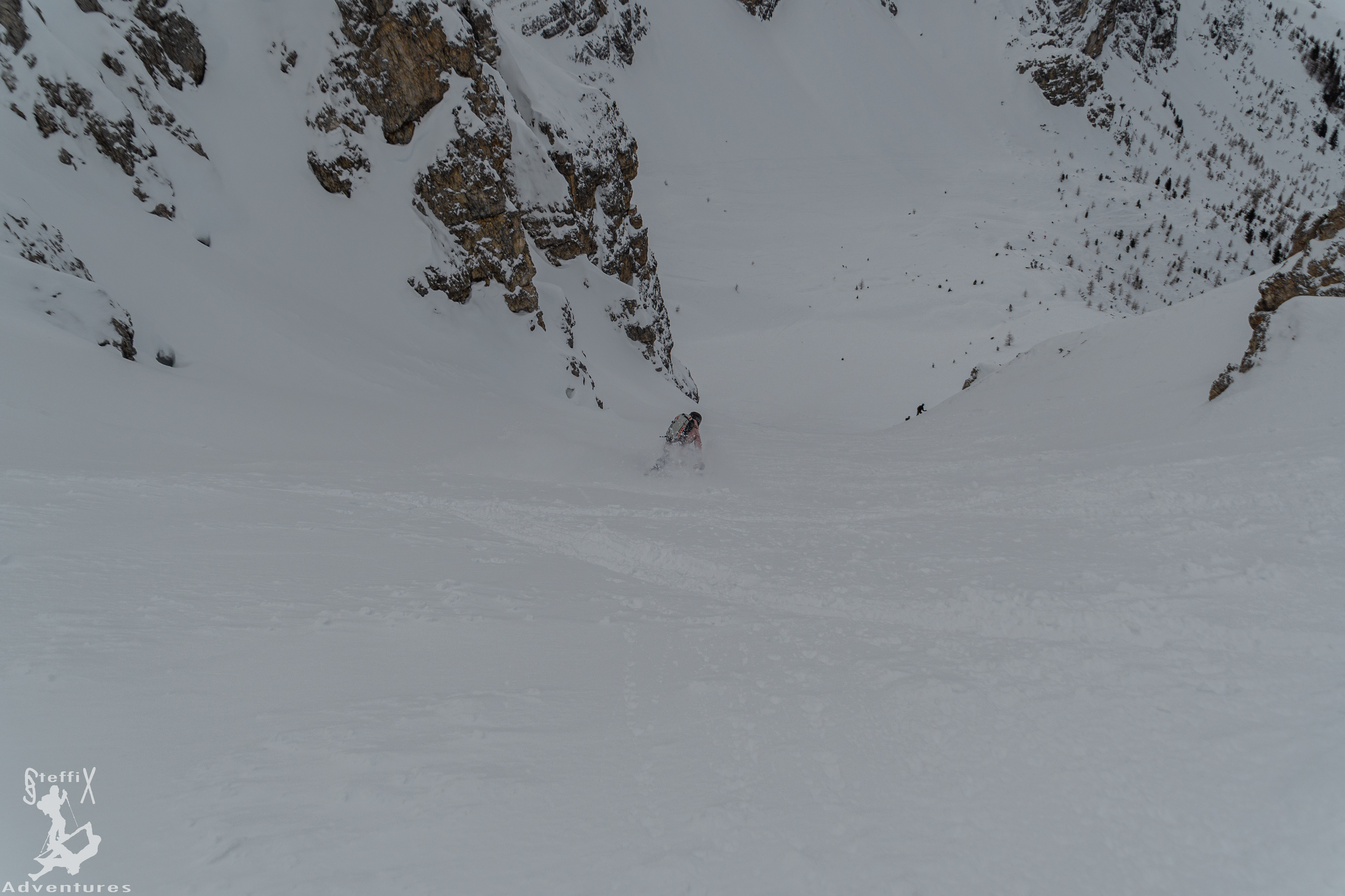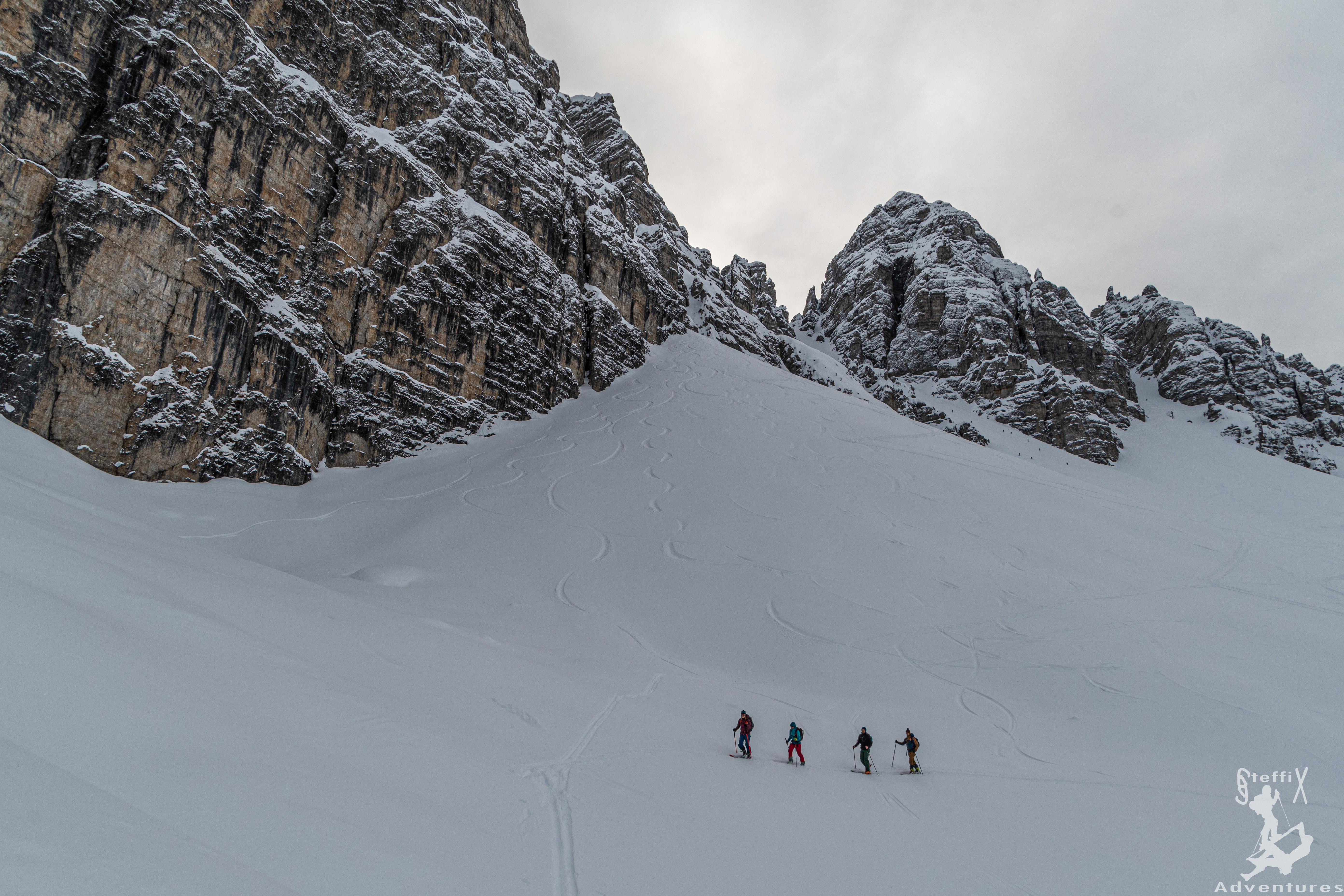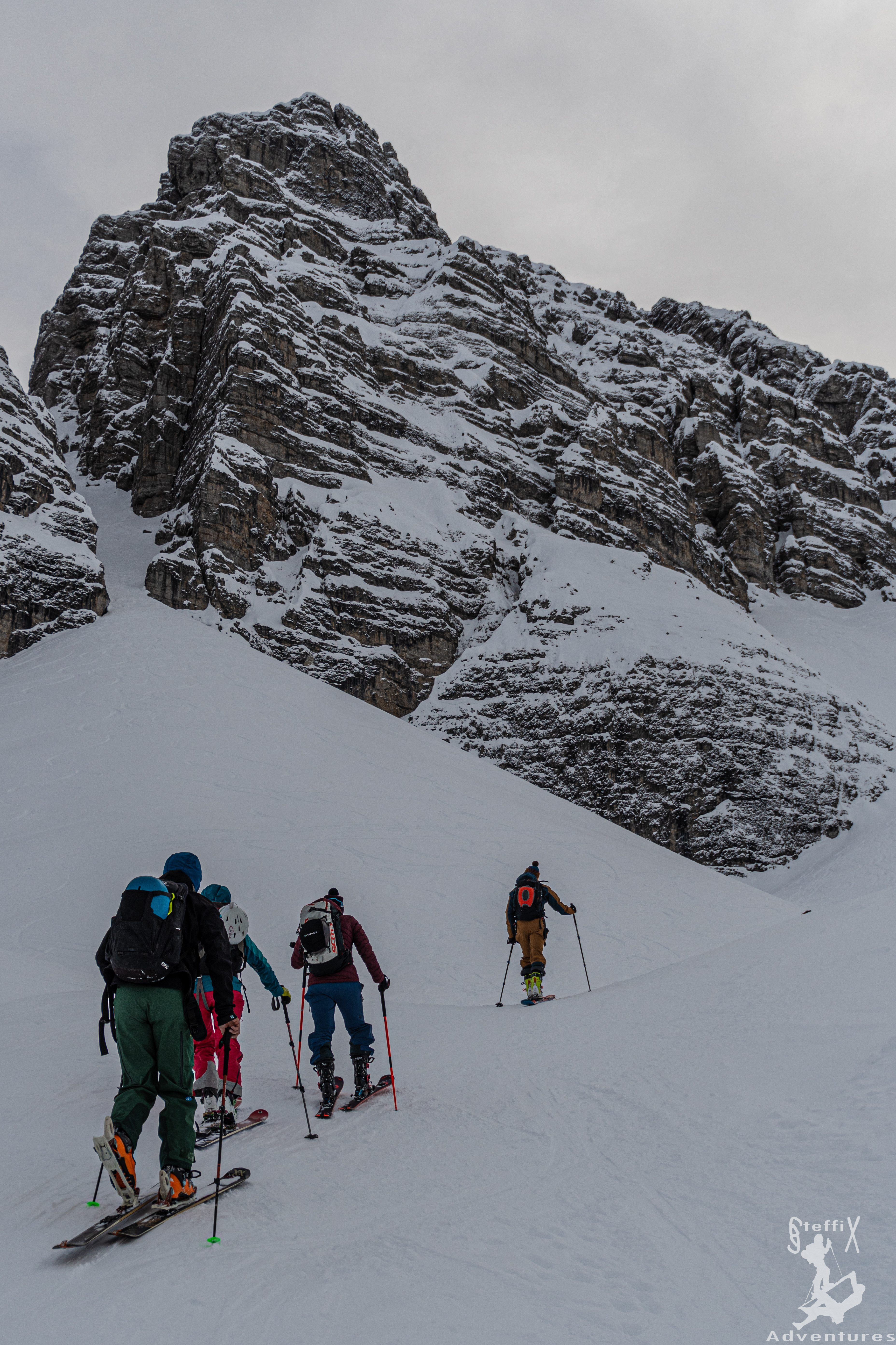 Auf der Suche nach noch etwas pulvrigem Schnee ging es zusammen mit Lena, Maurice und Lukas in das Lizumer Kar in der Axamer Lizum. Ursprünglicher Plan war der Gipfel des Widderberg. Aber was sind schon Pläne? Man plant ja schließlich auch die richtigen Felle einzupacken 😀 Flexibel muss man bleiben und Tape dabei haben, dann können auch zu kleine Felle passend gemacht werden. Mit gebauter Fellkonstruktion ging es kurz über die Damenabfahrt und dann in südliche Richtung durch die bewachsenen Hänge zwischen Hörzingwand und Schneiderspitze in Richtung Marchreisenspitze. Die Sicht bei dem doch recht bewölkten Himmel war durchwachsen, die Wolkengebilde dafür umso schöner. Im Lizumer Kar angekommen, standen wir vor der Wahl: Am Plan festhalten – wie einige andere Skitourengeher an diesem Tag auch – oder spontan in eine der Rinnen ausweichen. Wir entschieden uns für Spontanität und wichen auf die linkeste Rinne zwischen Schneiderspitze und Ampferstein aus. Hier waren die wenigsten Spuren zu sehen und wir hofften auf den ein oder anderen Pulverschwung.