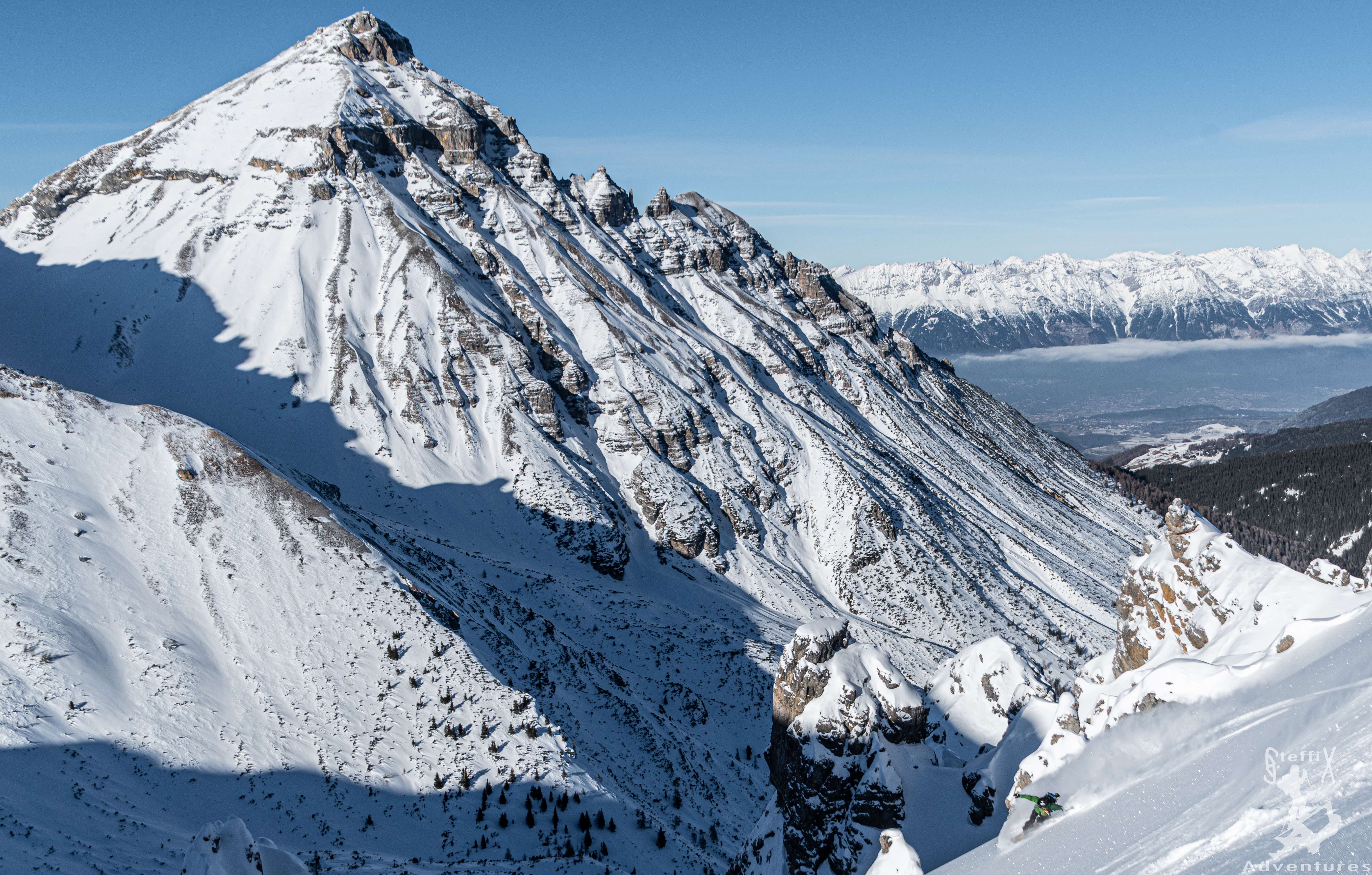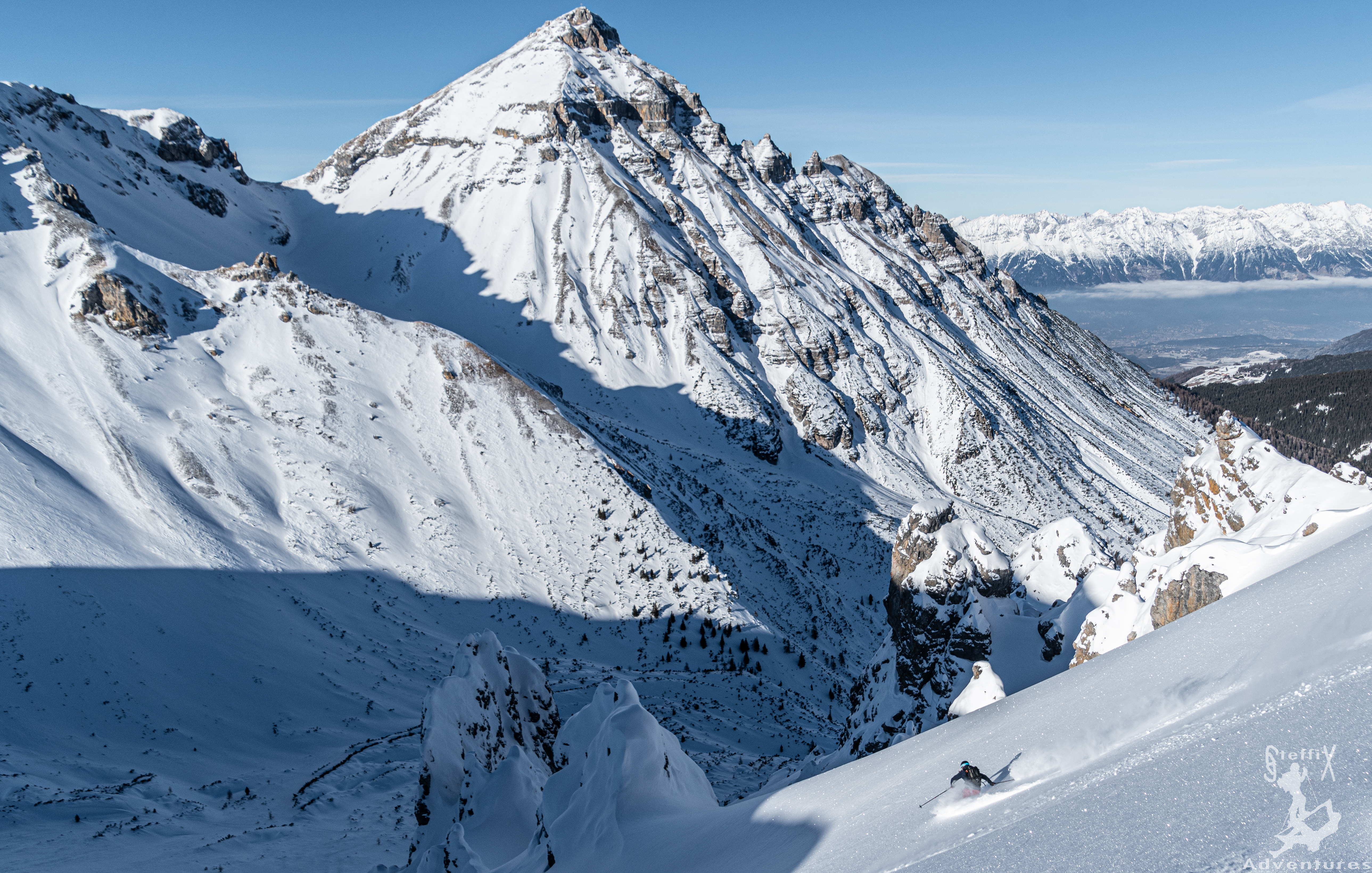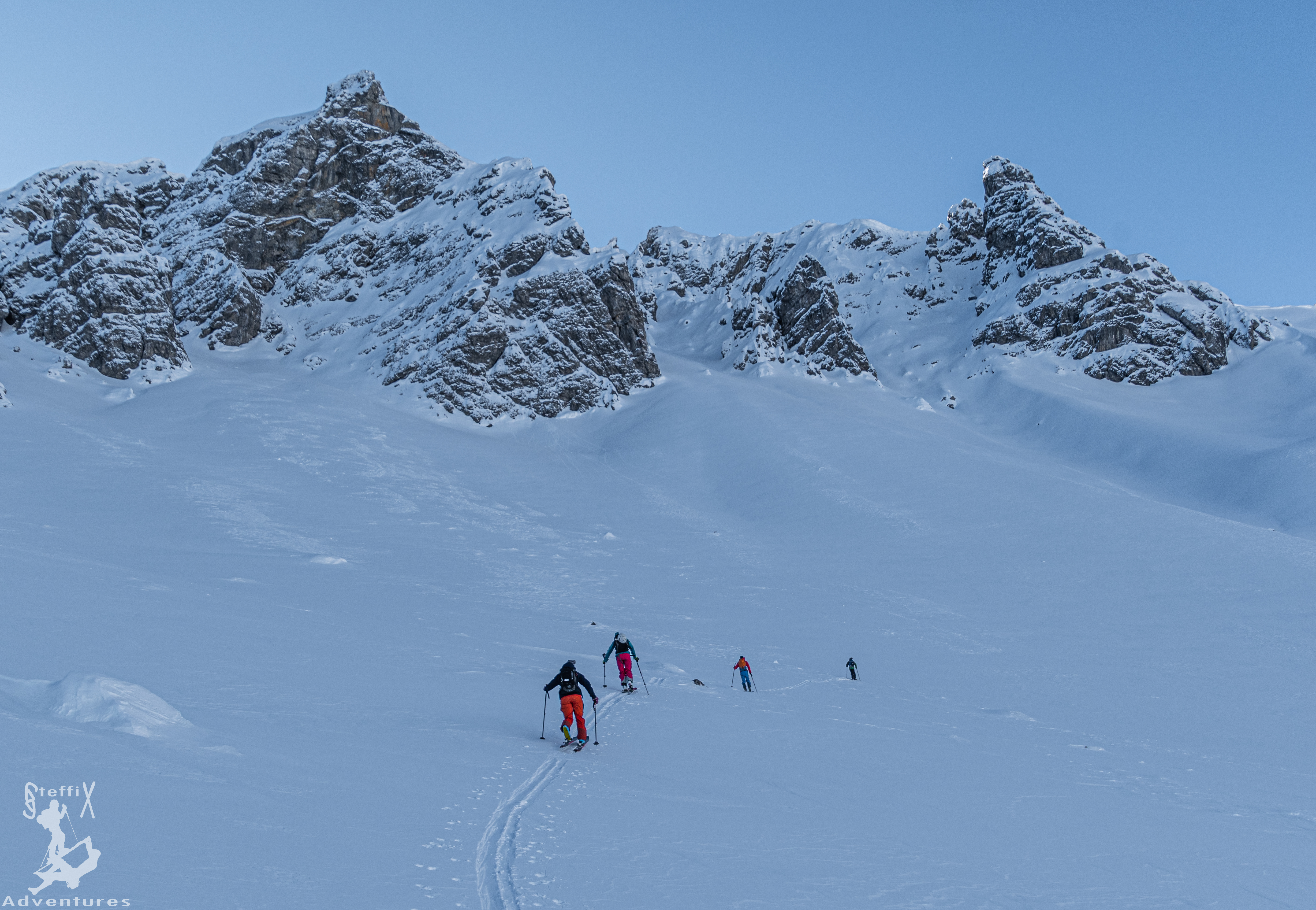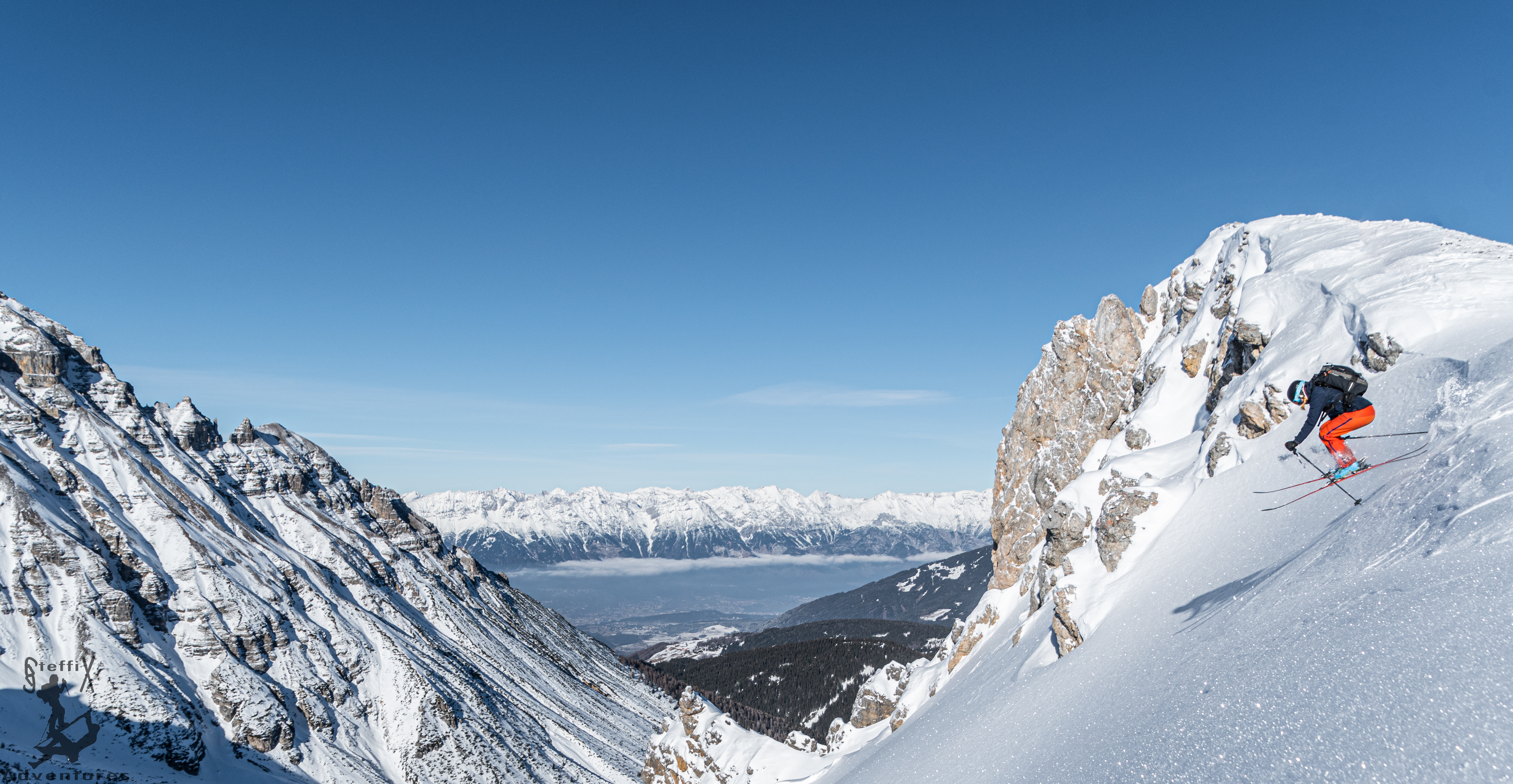 Unten in der Grube schien der Schnee noch sehr windgepresst zu sein. Oben in den Rinnen sah er allerdings deutlich vielversprechender aus. Von oben fuhren zwei Skitourengeher in die Rinnen ein, die wahrscheinlich über den Blaser aufgestiegen waren und der Schnee sah sehr stabil aus. Wir beschlossen mit Abstand weiter aufzusteigen und uns selbst ein Bild der Lage zu machen. Stellenweise war der Altschnee sehr hart und gepresst. Oben auf lag eine recht lockere Schicht, die – je höher wir kamen – immer lockerer wurde. Wir stiegen weiter auf, wobei wir (zumindest einige von uns) die letzten Meter stapfend absolvierten. Oben glitzerte die Sonne in den Hang und bei gemütlicher Jause und Sonnenschein stieg die Vorfreude auf die Abfahrt. Der Blick von oben nach Innsbruck und auch gen Süden ist einfach lässig. Der doch recht kalte Wind ließ uns dann doch bald die Abfahrt angehen und wir genossen die Schwünge in dem super Schnee.
