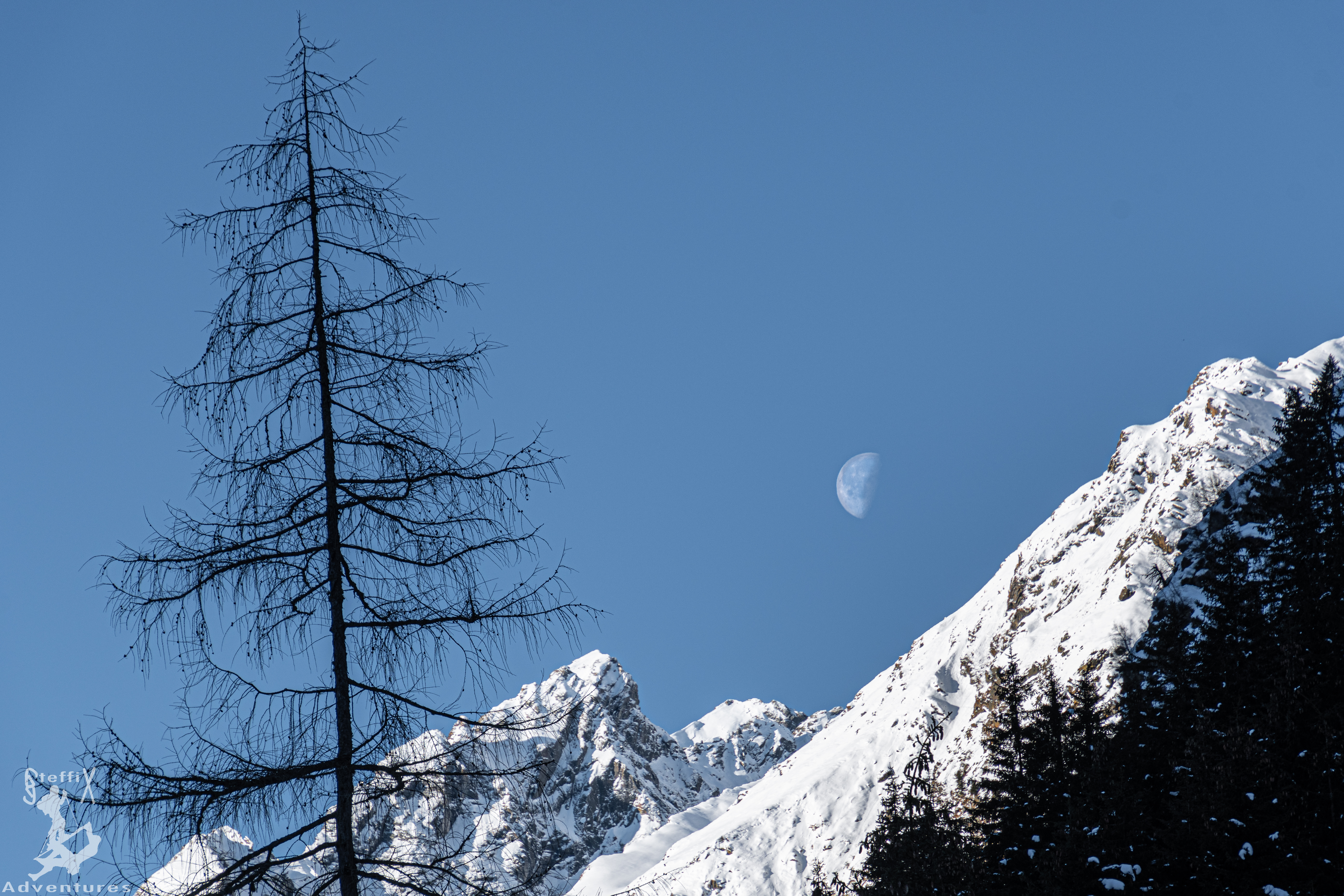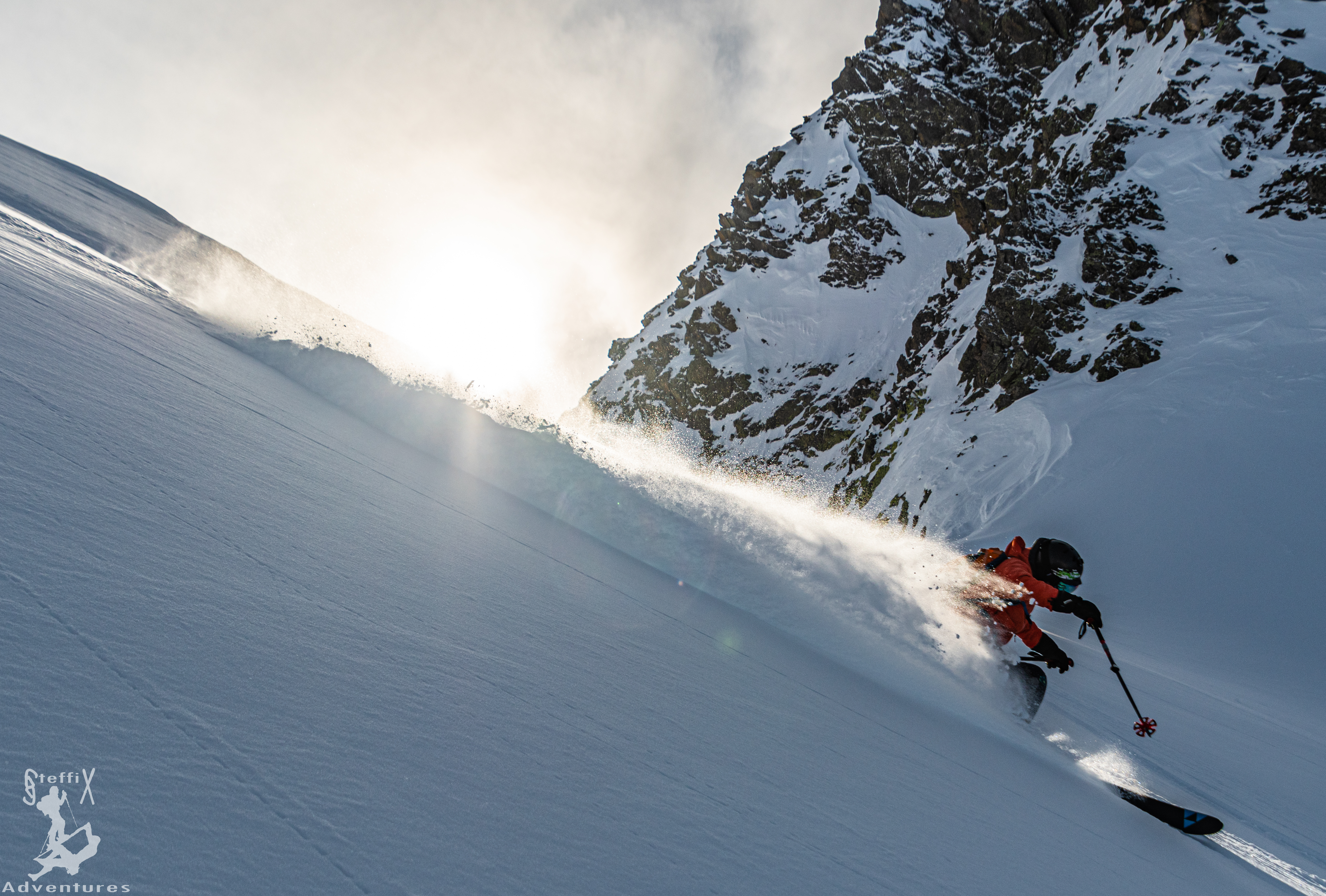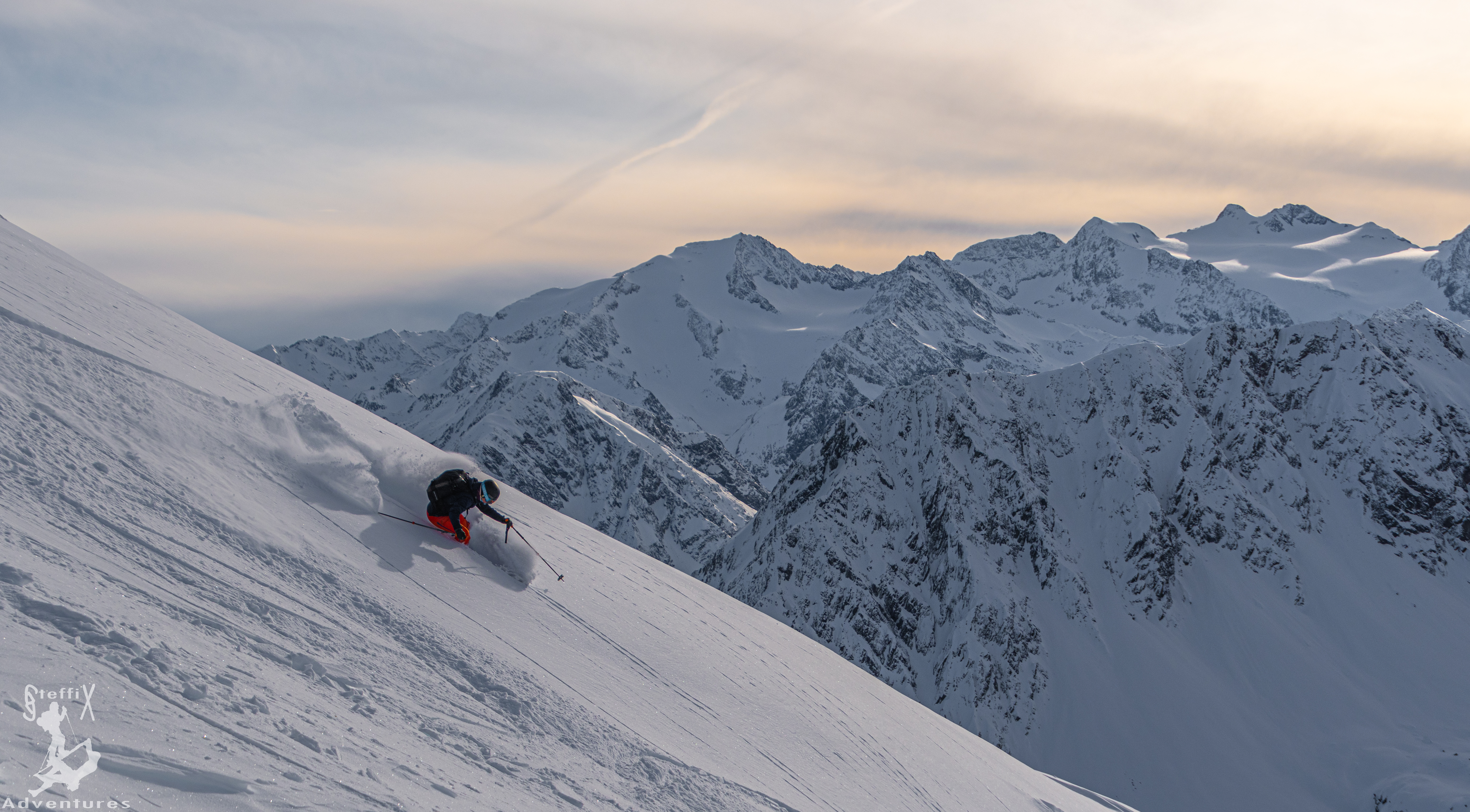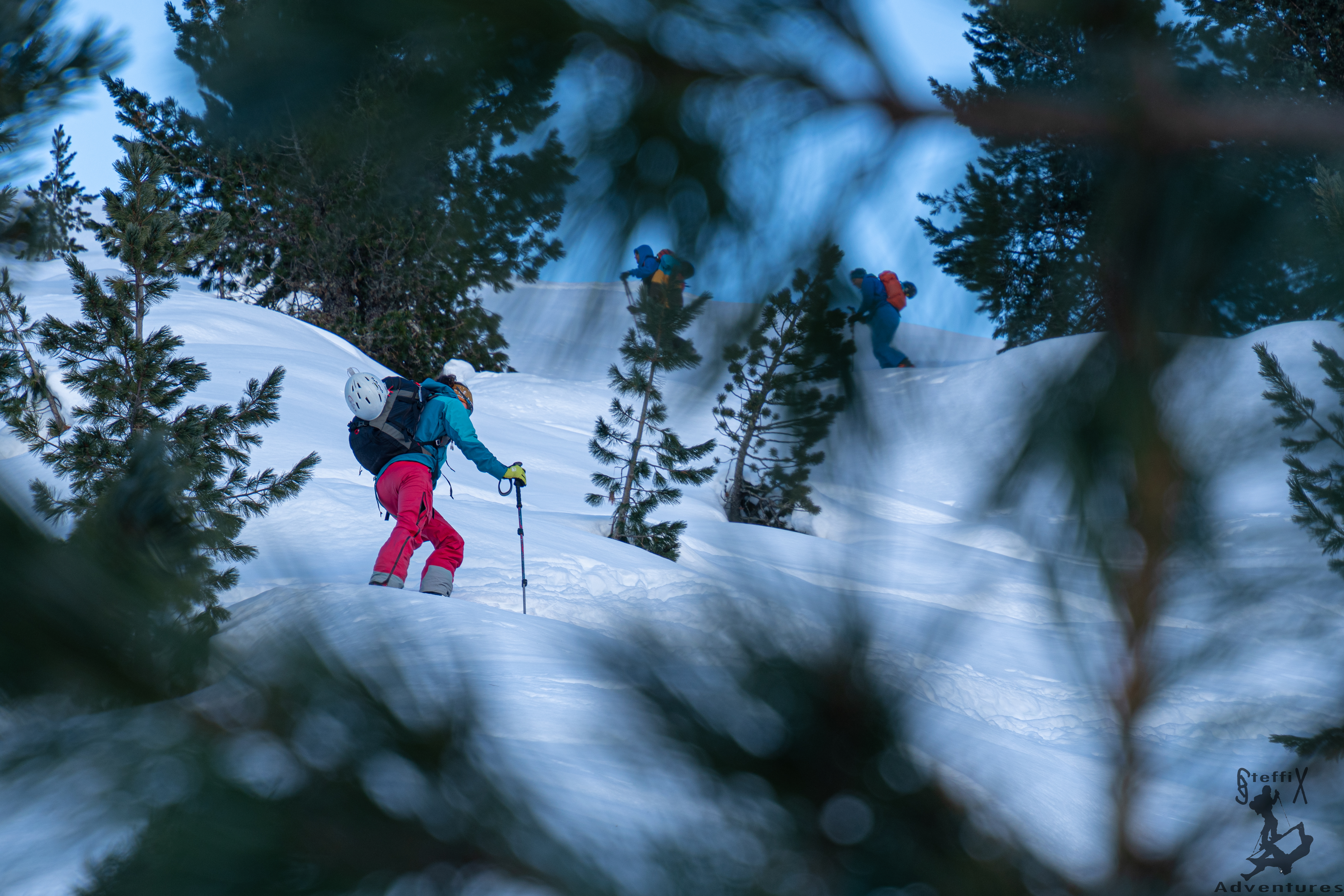 Bei dieser besonderen Lichtstimmung zum Nachmittag hin machten wir uns an die Abfahrt, schließlich warteten noch einige Höhenmeter Pulver auf uns. Wir fanden alle unsere ideale Linie und konnten bis zur Oberissalm von der sehr guten Schneequalität profitieren. Solche Schneemaßen im Frühwinter sind schon eine Besonderheit. Über die Forststraße und anschließend mit dem Auto ging es wieder aus dem Oberbergtal hinaus, die letzten Sonnenstrahlen an den Westhängen der Serles im Blick. Eine ausgedehnte Tagestour mit abermals toller Begleitung und einem Geheimnis 😊