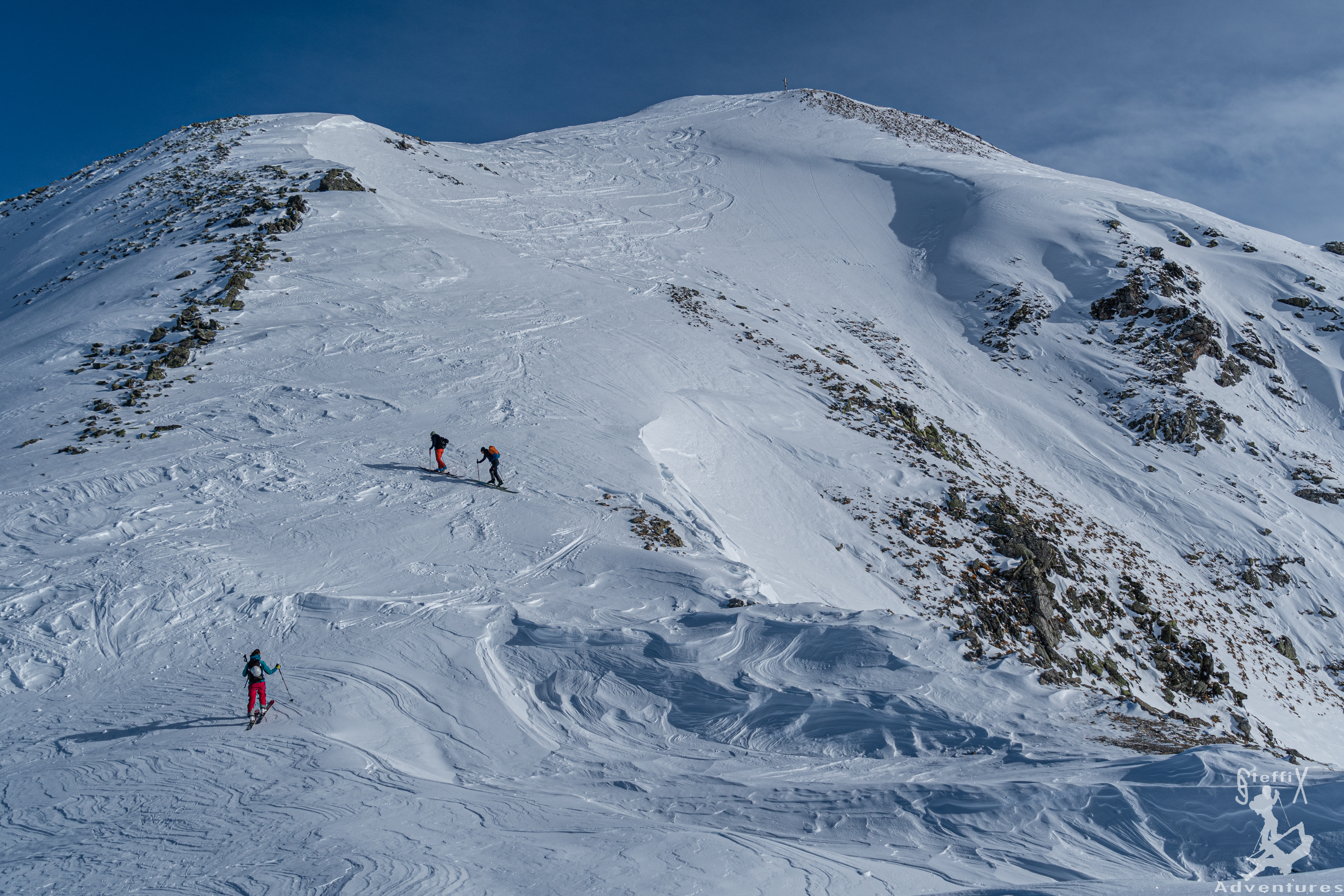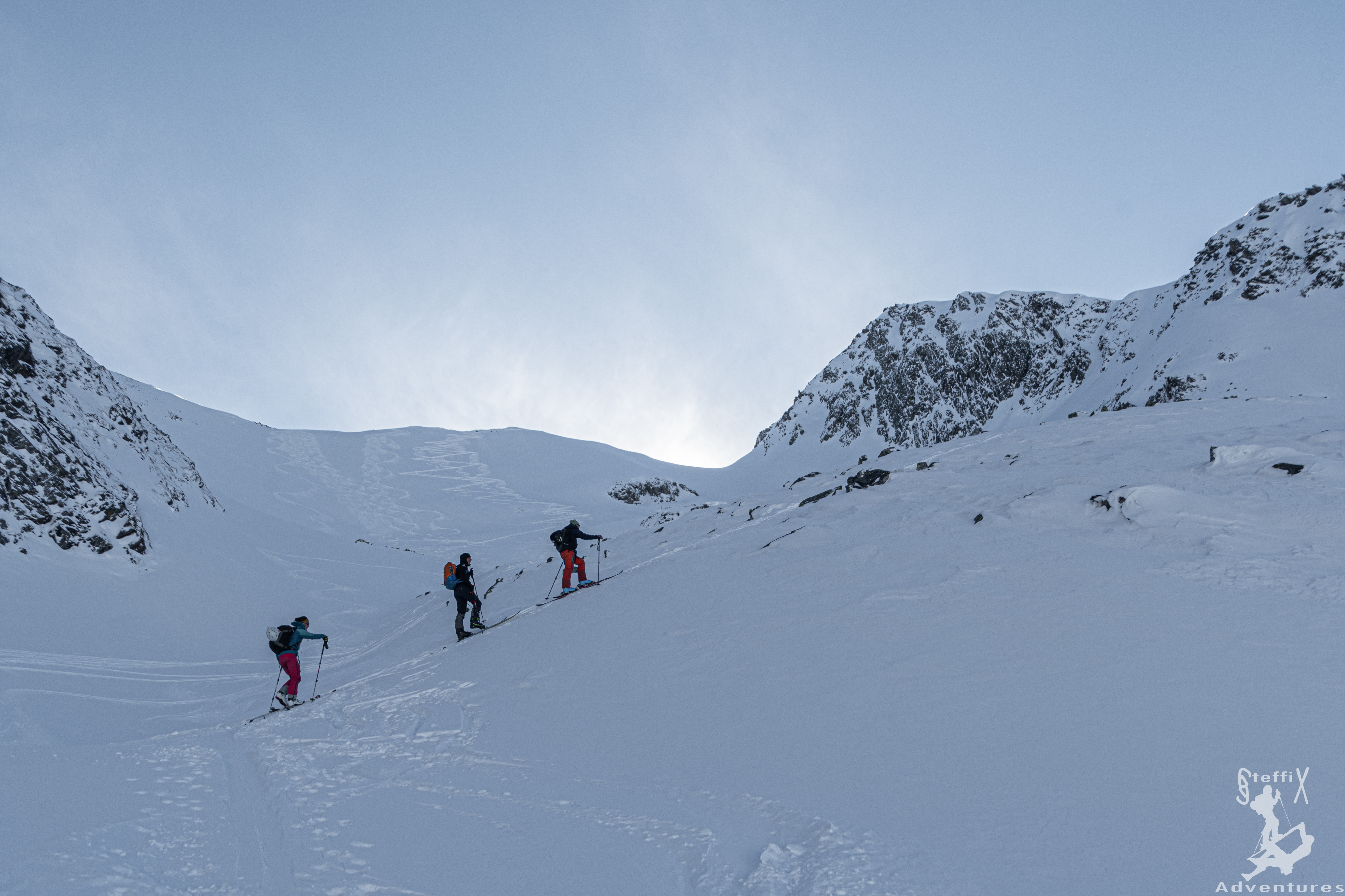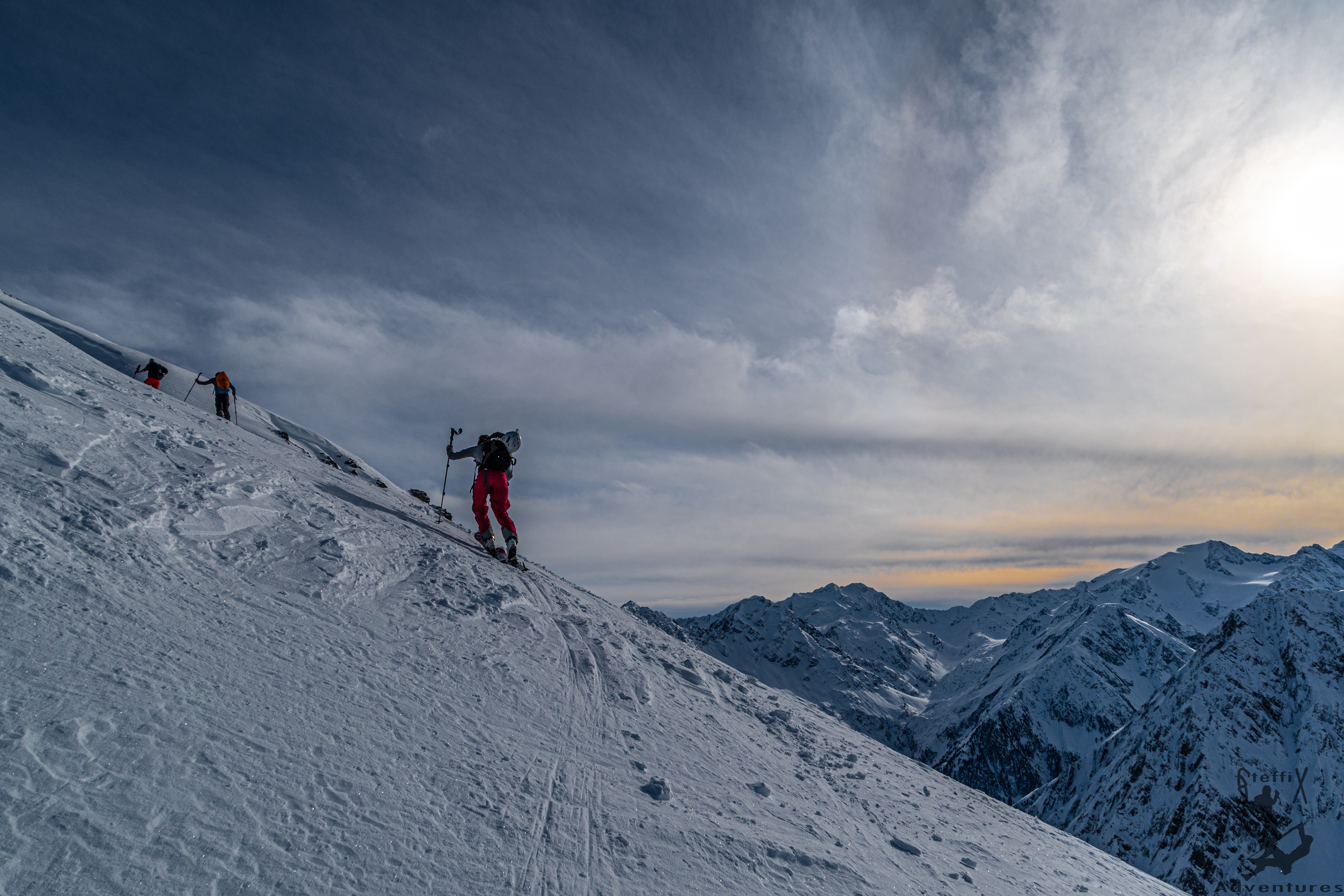 Das Wetter in den Bergen ist nach wie vor gut und stabil angesagt. Zudem entspannt sich die Lawinensituation zunehmenst, sodass auch nordexponierte Hänge mehr und mehr ins Auge gefasst werden können. Zusammen mit July und Hannes geht aus Innsbruck mal wieder in das Stubaital, genauer wollen wir in das Oberbergtal. Hannes hat hier eine schöne Geländeform ausgeforscht und die möchten wir uns einmal genauer anschauen. Doch erst einmal hieß es raus aus dem warmen Auto und rein in den kalten Schatten am Parkplatz. Der Schatten sollte heute unser steter Begleiter werden. Über die Fortstraße zur Oberissalm ging es langsam hinein in das Tal. Auf Höhe einer kleinen Häuseransammlung blieben wir links vom Bachbett, um etwas später über einen steilen Waldhang oberhalb der Oberissalm in Richtung Süden aufzusteigen. Nach dem steilen Hang öffnete sich erstmal das Tal oberhalb des Platzenbachs und unsere Herzen schlugen höher. Wunderschöne Hänge und ein grandioses Ambiente. Uns zog es weiter in die linke der großen Scharten, die sich dort oben aufgetan haben. Glücklicherweise war hier schon eine Spur angelegt, sodass wir bei stellenweise hüfttiefem Schnee nicht spuren mussten. Bei angenehmer Steigung ging es immer weiter in südliche Richtung und nach und nach öffneten sich die Hänge und unsere Vorfreude stieg stetig an. Wir steuerten die oben ersichtliche Scharte an und waren froh, als wir sie erreichten und endlich Sonne in unsere Gesichter schien. Über einen letzten Hang ging es noch weiter auf den Gipfel des Blasserjochs (2830m) wo wir eine gemütliche Jause, bei Sonnenschein, Windstille und absoluter Einsamkeit genossen. Mittlerweile hatten sich ein paar Schleierwolken vor die Sonne geschoben, die die Aussicht und das „Pornorama“ aber in keinster Weise negativ beeinflussten.