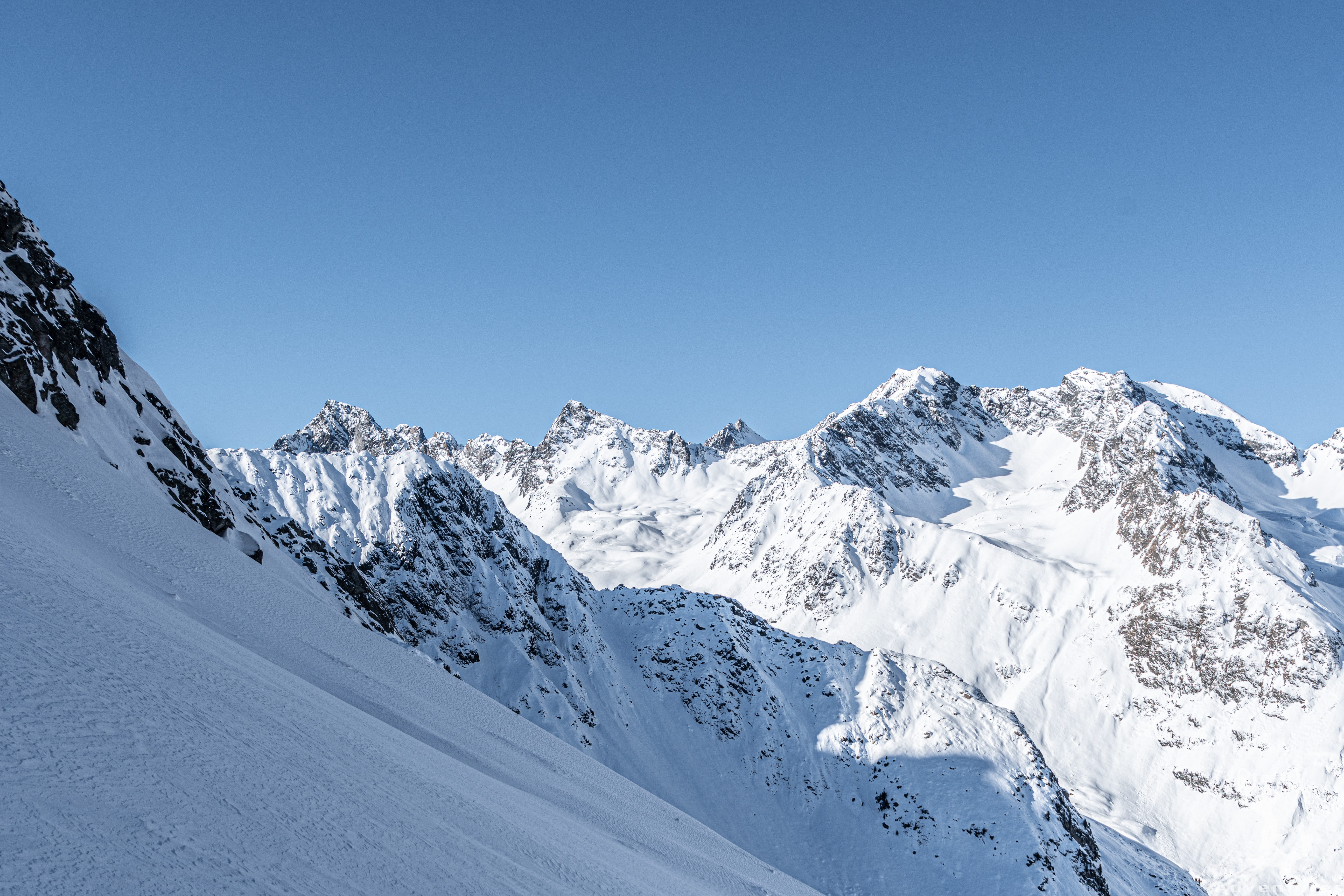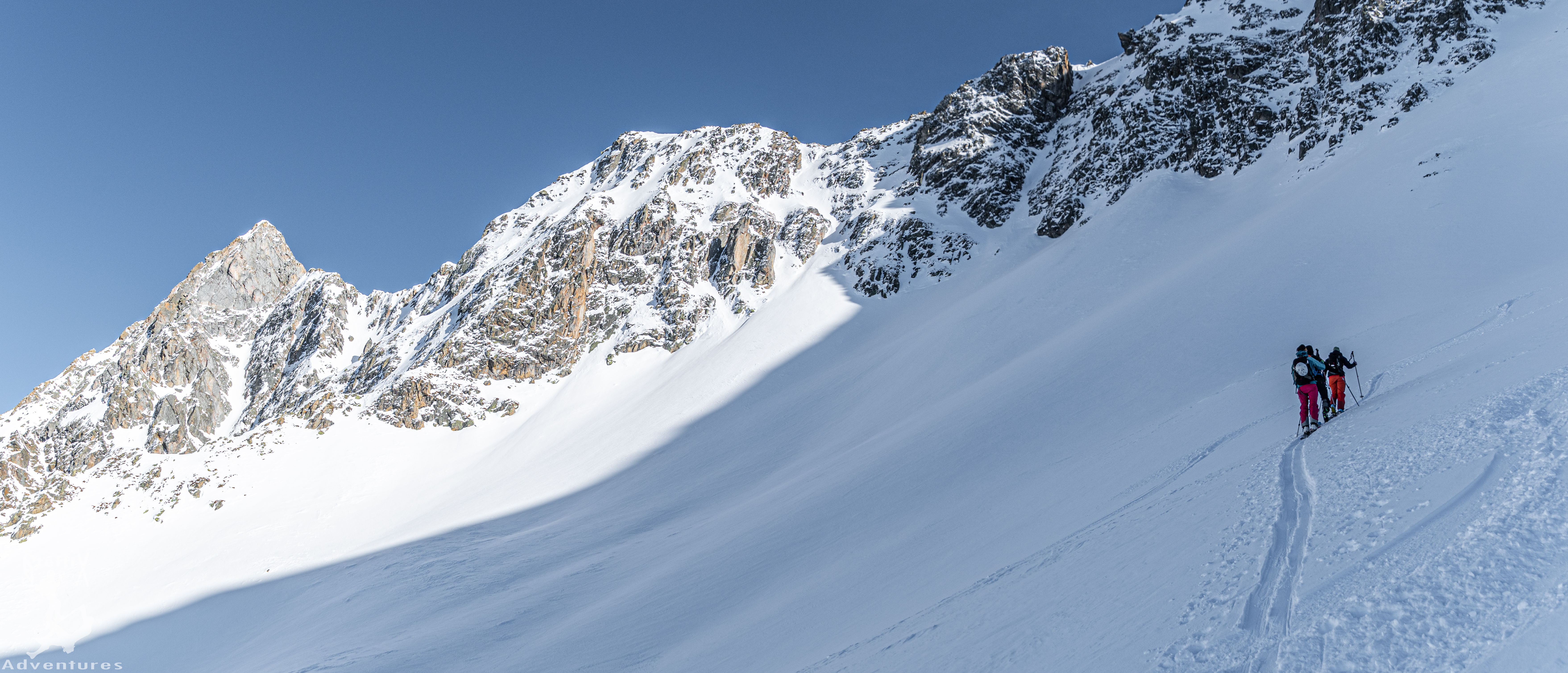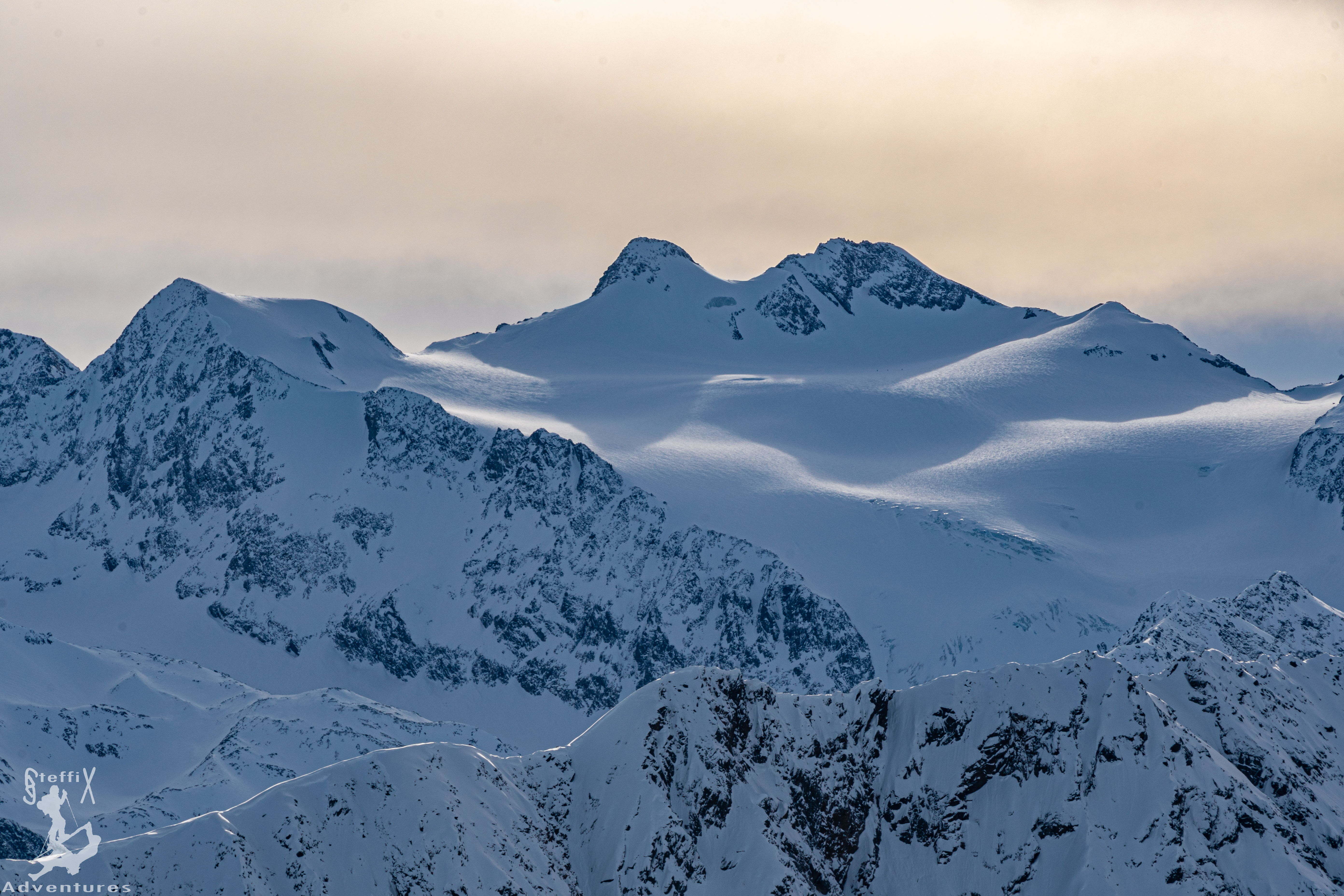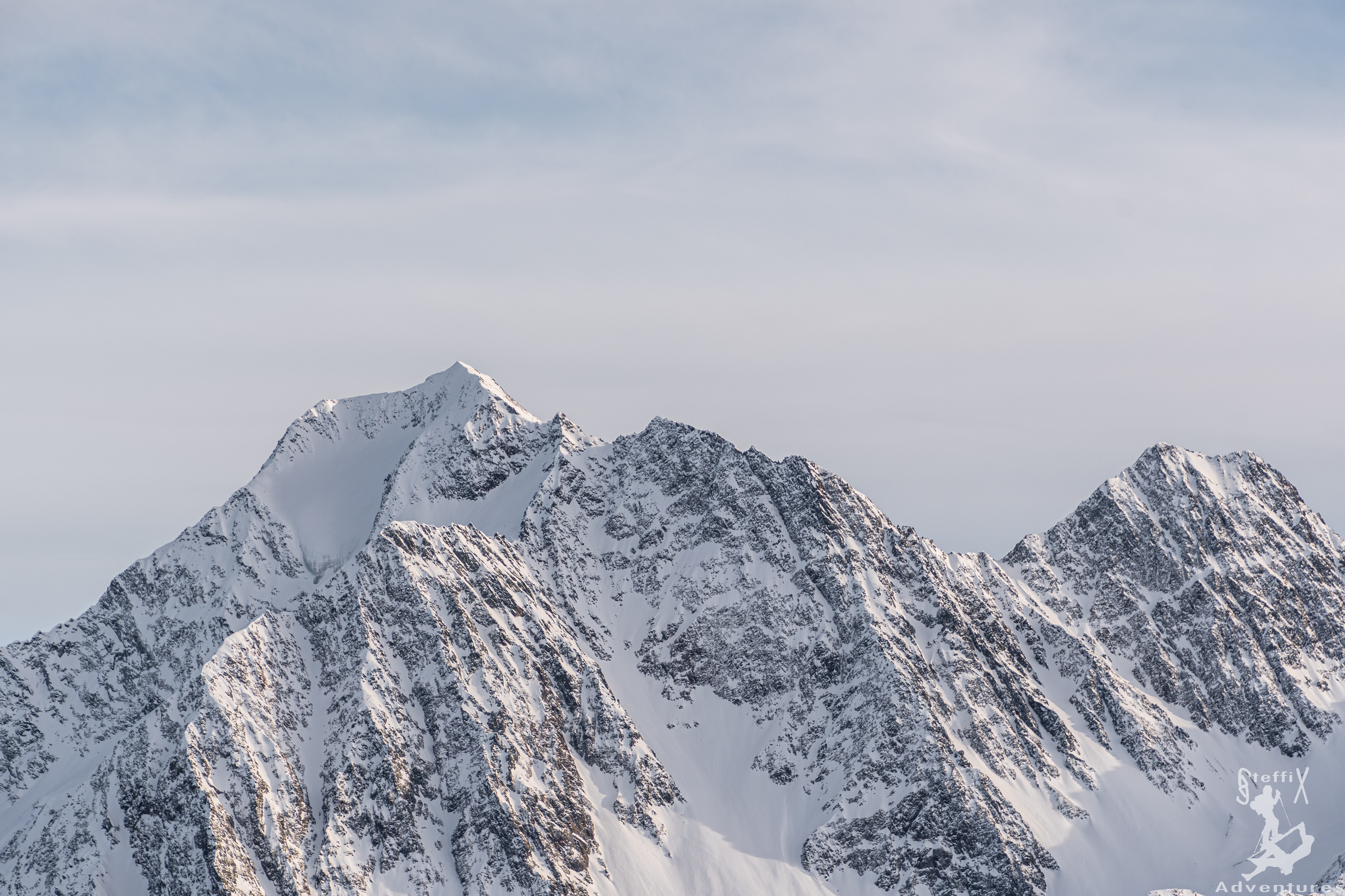 Das Wetter in den Bergen ist nach wie vor gut und stabil angesagt. Zudem entspannt sich die Lawinensituation zunehmenst, sodass auch nordexponierte Hänge mehr und mehr ins Auge gefasst werden können. Zusammen mit July und Hannes geht aus Innsbruck mal wieder in das Stubaital, genauer wollen wir in das Oberbergtal. Hannes hat hier eine schöne Geländeform ausgeforscht und die möchten wir uns einmal genauer anschauen. Doch erst einmal hieß es raus aus dem warmen Auto und rein in den kalten Schatten am Parkplatz. Der Schatten sollte heute unser steter Begleiter werden. Über die Fortstraße zur Oberissalm ging es langsam hinein in das Tal. Auf Höhe einer kleinen Häuseransammlung blieben wir links vom Bachbett, um etwas später über einen steilen Waldhang oberhalb der Oberissalm in Richtung Süden aufzusteigen. Nach dem steilen Hang öffnete sich erstmal das Tal oberhalb des Platzenbachs und unsere Herzen schlugen höher. Wunderschöne Hänge und ein grandioses Ambiente. Uns zog es weiter in die linke der großen Scharten, die sich dort oben aufgetan haben. Glücklicherweise war hier schon eine Spur angelegt, sodass wir bei stellenweise hüfttiefem Schnee nicht spuren mussten. Bei angenehmer Steigung ging es immer weiter in südliche Richtung und nach und nach öffneten sich die Hänge und unsere Vorfreude stieg stetig an. Wir steuerten die oben ersichtliche Scharte an und waren froh, als wir sie erreichten und endlich Sonne in unsere Gesichter schien. Über einen letzten Hang ging es noch weiter auf den Gipfel des Blasserjochs (2830m) wo wir eine gemütliche Jause, bei Sonnenschein, Windstille und absoluter Einsamkeit genossen. Mittlerweile hatten sich ein paar Schleierwolken vor die Sonne geschoben, die die Aussicht und das „Pornorama“ aber in keinster Weise negativ beeinflussten.