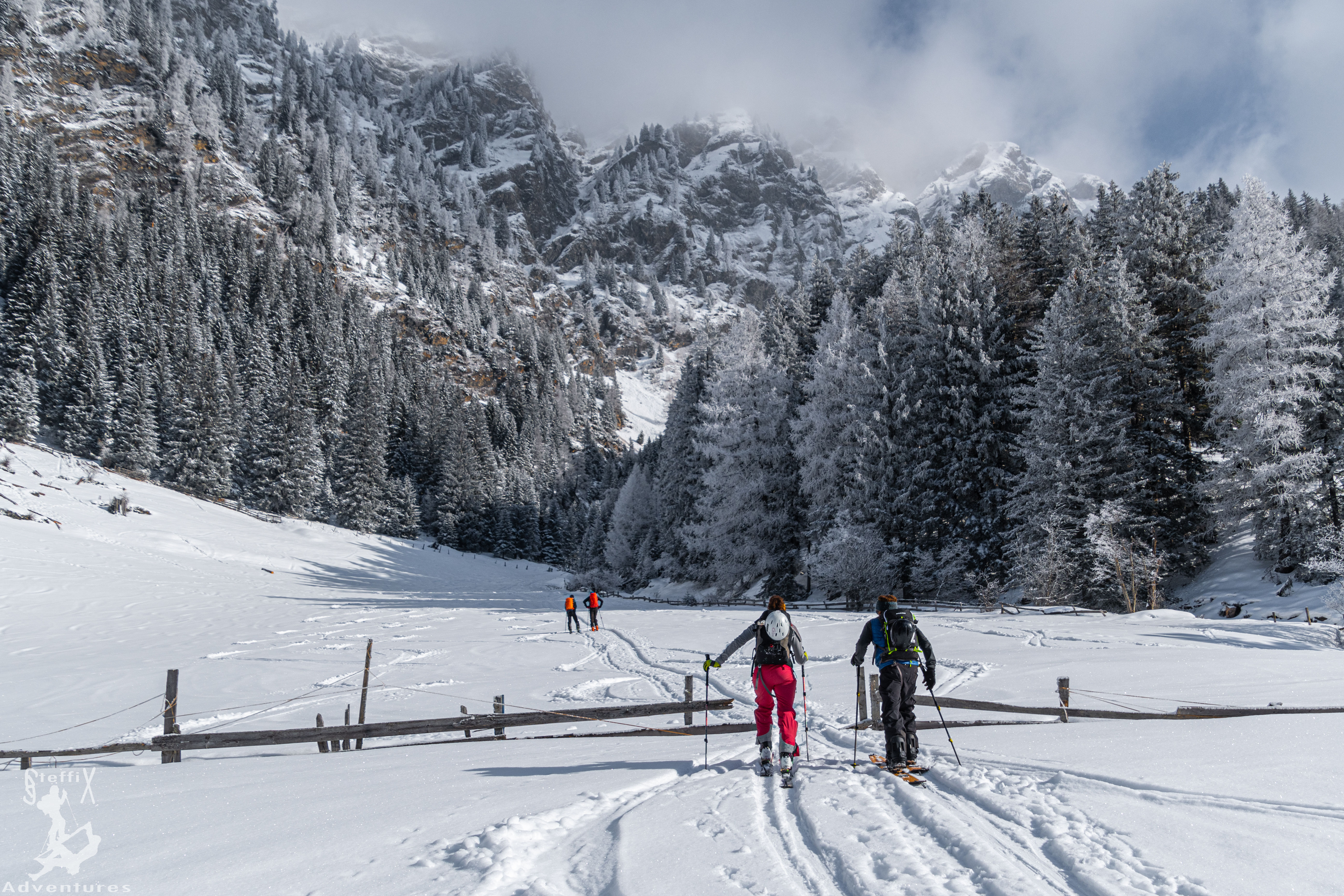 Sehr kalt sollte es werden am Samstag, aber dafür sonnig. Der Plan sah also vor, möglichst südseitig aufzusteigen und zu hoffen, dass der Schnee noch keinen Stich von der Sonne kriegt: Passt, gemma Gammerspitze! Matze war mal wieder in Innsbruck und so ging es mit ihm, Köbi und Pepi über den Brenner in Richtung St. Jodok und weiter nach Vals. Mehr schlecht als recht wurde neben der Straße geparkt, glücklicherweise ist die Straße nicht zu stark befahren. Links an der Horlicher Wand ging es für uns durch den steilen Wald auf die Ebene unter den Finaulmähder. Der Plan ging auf und in der Sonne waren die wirklich kalten Temperaturen gut aushaltbar. Landschaftlich ist die Tour wirklich sehenswert, vor allem das Block-Labyrinth im oberen Bereich erfordert ein wenig Ortskenntnis.