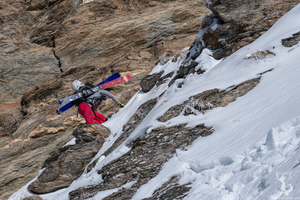 Zum Glück ist Pepi die Tour bereits gegangen und kannte den Weg. Vielleicht ist er aber auch den wenigen Spuren nachgegangen. 300 Höhenmeter unter dem Gipfel mussten die Ski dann kurzeitig abgeschnallt werden, um durch den engen Felsdurchschlupf auf das Plateau unterhalb der Gammerspitze (2537m) zu gelangen. Die letzten Höhenmeter führten nach wie vor in der Sonne in Richtung des schönen Gipfels mit toller Sicht auf Olperer & Co.