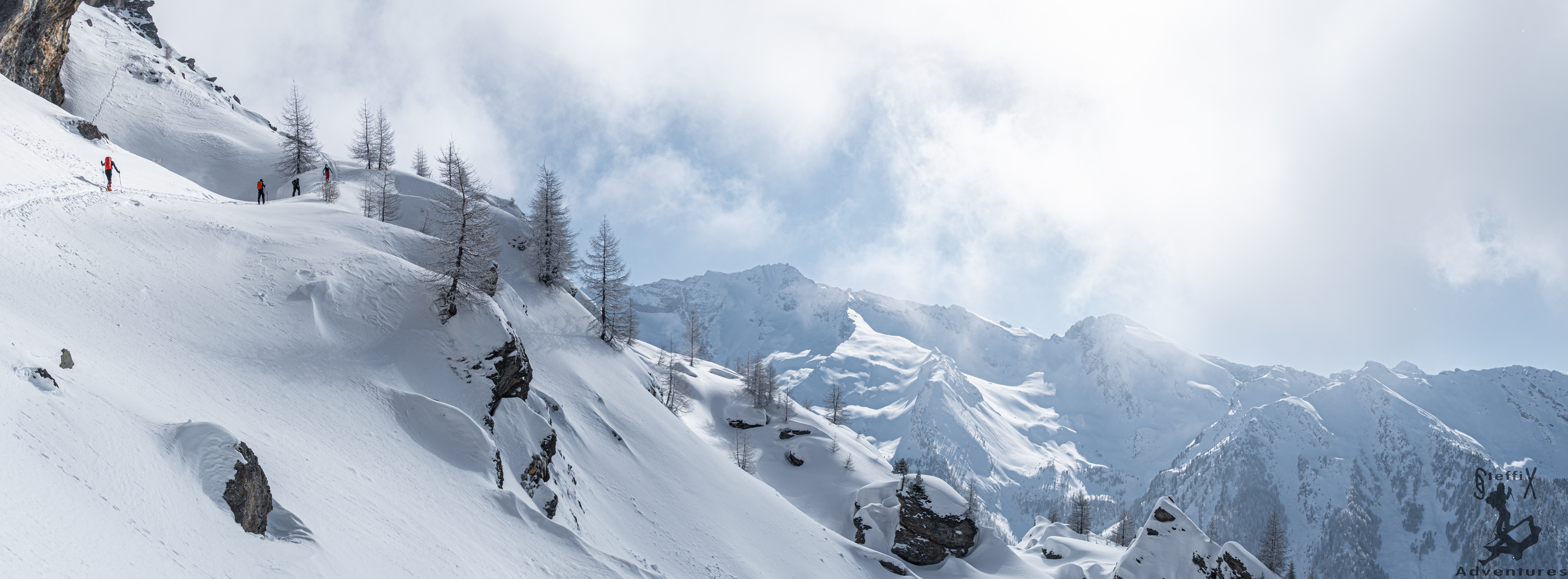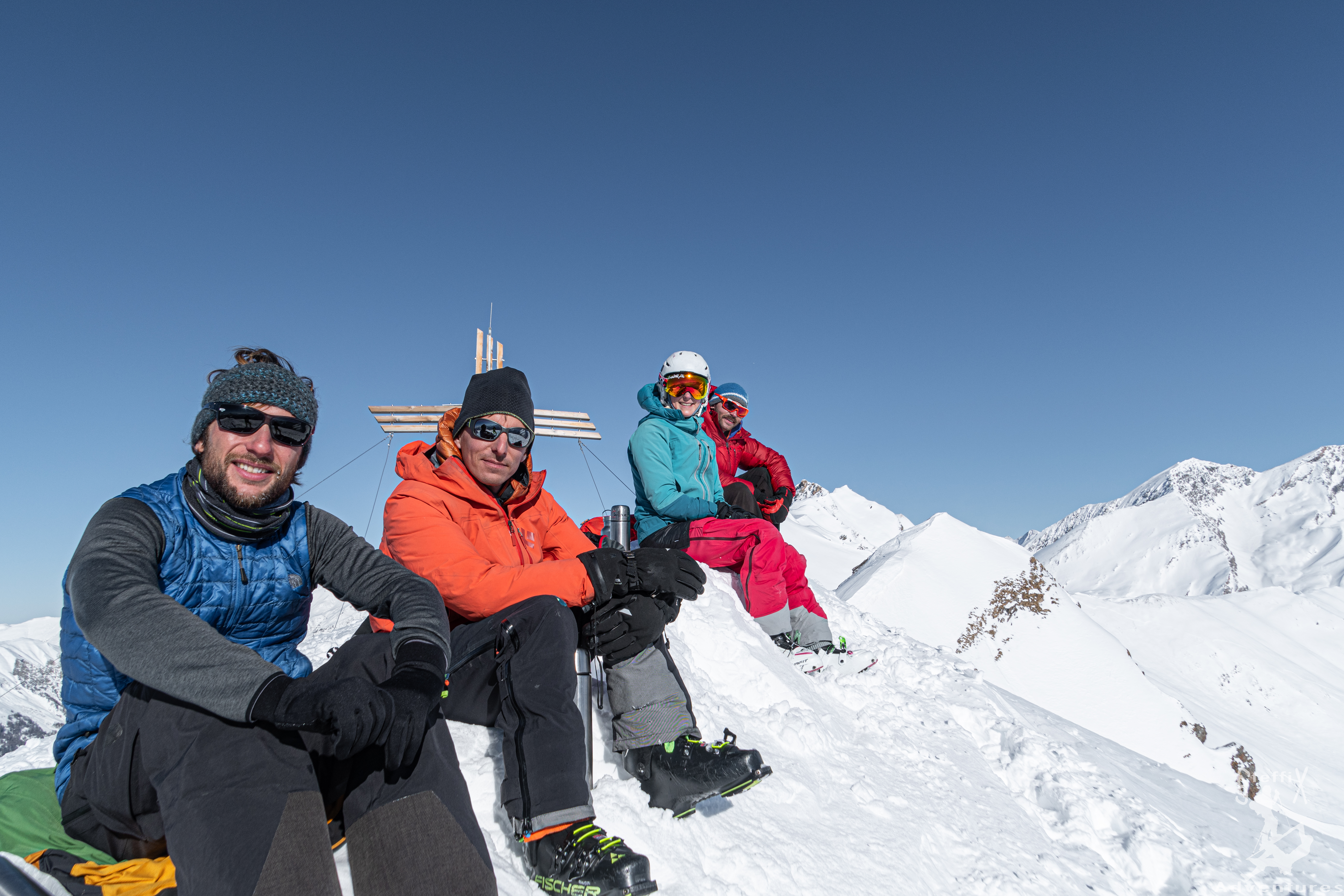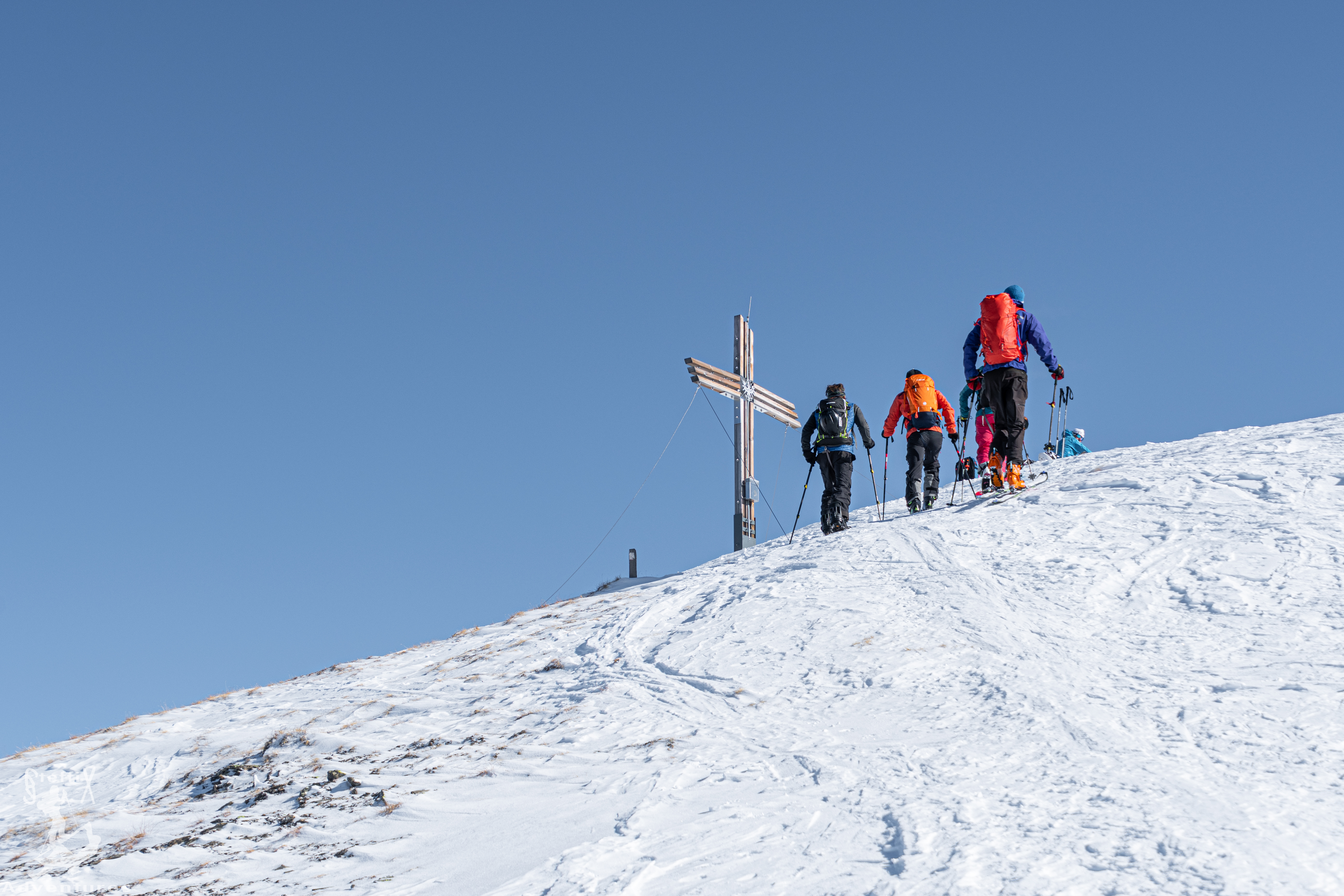 Felix war an diesem Tag nicht ganz fit, vielleicht hatte er schon erste Leistungseinbußen aus Angst vor dem nahenden 30er. Am Ende fanden wir uns aber alle am Gipfel wieder und genossen bei nur leichtem Wind passable Temperaturen und füllten die Glykogen-Speicher wieder auf. Die Abfahrt startete mit dem Wahnsinns-Gipfelhang, der bei sehr moderater Neigung zum Tempomachen einlädt. Dann gilt es einen engen Durchschlupf nicht zu verpassen, um nicht über die Felsabbrüche in Richtung Tal zu gelangen. Der Schnee in und kurz nach der Engstelle war leider nicht mehr allzu gut, dafür war er unten wesentlich besser als noch beim Aufstieg erwartet. So ging bis zur nächsten Engstelle unter den Finaulmähder (riders right vom Wald), wo ein alter Lawinenkegel nochmal vollen Fokus auf das Abfahren verlangte. Die letzten Meter waren entspannte Almhänge bis zum Auto. Super Tourenwahl an diesem kalten Tag, die schon Lust auf den nächsten Tag machte. Da schlug es für Felix dann wirklich 30.