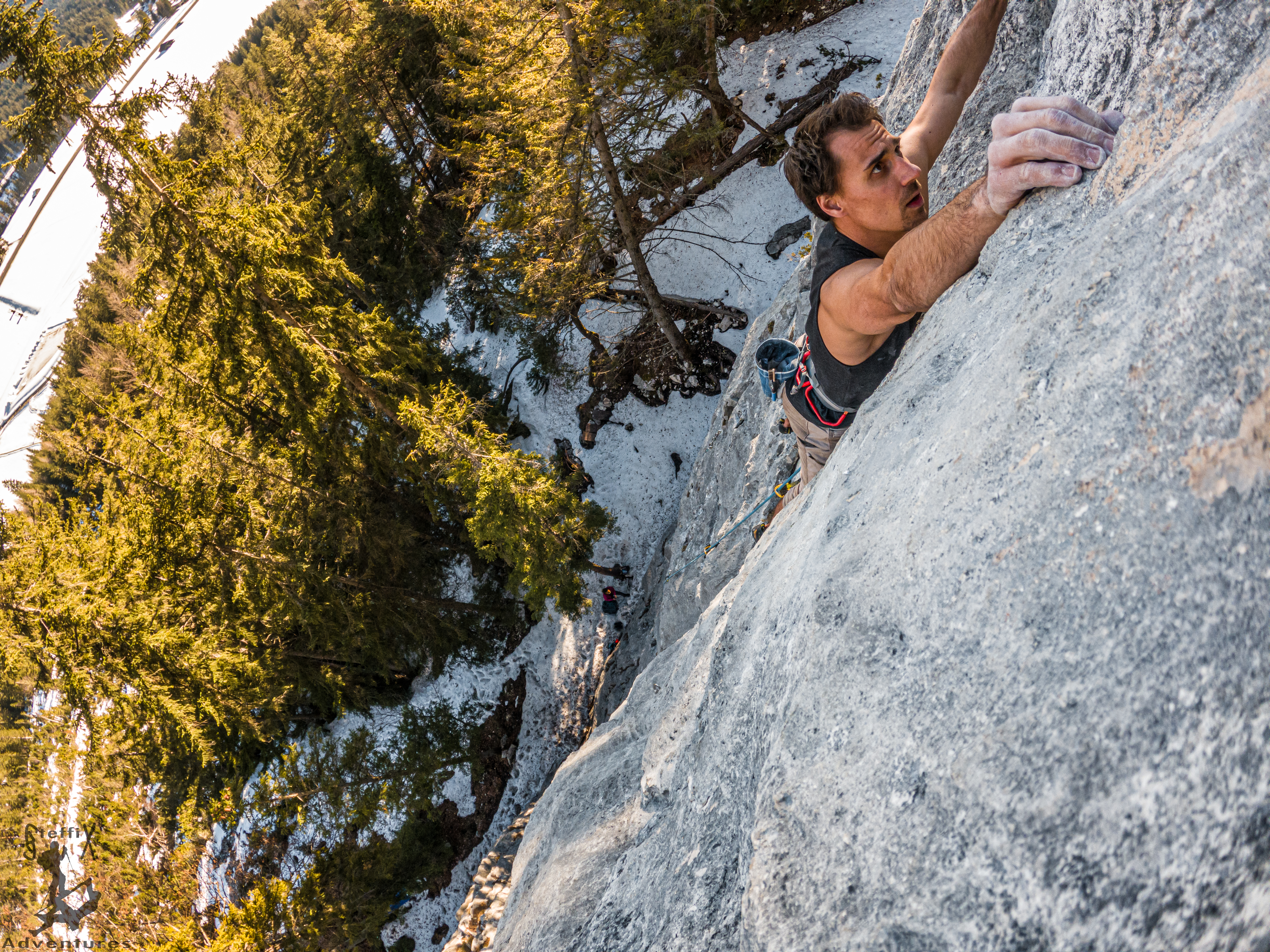 Am Sonntag wollten wir das gute Wetter dann für ein paar Klettermeter ausnutzen und fuhren nach Leutasch, um dort am Mauerbogen die ersten Felsstrukturen für 2021 in die Hand zu nehmen. Um dorthin zu gelangen mussten wir allerdings durch den im Zustieg zu finden Schnee stapfen. Auch der Wandfuß war nach wie vor mehr weiß als erdig, was der Kletterei aber keinen Stein in den Weg legte. Kann man das als Wortspiel durchgehen lassen? Wie dem auch sein, es war ebenfalls ein schöner Tag draußen bei angenehmer Ruhe und schöner Kletterei. So kann die Klettersaison 2021 starten 😊