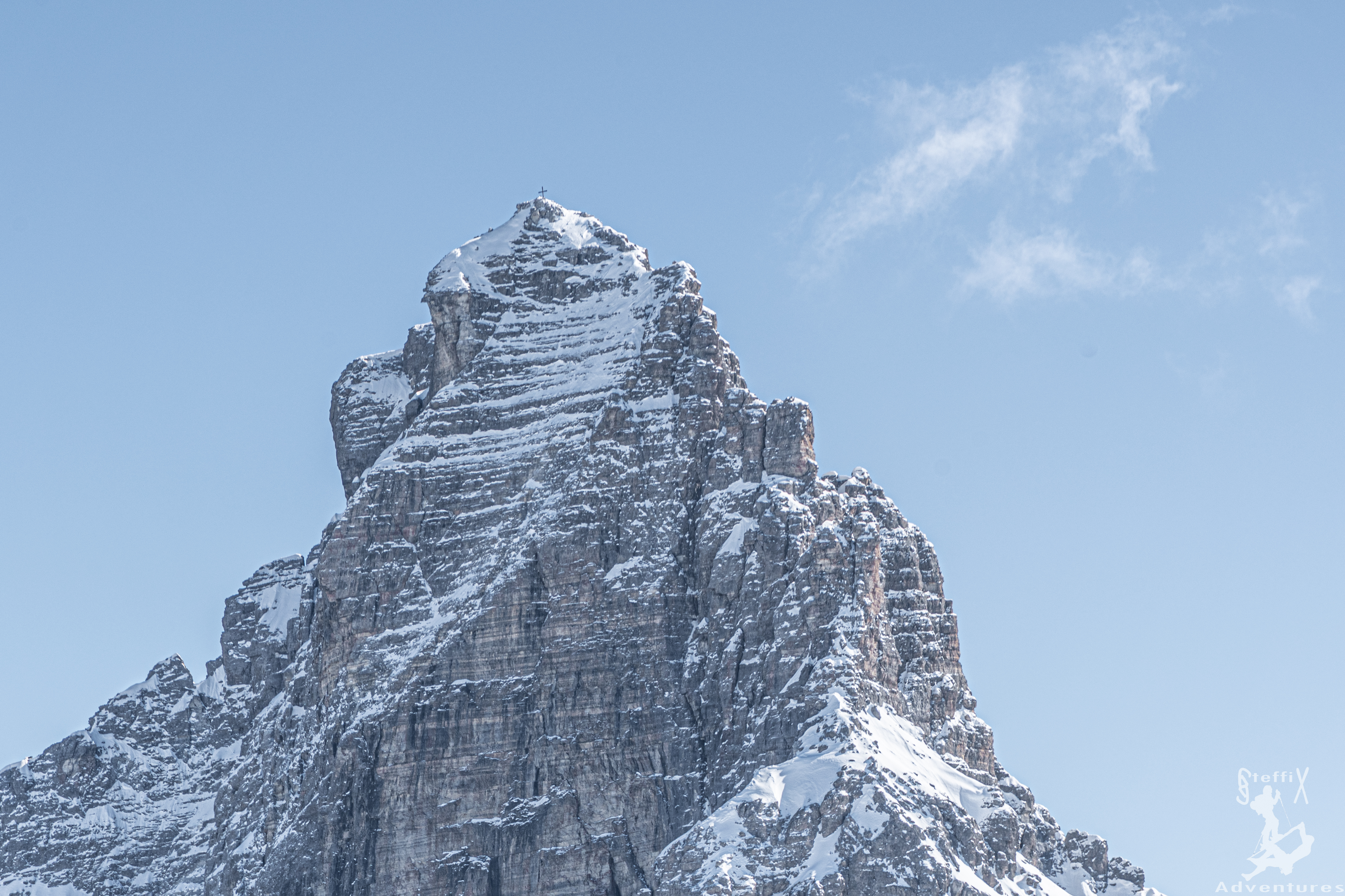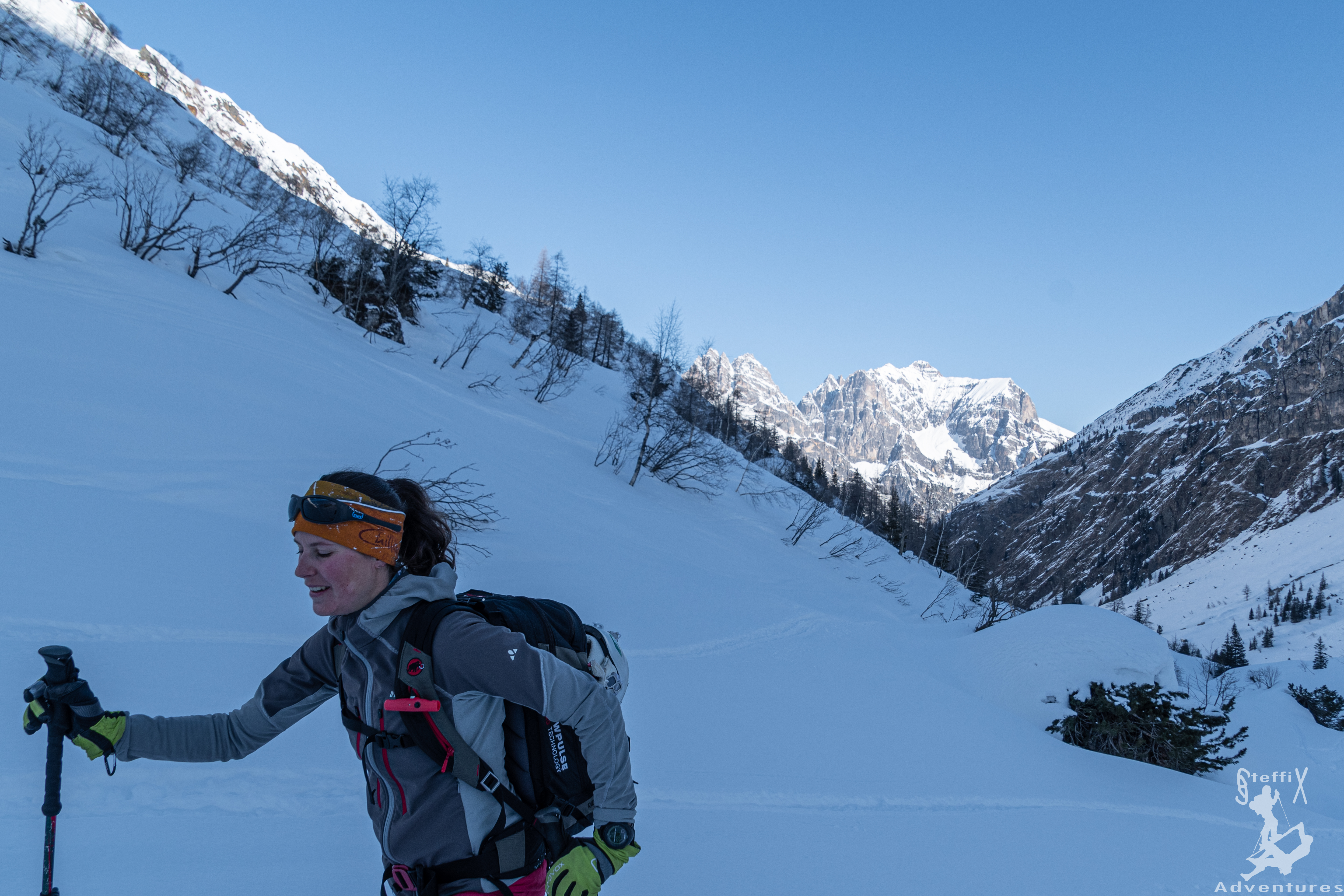 Der neu gefallene weiche Pulver lag auf der alten, mittlerweile gut gesetzten Schneeschicht und vor allem oben kam man so gut wie nie bis auf die Altschneedecke durch. Erst unten spürte man den alten und bereits etwas härteten Schnee, aber es war nie störend. Wir suchten uns unseren Weg durch die Variante und hatten sogar noch ein kleines Abenteurer in Form einer recht ausgesetzten Querung mit dabei. Outdoor-Herz was willst du mehr? Unschwierig ging es dann über die letzten Hänge und über die Forststraße wieder hinaus zum Parkplatz. Hier wartete bereits das Parkplatzbier auf uns und die Sonne ließ es uns richtig schmecken. Grandioses Wochenende mit toller Gesellschaft!