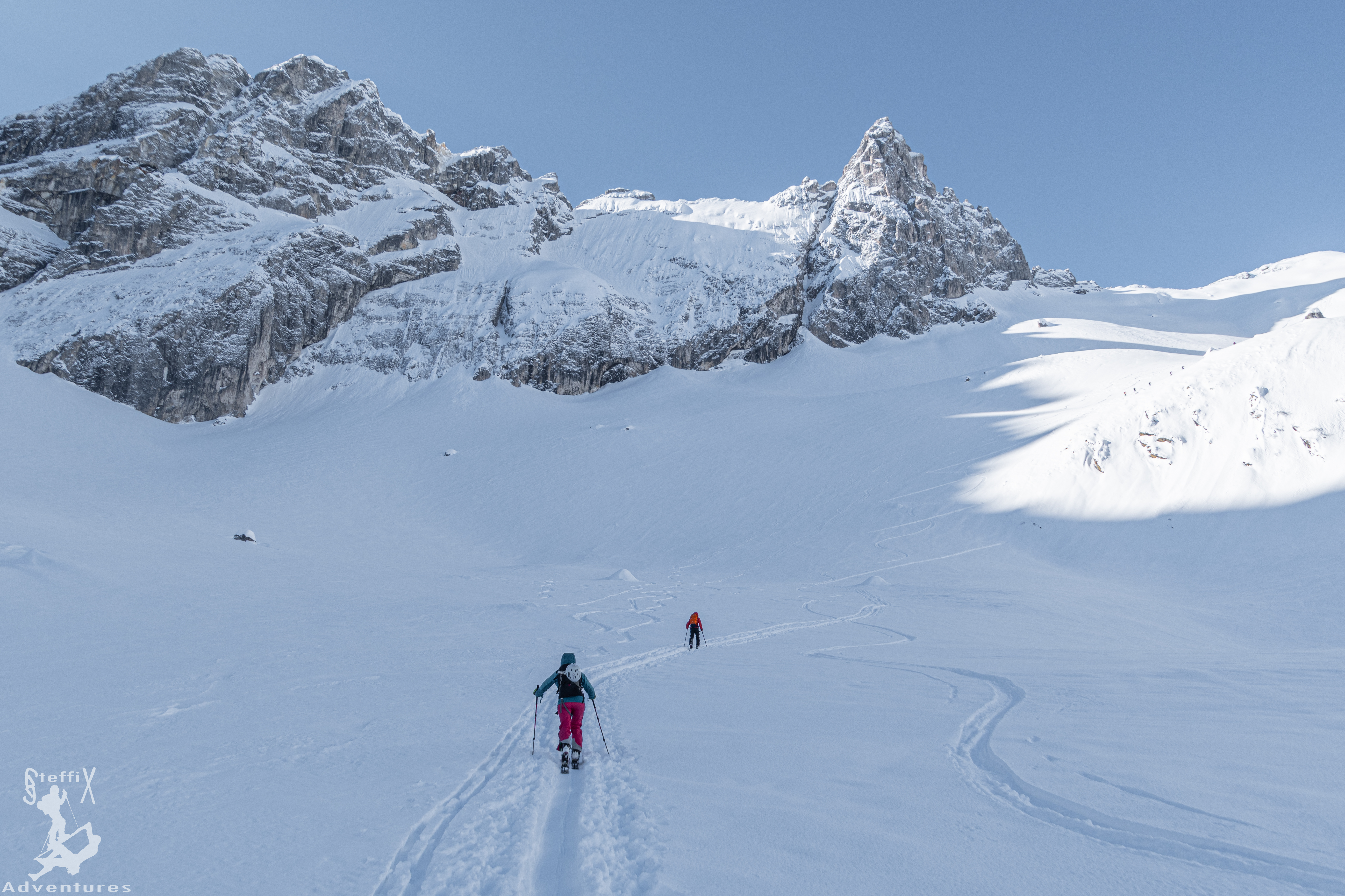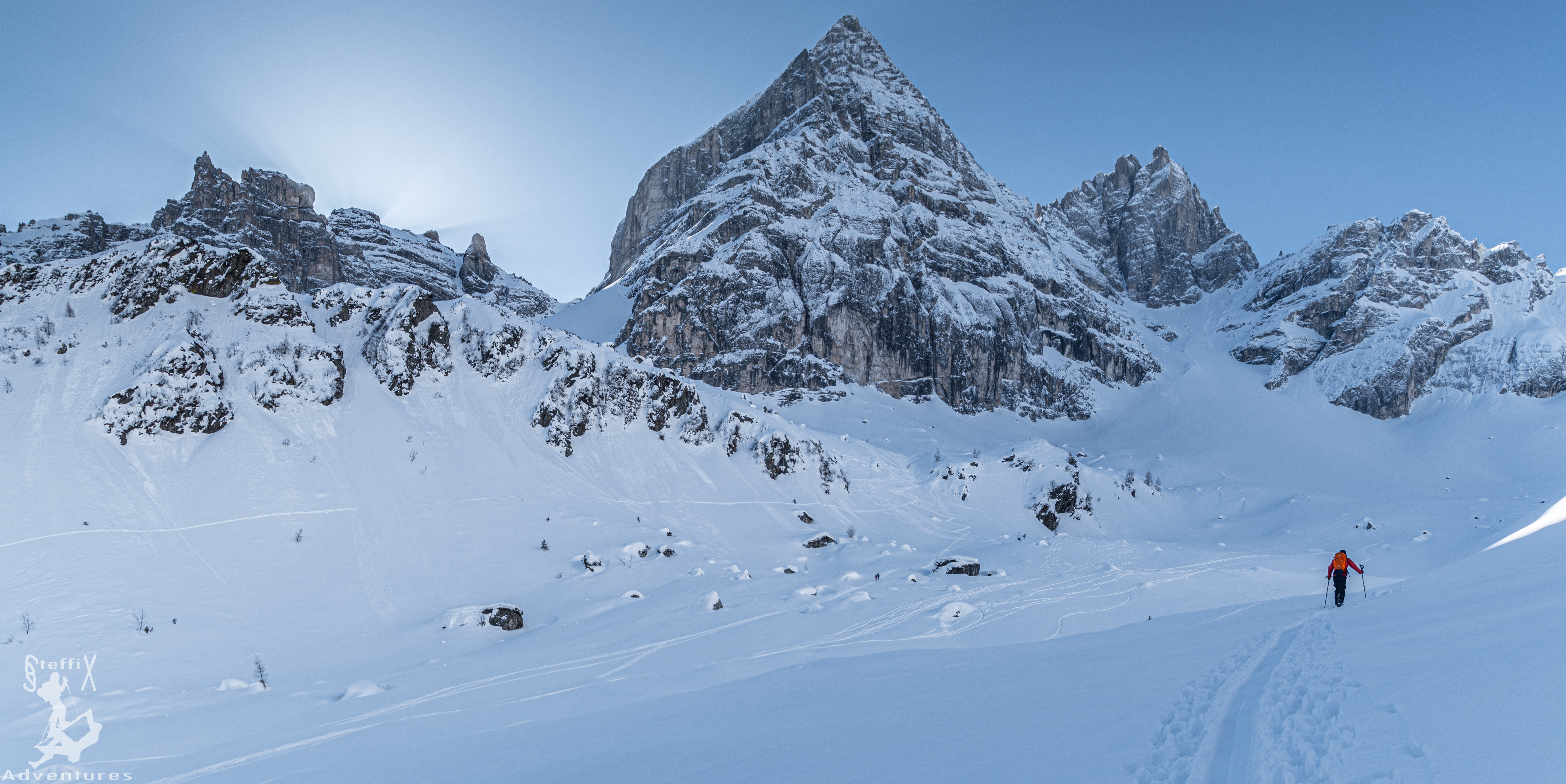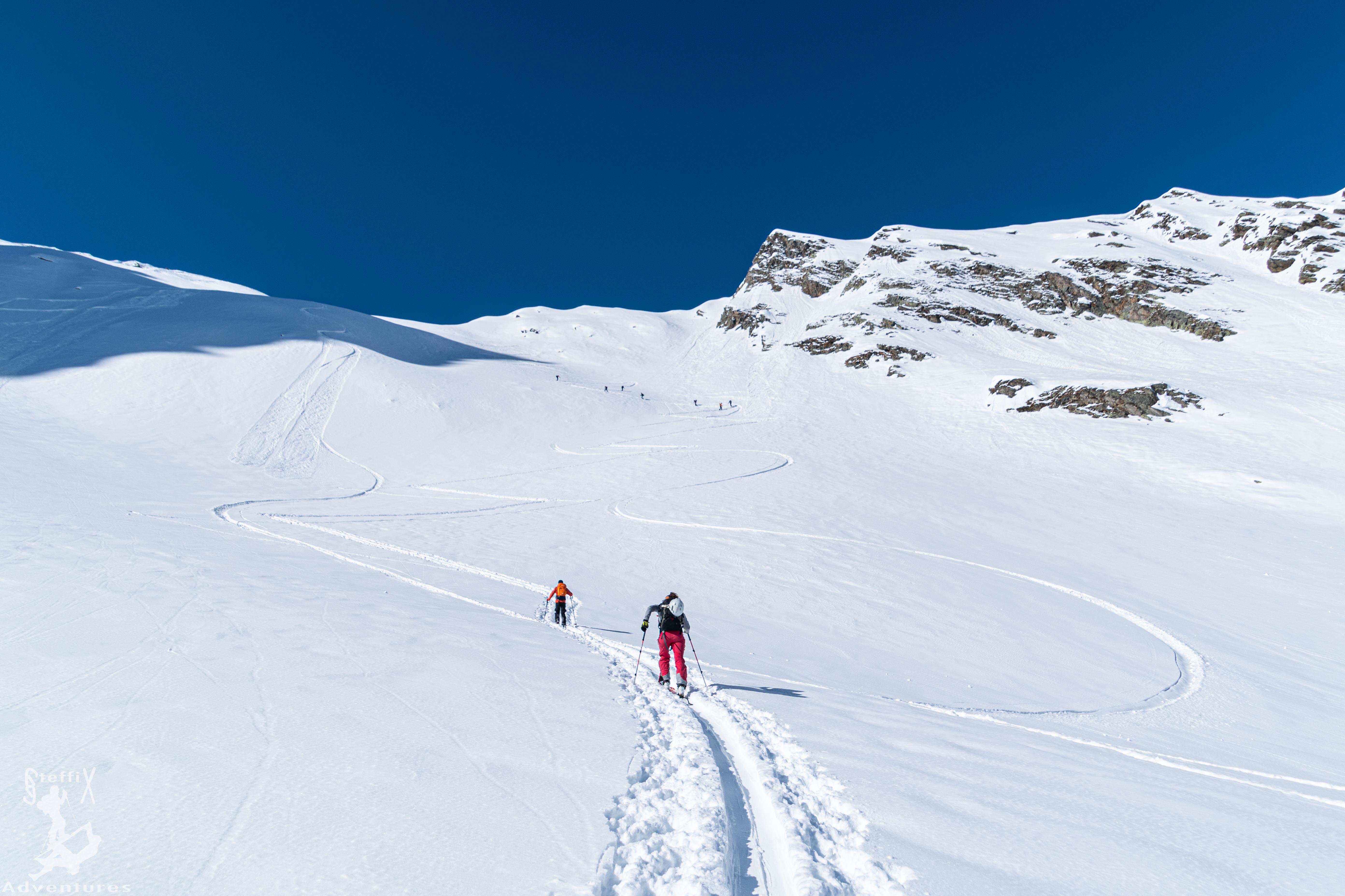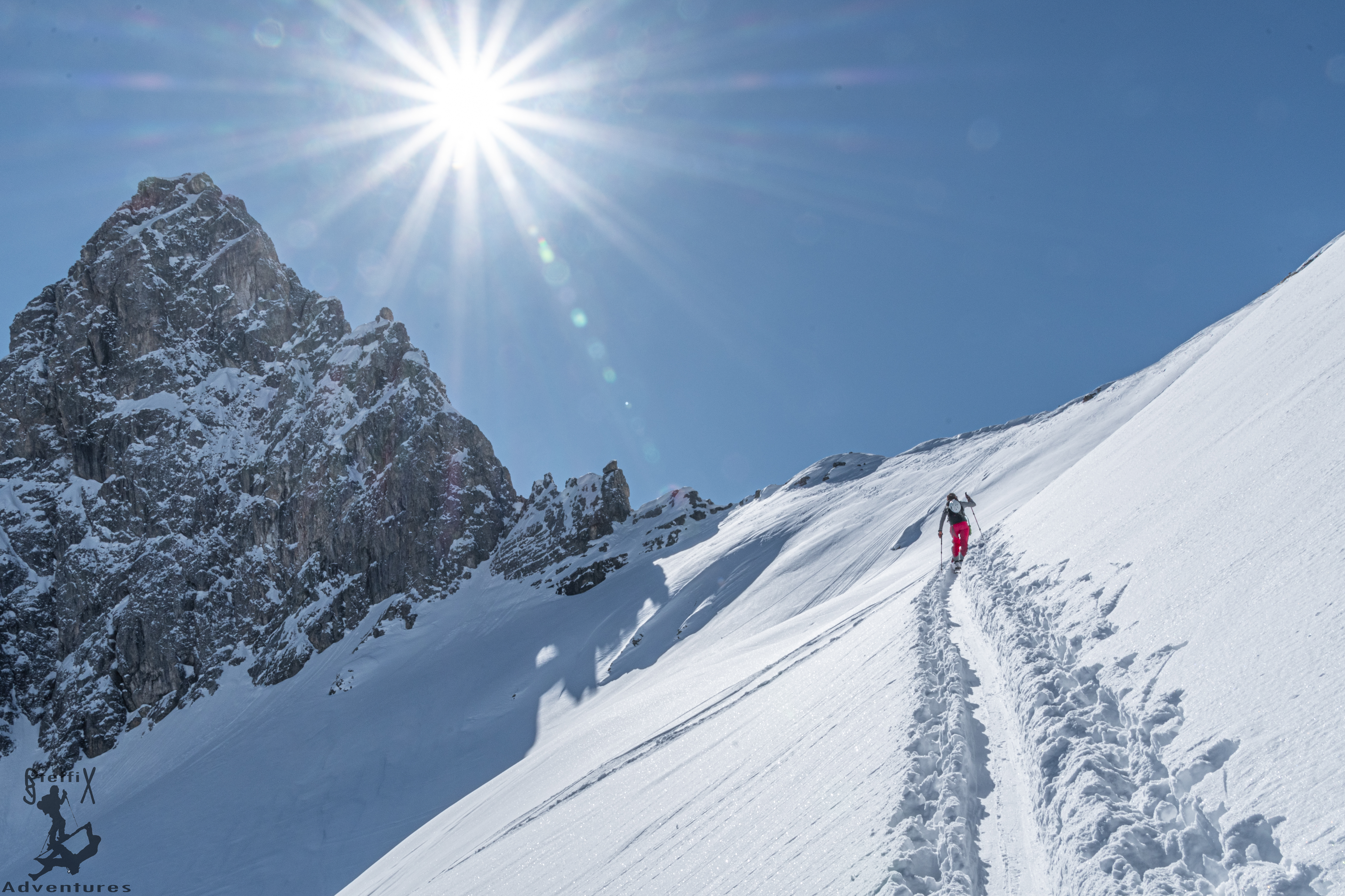 Schneefall am Freitag und Top-Wetter für das Wochenende waren angesagt: Eine bessere Kombination gibt es wohl nicht. Samstag ging es für uns noch in den Karrer Klettergarten, um die Finger langsam an das Ende des Winters zu gewöhnen. Sonntag wollten wir dann aber doch die Ski nochmal unter die Füße schnallen. Pepi scoutete – fleißig wie er ist – bereits am Samstag, wo es noch den ein oder anderen Pulverhang geben könnte. Am Sonntag ging es in der Früh, wie schon so oft diesen Winter, über den Brenner nach Matrei raus und weiter ins Gschnitztal. Ziel für heute war der Pflerscher Pinggl (2767m), dessen Ausgangspunkt am Gasthof Feuerstein der Start einiger Touren ist. Wir waren daher tatsächlich froh an diesem sehr geschäftigen Sonntagmorgen noch einen Parkplatz zu bekommen. Einige weitere Freunde waren bereits eine halbe Stunde vor uns gestartet und das Tagesziel war sie bis zum Gipfel einzuholen. Die Tour startete gemütlich in das Sandestal und nach ein paar Höhenmetern erreicht man das gewaltige Tal unterhalb des Tribulaunhauses. Der Gschnitzer und Pflerscher Tribulaun thronten beim Anstieg um die Wette und zusammen mit den noch flachen Sonneneinfällen war es ein beeindruckendes Bild.