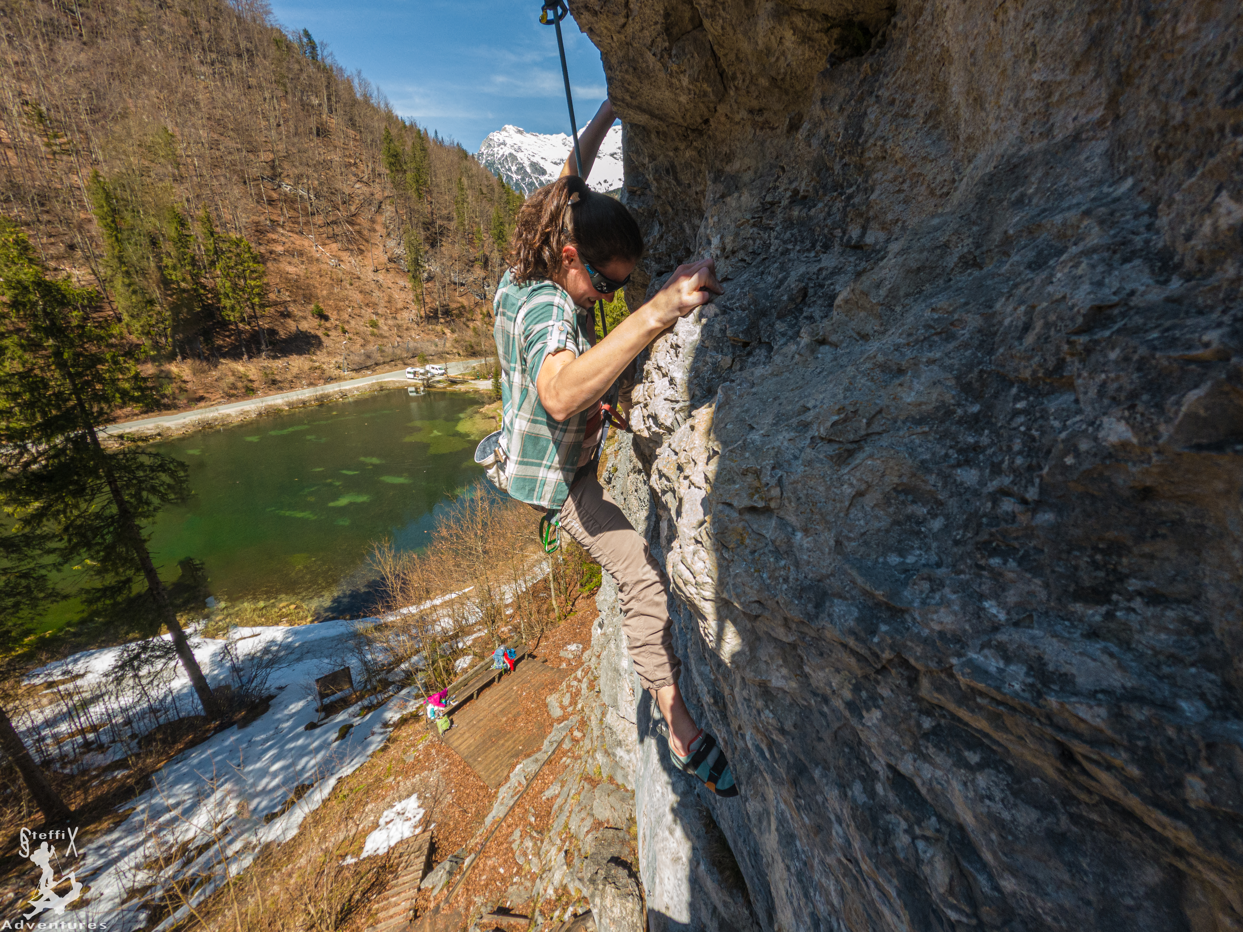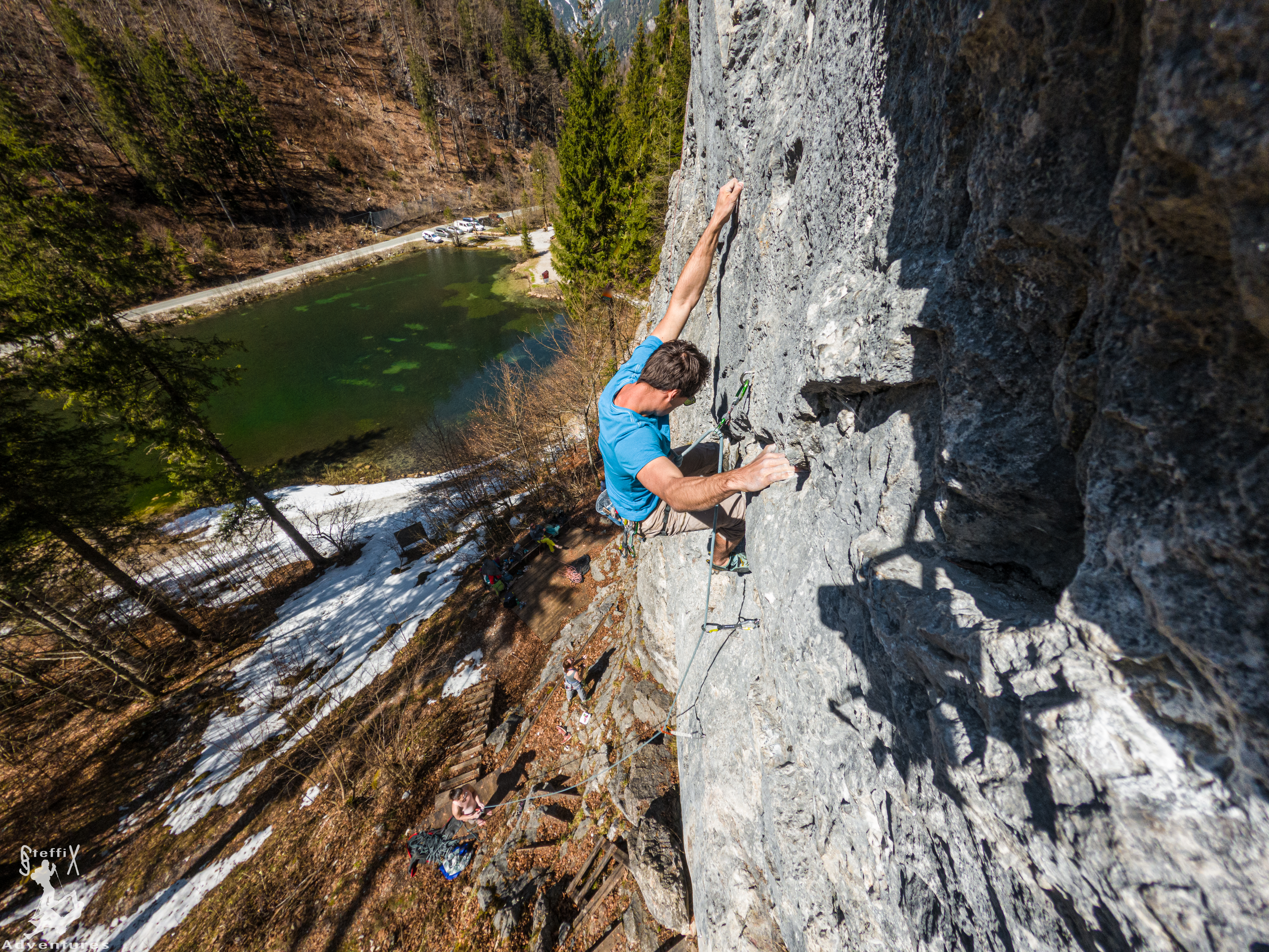 Wir wollten unbedingt mal wieder eine Nacht in unserer Josi verbringen und entschlossen uns daher ein Kletterwochenende zu planen. Dafür stand zunächst die Frage nach dem „Wohin?“ im Raum. Nach ein wenig Recherche im Kletterführer Tirol sprang uns das Gebiet Wiesensee in der Nähe von Hochfilzen ins Auge. Idyllisch an einem kleinen See gelegen, machte auch die Umgebung dort einen schönen Eindruck und wir hofften dort eine Schlafmöglichkeit zu finden. Samstagvormittag ging es los und wir kamen als erste an dem See an. Früher hätte es auch keinen Sinn gemacht, da sich erst allmählich die Sonne in die bereits vom Parkplatz aus sichtbare Wand schob. Wir machten uns auf den kurzen Zustieg, zählten die Forellen im See und waren dann froh endlich mal wieder Fels unter den Fingern zu spüren. Der Klettergarten ist sehr schön hergerichtet und wir genossen mit 4 anderen Seilschaften den schönen Tag. Es gab einen kurzen Schreckmoment, als ein ca. kopfgroßer Stein am Wandfuß einschlug, glücklicherweise aber niemanden traf. Der Fels war stellenweise zwar noch etwas brüchig, wirklich erklären wo der Fels herkam, konnten wir uns allerdings nicht.