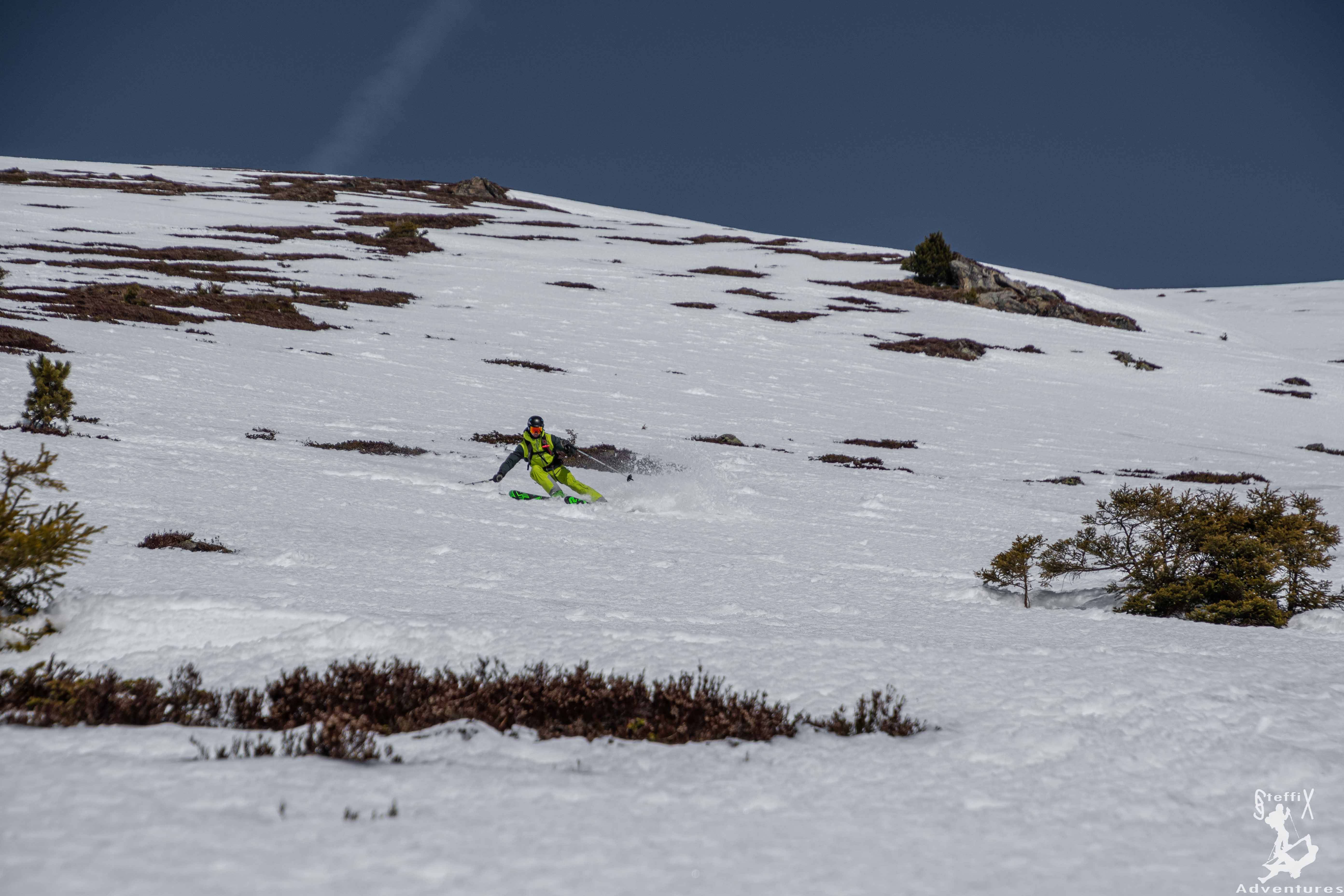 Ja, diesen Winter kommen wir nicht ganz so oft in den Schnee wie wir es gerne hätten, geschweige denn wie im Vergleich zum letzten Jahr… Aber was solls! So sind die Male an denen wir dazu kommen umso spezieller und bleiben in Erinnerung! Felix‘ Eltern konnten uns ein 2 Stunden Fenster freispielen, so dass wir die noch guten Schneebedingungen für einen kurzen, aber schönen Run vom Hoadl der Axamer Lizum, hinunter zur Kemater Alm nutzten. Lässig war, dass wir alles mit öffentlichen Verkehrsmitteln bzw. zu Fuß realisieren konnten. Der Süd-West-ausgerichtete Hang wird häufig befahren, um im Winter schneller und leichter zur Adolf-Pichler-Hütte zu gelangen, um die Hänge des Gamskogel oder eines der Rinnensysteme rund um die Schlicker Seespitze zu erreichen. Meist ist man dann aber früh am Tag unterwegs und der Hang ist nicht selten „pickelhart“. Wir fuhren ihn erst gegen Mittag und können sagen, dass er bei Firn ein richtiger lässiger Hang zum Gas geben ist. Eigentlich nichts besonderes, für uns an diesem Tag aber ein super Erlebnis und genau was wir gebraucht haben 🙂 Die großen und langen Nummern kommen wieder 🙂