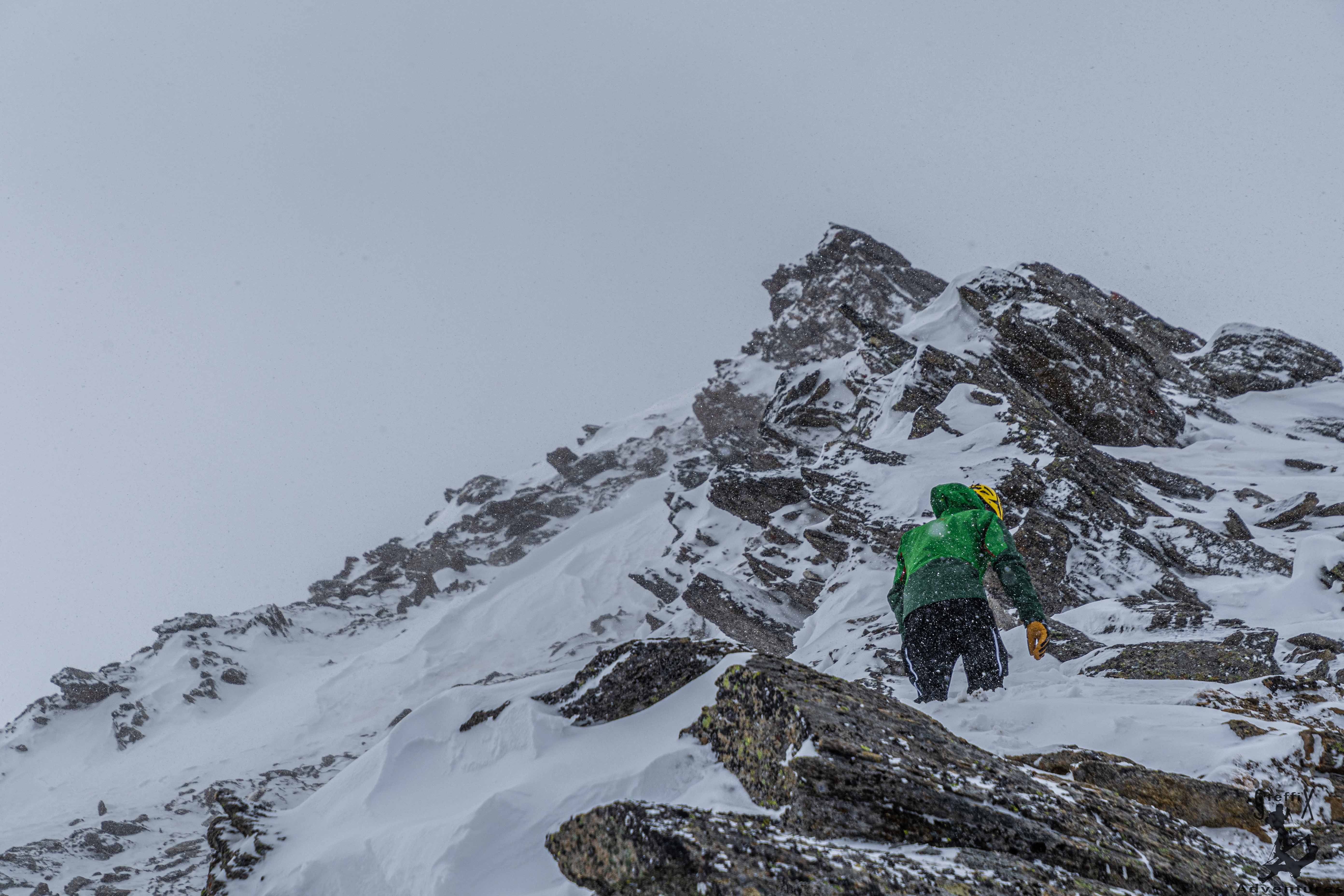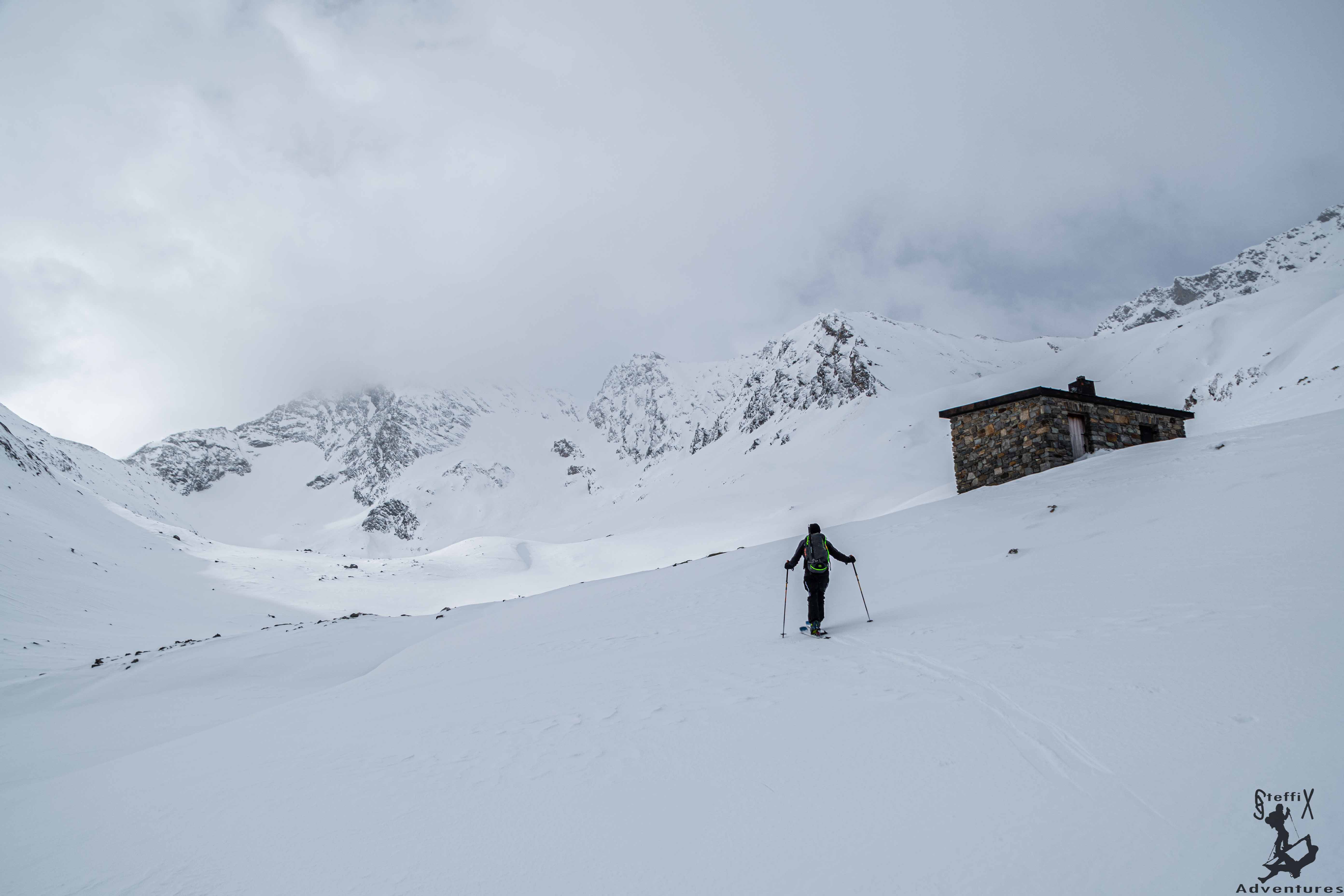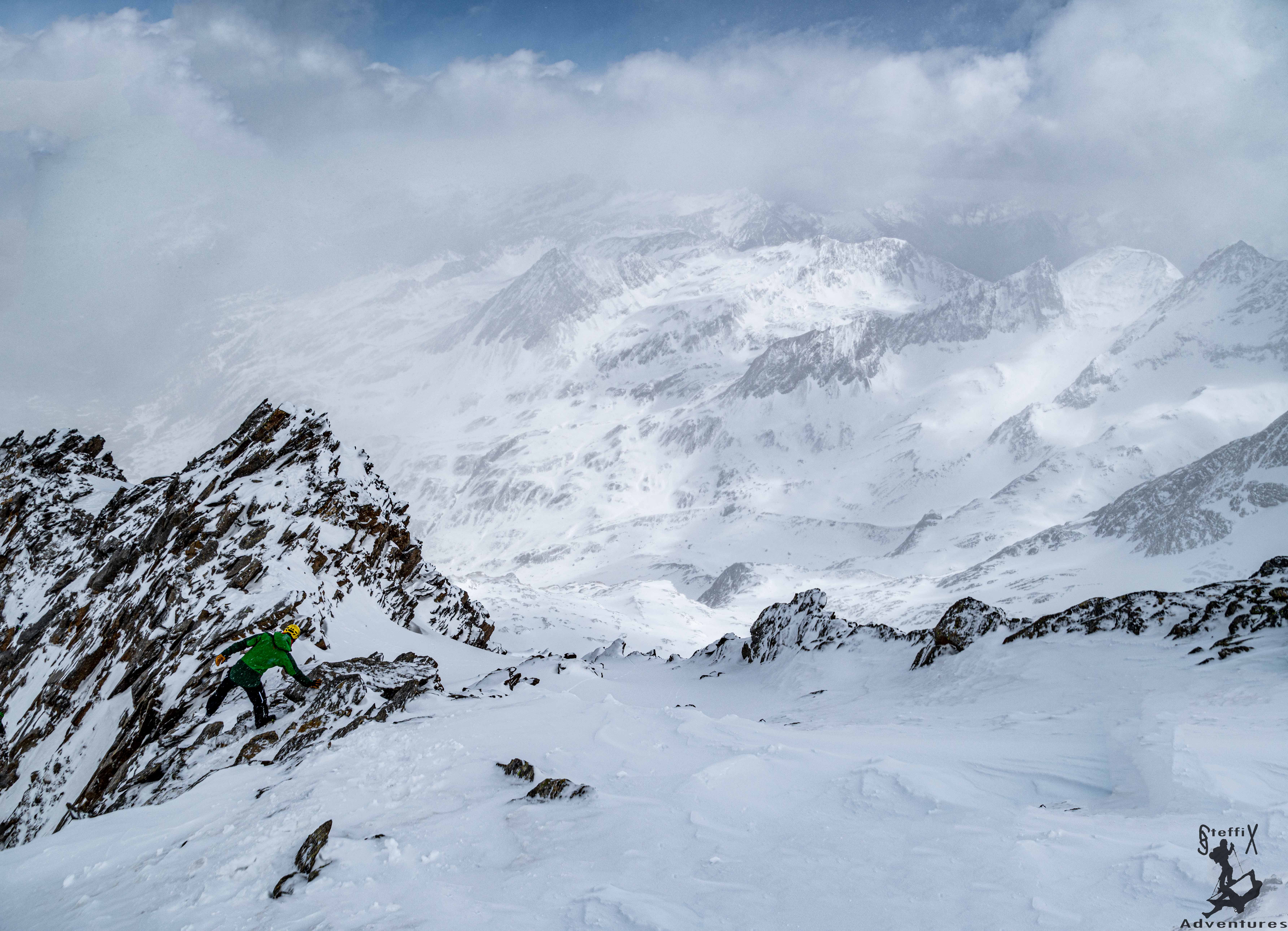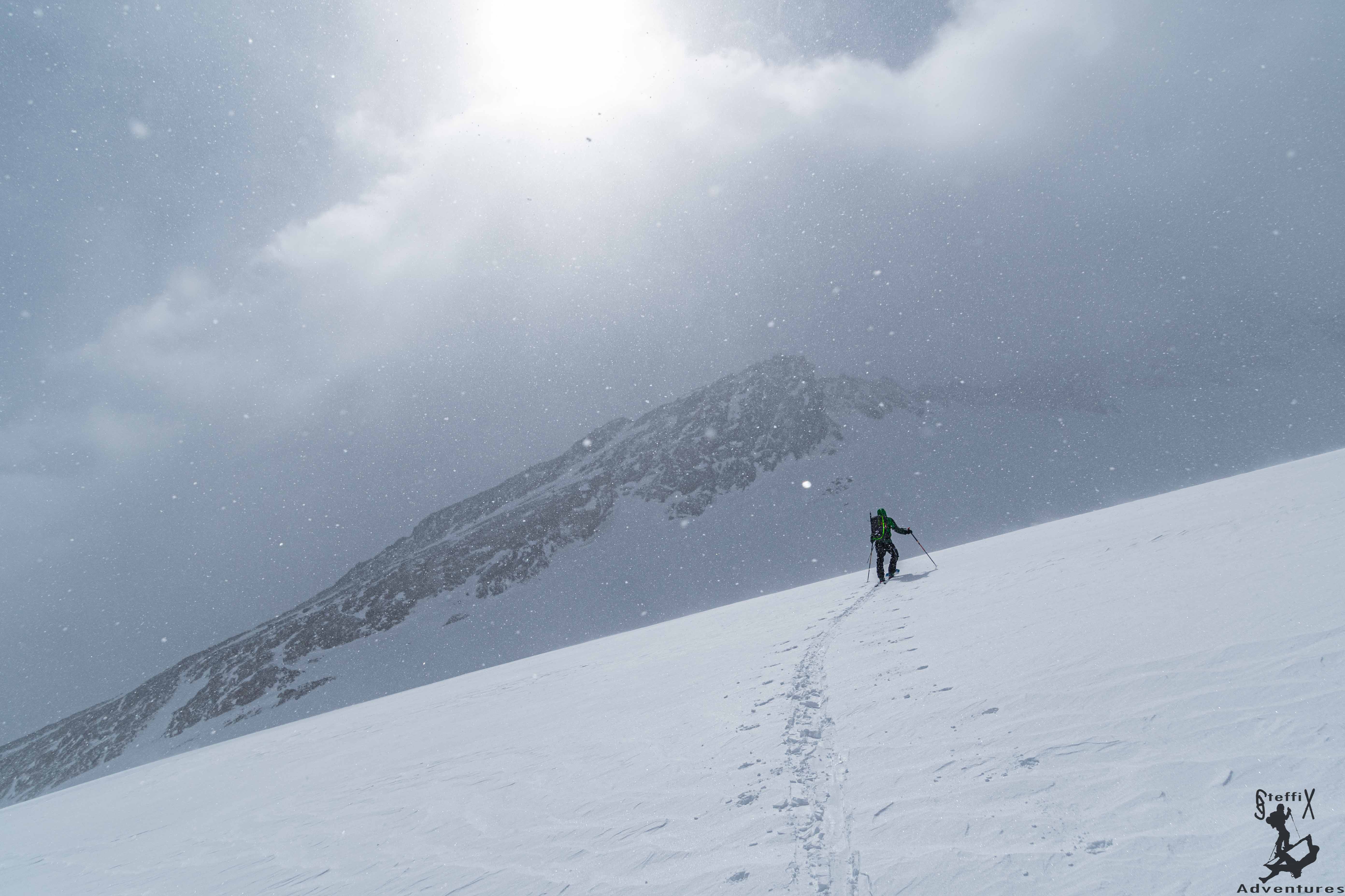 Das Wetter sollte im Oberland noch eher schön werden, weswegen wir uns die Tourengegen rund um Obergurgl genauer anschauten und ursprünglich den Granatenkogel (3304m) ins Auge fassten. Sehr früh starteten wir in Richtung Partyhochburg Sölden und weiter nach Obergurgl, wo wir an Festkogelbahn parkten und uns an die ersten Höhenmeter über die noch nicht geöffnete und teilweise sehr eisige Skipiste machten. Nach kurzer Zeit erreichten wir die Abzweigung nach Nord-Osten ins Ferwalltal und es eröffnete sich das sehr schöne und zunächst nur mäßig steile Gelände des Ferwallgletschers. Das Wetter spielte noch nicht so ganz mit und so zogen immer wieder dichte Wolkenfelder umher, die wir eigentlich eher im Unterland erwartet hätten. Bei der alten Zollhütte angelangt viel dann der Entschluss, den Granatenkogel für bessere Verhältnisse aufzuheben und heute „nur“ die Essener Spitze (3200m) zu machen. In der Nordvariante des Granatenkogels lag ein großes Schneebrett und die Wolken hüllten den Grat in ihre wabernde Masse. Folglich ging es von uns eher linkshaltend vom Östlichen Ferwallferner über die steile Schlüsselstelle hin zum Grantenferner. Hier zog es nochmal richtig zu und es kam sogar Schneetreiben auf, was uns in unserer Entscheidung nochmals bekräftigte. Die letzten Meter bis zum Skidepot versprachen wenigstens hier oben halbwegs Spaß bei der Abfahrt, da der Schnee sonst leider schon nicht mehr allzu gut war. Mit Pulverschnee hatte aber keiner von uns mehr so wirklich gerechnet. Beim Depot angekommen, machten wir uns an die letzten Meter auf den Grat der Essener Spitze, der bei dem rieseligen Schnee Konzentration abverlangte, aber gut machbar war. Der Gipfel selbst ist neben der Aussicht (die heute mäßig, aber auf Grund der Wolken trotzdem beeindruckend war), recht unspektakulär, da es kein Gipfelkreuz gibt.