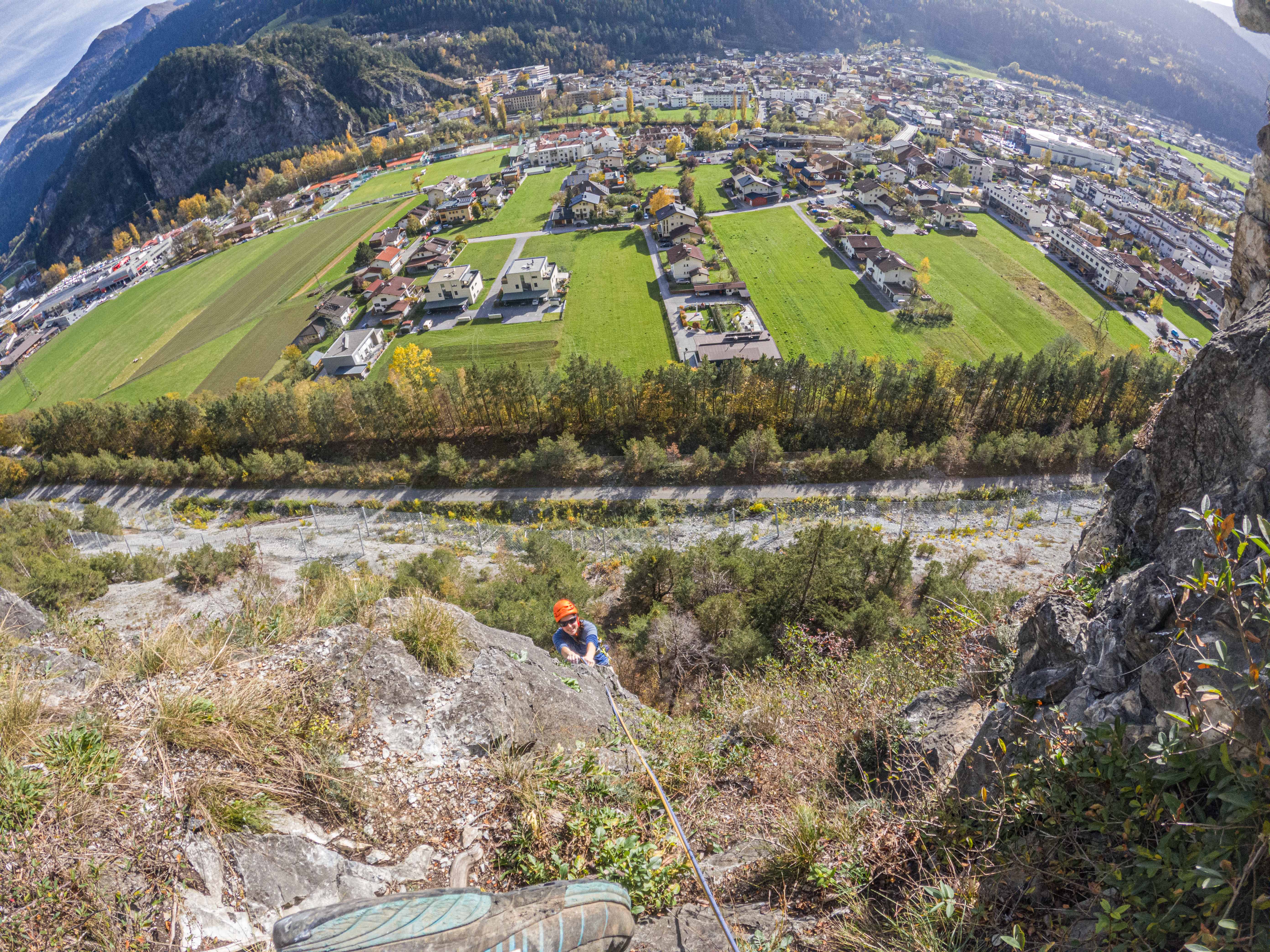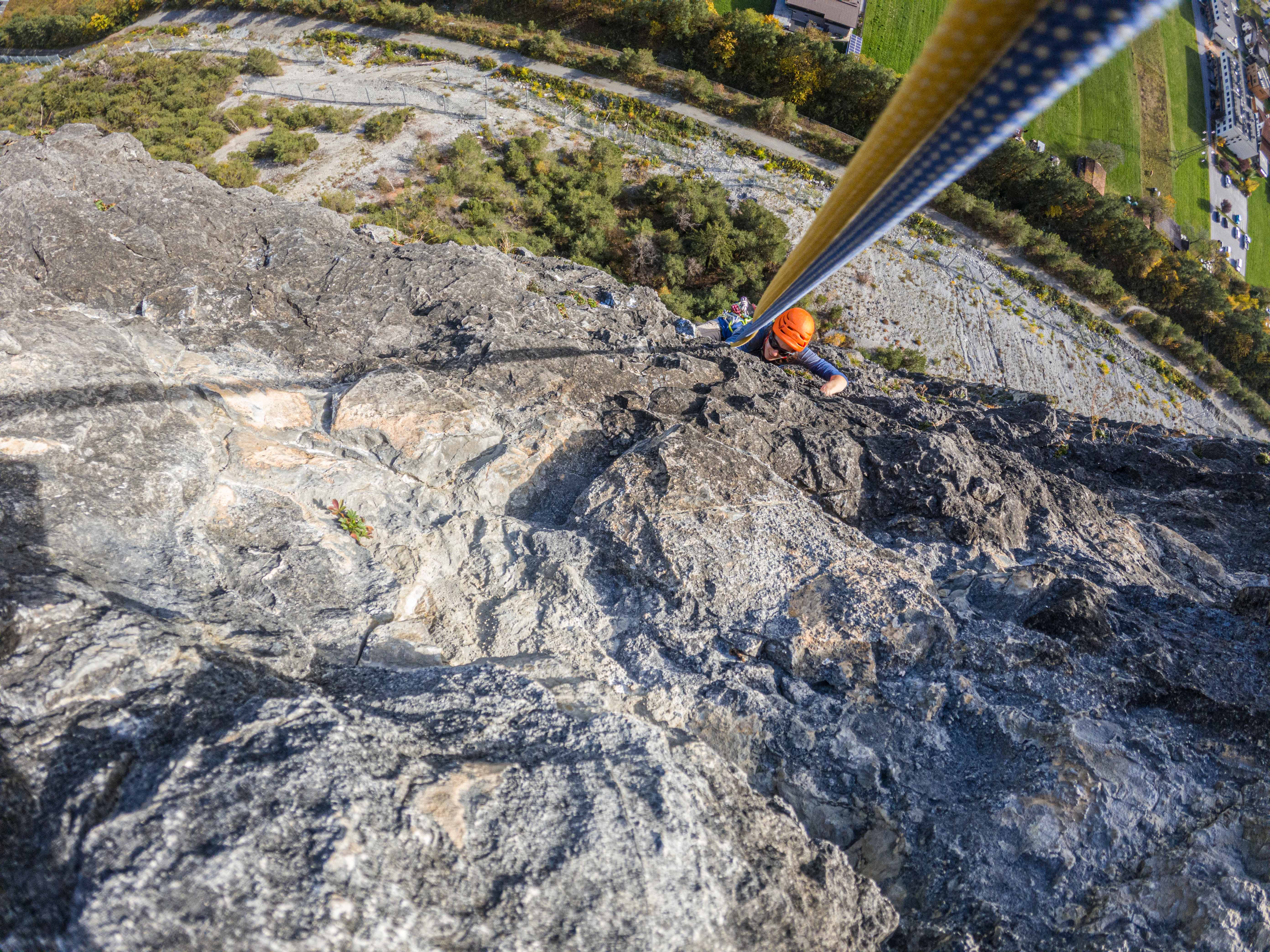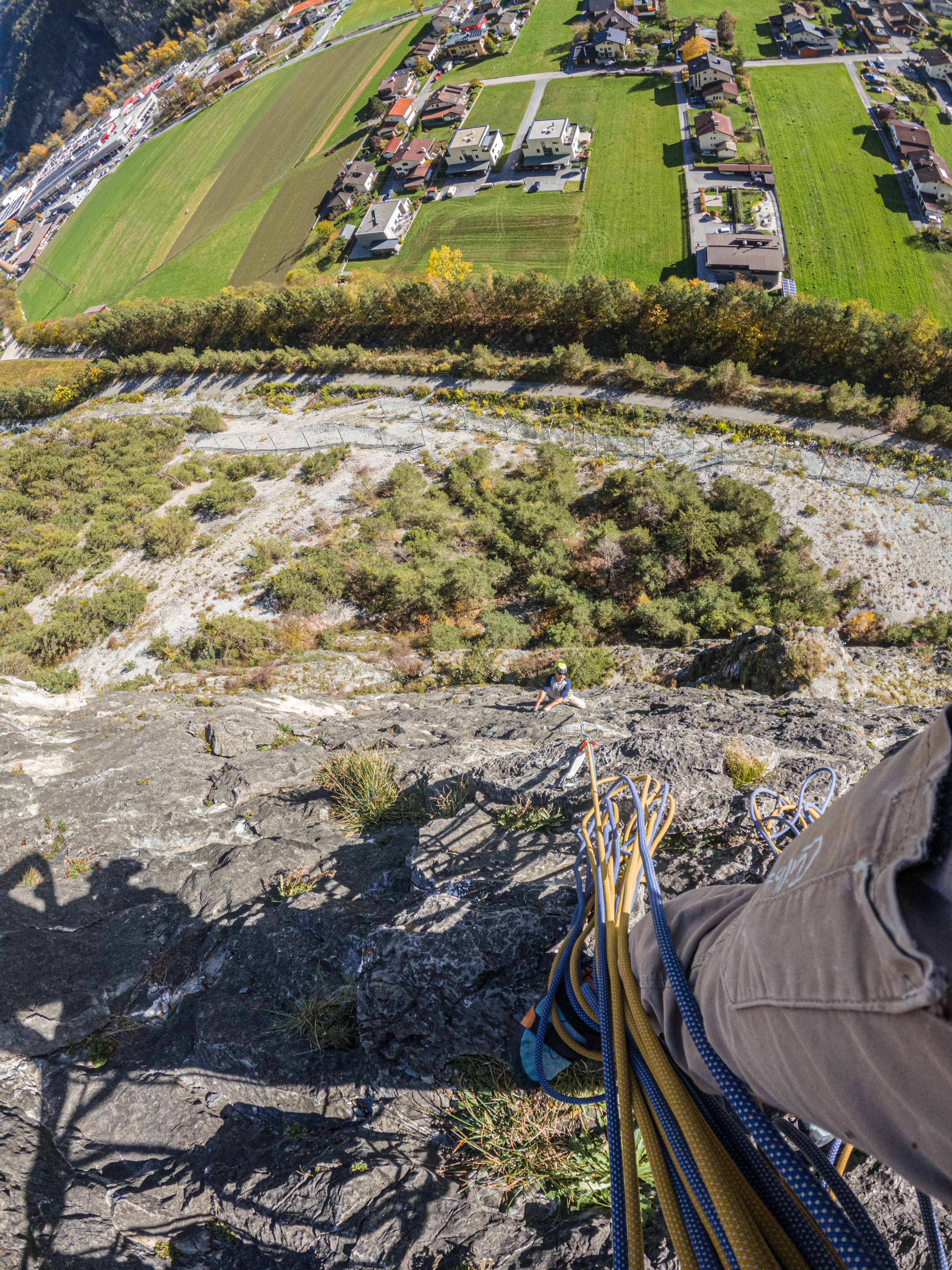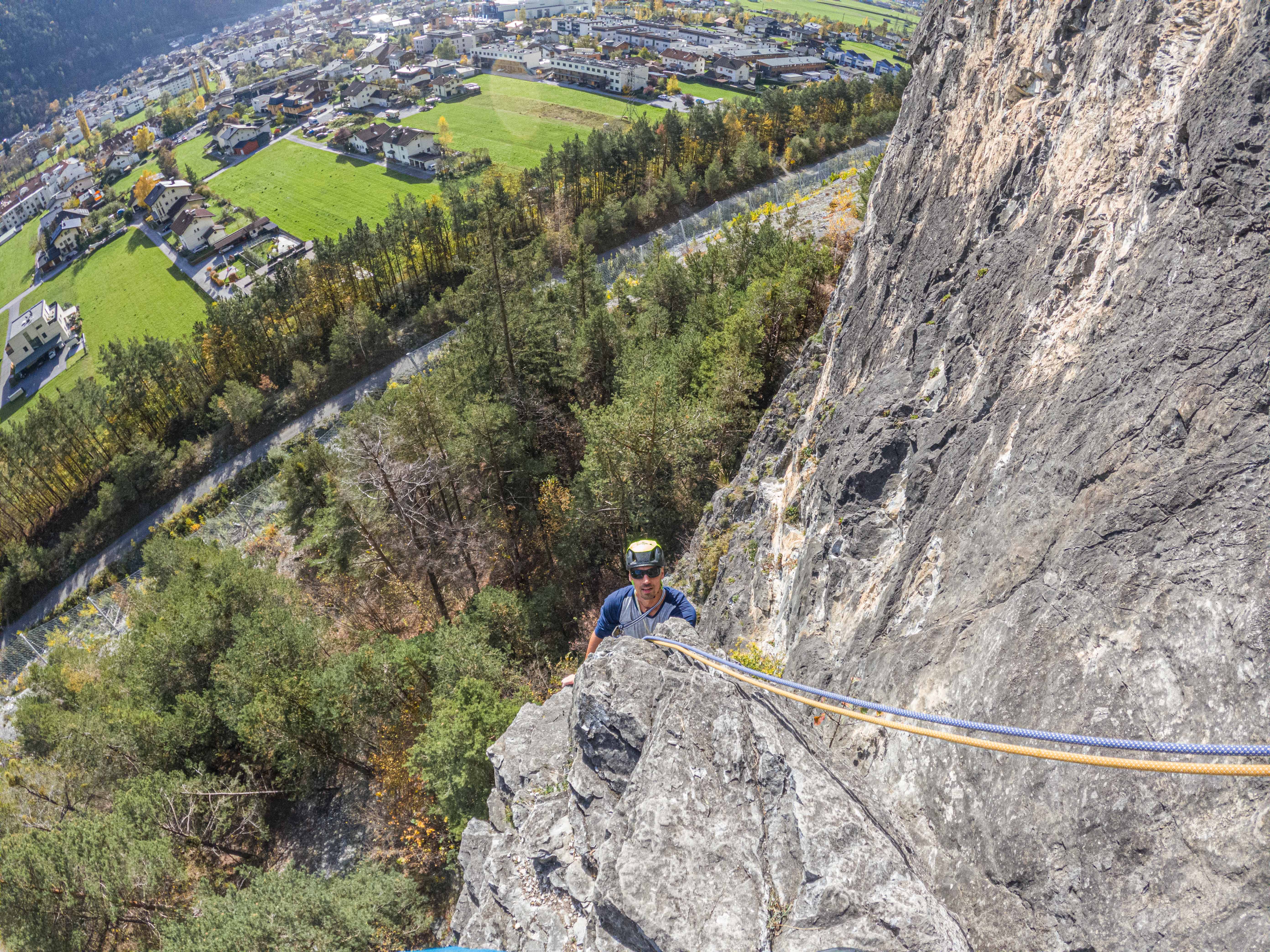 Die Tour ist sehr gut abgesichert und kann als Plaisir-Kletterei bezeichnet werden, wenn auch sie an manchen Stellen gar nicht wenig forderte (vielleicht waren wir aber auch einfach aus der Übung). Die erste Länge ist weniger schwer als Gewöhnungssache, da sie hauptsächlich Kletterei an einer gutgriffigen Kante fordert. Länge zwei ist dann gleich einmal etwas technischer und verlangt wesentlich mehr Bewegungsverständnis und auch schon ein wenig Schmalz – klassisches Ausdauerproblem. Länge drei ist dann sehr abwechslungsreich und besonders auch durch die Länge nicht zu unterschätzen. Die im Topo angegebenen 15 Schlingen reichen nicht aus, wenn jede Möglichkeit auch mit einer Exe versehen wird! Länge vier ist dann nochmal Genuss, gewürzt mit kleinen Dächern. Dann folgt eine Graslänge, es macht Sinn gleich bis zum Stand nach der Seilversicherung zu gehen und von hier den/die NachsteigerIn in Länge vier nachzusichern. Für die letzte Länge stehen 3 verschiedene Varianten zur Verfügung, von links einfacher (Pegasus) über Mitte (Unterländer) und ganz rechts etwas schwerer (Mon Cherie). Wir entschieden uns für die Mon Cherie und kletterten so auch noch eine Länge auf etwas abgespecktem Fels, die restliche Route weist eine absolut gute Felsqualität auf. Für uns eine super Tour, um wieder „in Tritt“ zu kommen und die Lust auf mehr machte. Wir brauchen wohl demnächst wieder einen Tages-Baby-Sitte 😊