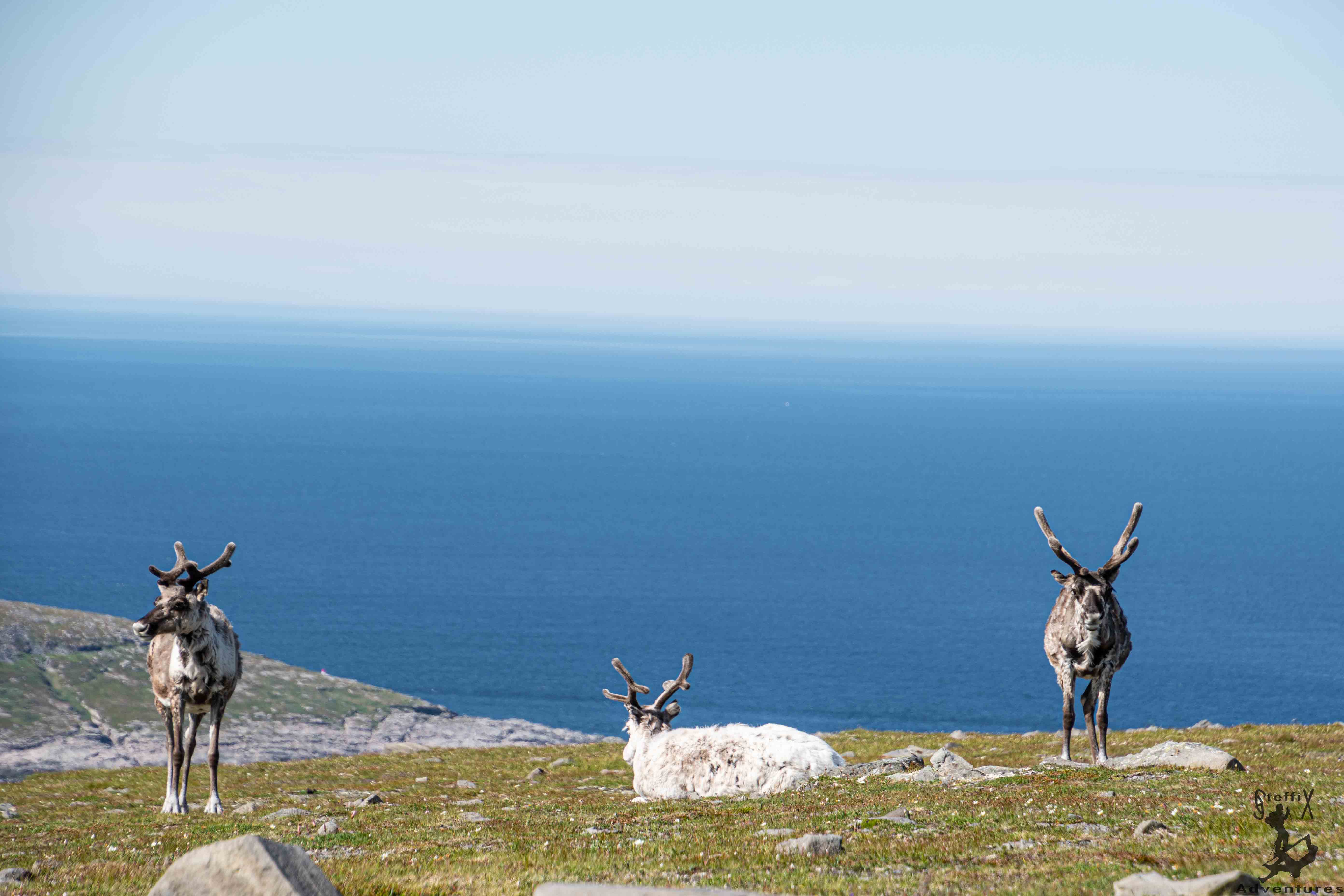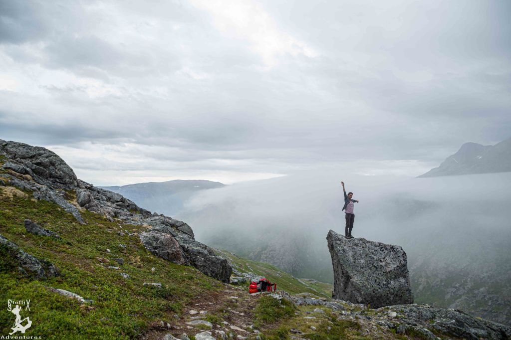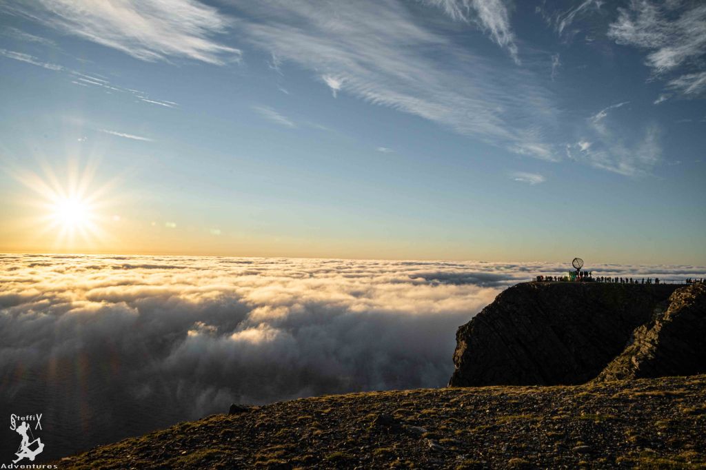 Da das Wetter nicht so richtig in Schwung kommen sollte und am Nordkap das Wetter in wenigen Tagen ganz gut sein sollte, beschlossen wir ein paar Reisetage einzulegen und in Richtung Mageroya zu fahren. Wir fuhren den schnellsten Weg über Schweden und Finnland bis nach Norwegen und überquerten den Polarkreis um 22:00 Uhr bei Sonnenschein. Bei Karasjok machten wir einen kurzen Reisestopp und besuchten das Sami-Freiluftmuseum. Etwas Kulturelles zwischendurch ist immer schön. Unser Spatz war das Vorzeigereisekind, ein paar vereinzelte Boulderblöcke ermöglichten uns eine bewegte Pause und ansonsten ging es bis auf ein paar nicht enden wollende Schotterstraßen zügig in Richtung Norden um tatsächlich rechtzeitig zum richtig angekündigten Wetterhoch am Nordkap zu sein. Wir waren sogar früher als geplant dort und wollten schon fast umdrehen, da alles voller Nebel war und man nicht mal das Anmeldehäuschen sah. Wir beschlossen dann dennoch zu zahlen und es auf gut Glück zu probieren und wurden belohnt, die 20 Höhenmeter mehr bis zum Parkplatz waren ausreichend und wir waren über der Nebeldecke und hatten einen wolkenlosen Himmel. The little one war auch wach und hat mit uns die Mitternachtssonne über dem Nebelmeer genossen – was für ein Glück, kaum zu fassen. Man darf am Parkplatz schlafen und das haben wir genutzt. Gingen am Morgen frühstücken (lange konnten wir nicht schlafen, da es so heiß in der Josi wurde) und besuchten das Museum (Der Eintritt gilt für 24h). Wir konnten unser Glück kaum fassen, dass wir es echt geschafft hatten bei unglaublich warmen Temperaturen und wolkenlosen Himmel am Nordkap zu stehen. Wir toppten unser Erlebnis noch mit freiwilligen baden in einem See auf Mageroya. Auch wenn Steffi bereits das zweite Mal am Nordkap war, hat es sich auch für sie sehr gelohnt, denn die gesamte Gegend davor und insbesondere Mageroya ist für sich sehenswert, wobei wir natürlich das Wetterglück schlechthin hatten und so die Farben unglaublich schön wirken konnten.