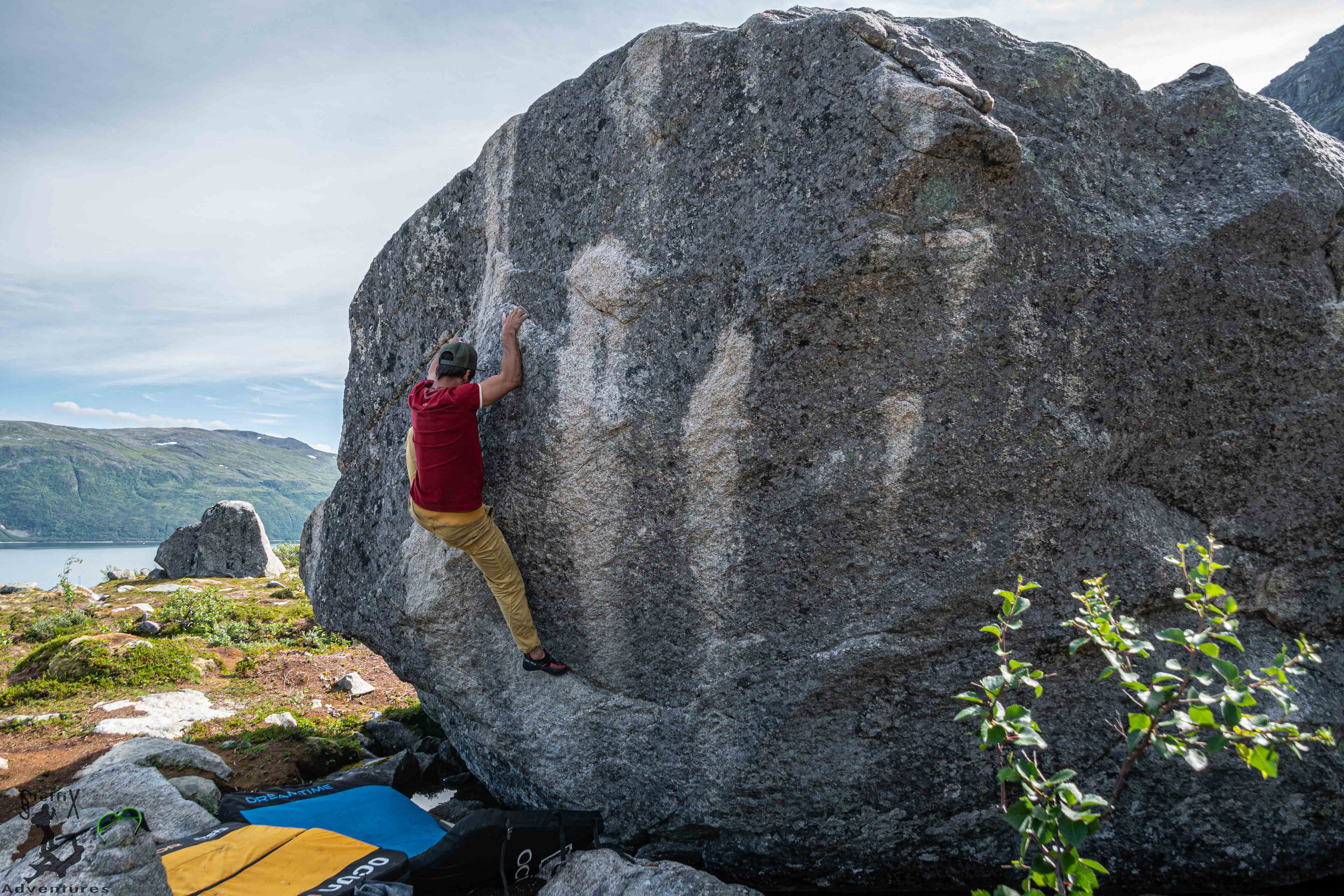 Von nun an ging es in Richtung Westen und Süden. Der Norden hat einen unglaublichen Reiz und das Wetterhoch blieb uns noch etwas erhalten. So konnte Felix sein Angelhighlight (Dorsch größer als der Nachwuchs und Heilbutt vom Ufer) erleben und wir konnten die Mitternachtssonne nicht nur am Nordkap genießen. Wir waren nun so richtig im Reisefieber angekommen und konnten die Zeit immer mehr genießen, da konnte uns ein nicht auffindbares Klettergebiet dann auch keinen Strich durch die Rechnung machen – Corona dann allerdings doch (wir können uns bis heute nicht erklären, wo Felix sich angesteckt hat, vermutliche aber im Freiluftmuseum). An einem sehr freundlichen Campingplatz bei Alta haben wir aber auch diese Hürde hinter uns gebracht, Steffi hielt zum Glück die Stellung und konnte Mann und Kind versorgen. Das gute Wetter war mit dem gesund werden dann weg und so ging es etwas zügiger – die wahnsinnige schöne Gegend rund um Lyngen Alps hinter uns lassend – weiter in Richtung Tromso. Nach etwas Kultur wollten wir dann das kurze Wetterhoch auf Kvaloya zum Bouldern nutzen. Tolle Felsen, viele Moltebeeren und ein super schöner Schlafplatz (danke Christian und Kati) ließen uns Corona endgültig vergessen. Mit dem Wetter ging es unbeständig weiter (1-2 Tage ok, 4 Tage eher schlecht). Wir ließen uns weiterhin vom Wetter leiten und konnten viele schöne Eindrücke im hohen Norden sammeln, bevor es dann über Senja zu den Lofoten ging. Wir waren mittlerweile in der Hauptreisezeit angekommen und mussten so unplanmäßig teilweise am Fährhafen übernachten. Das Highlight war dann, dass wir kaum von der Insel Vaeroya runterkamen, aber auch hier fanden wir eine Lösung (retour auf die Lofoten und von dort nach Bodo) und meisterten das Problem auch mit Kind an Board.
