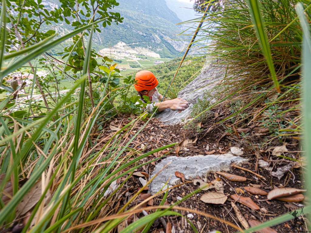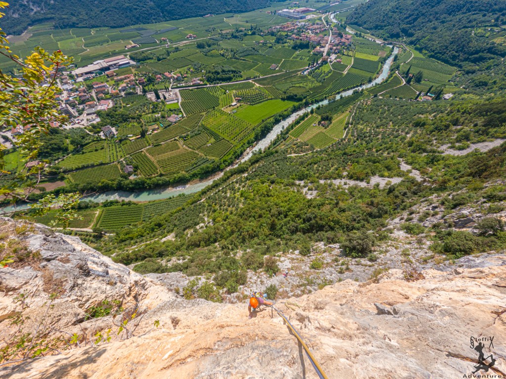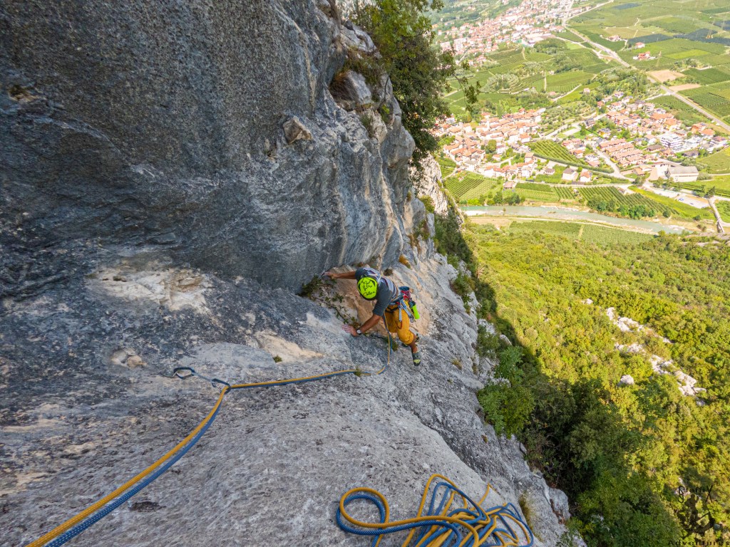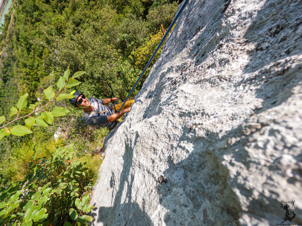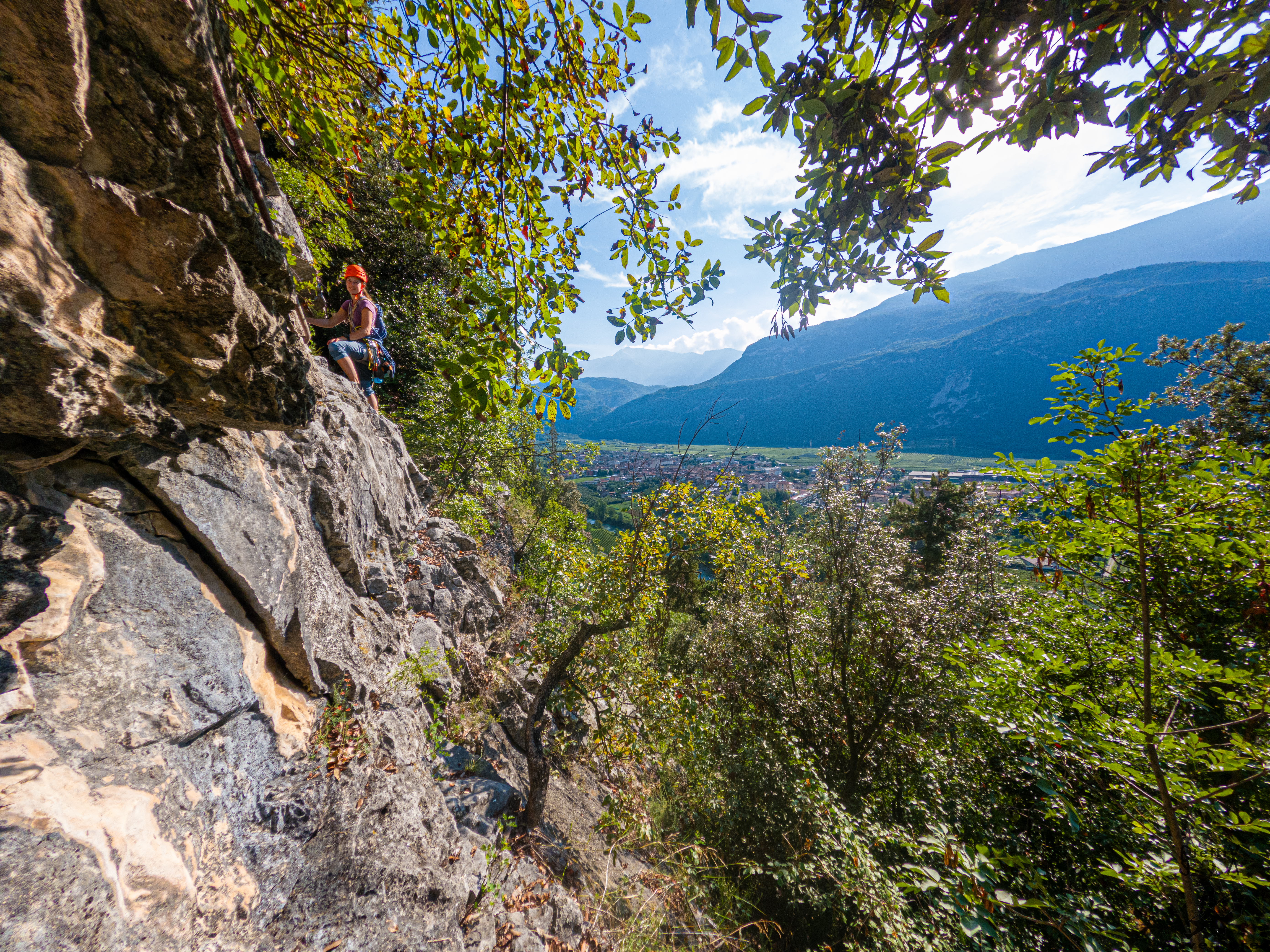 Frisch gestärkt ging es in der Früh an den für Arco etwas längeren Zustieg am Wandfuß entlang. Die Tour ist eine sehr gelungene Routenführung durch die oben immer röter werdende Wand. Schon die zweite Länge bietet nahezu athletische Kletterei, die bei Bedarf gut selbst abgesichert werden kann. Weiter nach oben kommend wird die Tour dann nochmal fordernder und bietet wieder athletische Kletterei an guten Griffen, bei der die Psyche unter Kontrolle gehalten werden sollte. Ist bei Hitze tatsächlich gar nicht immer so einfach. Der Abstieg geht dann problemlos über den Wanderweg und Klettersteig und die Sarche lockt wieder mit ihrer erfrischenden Kälte.