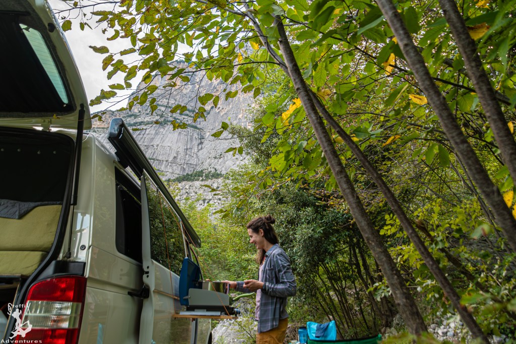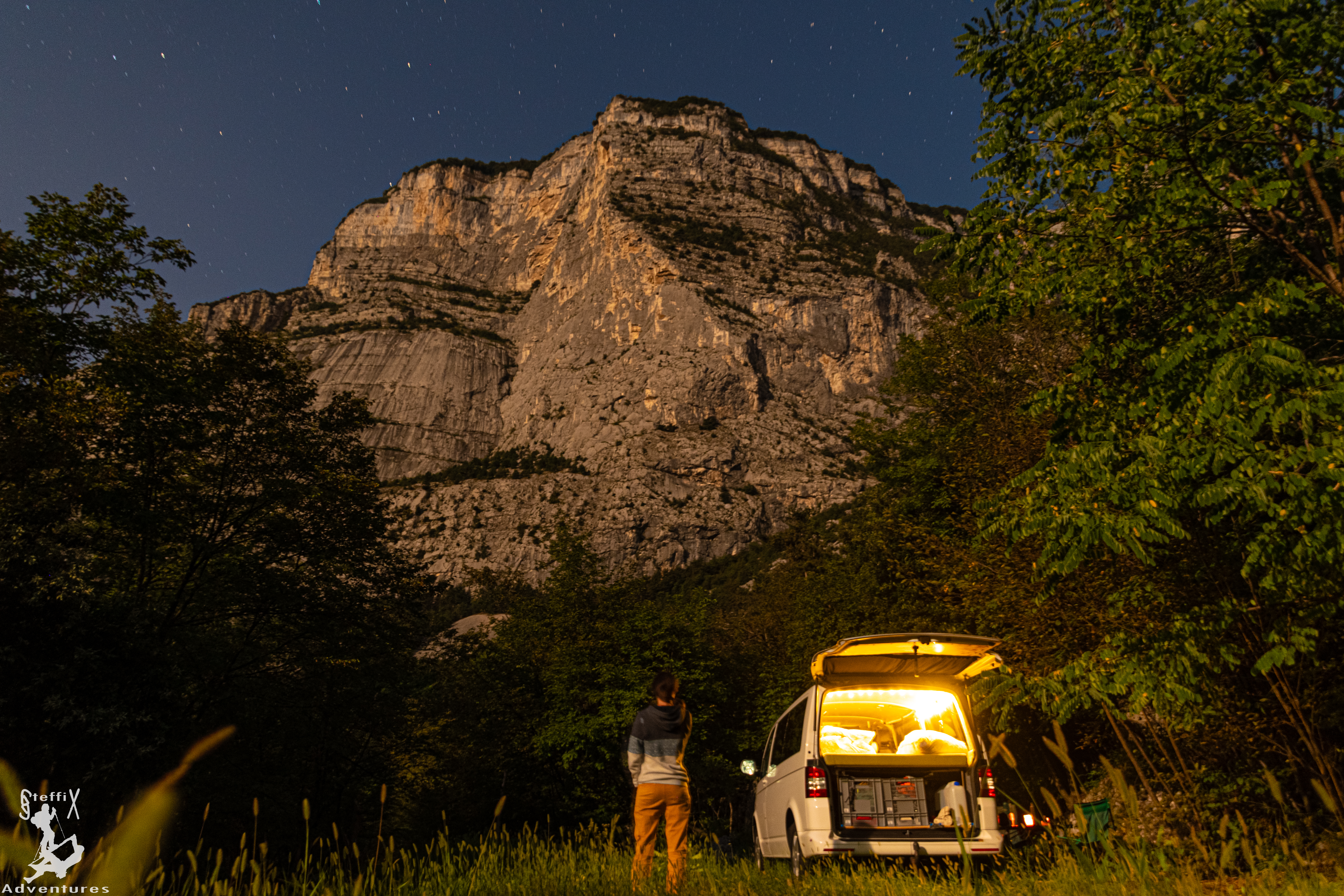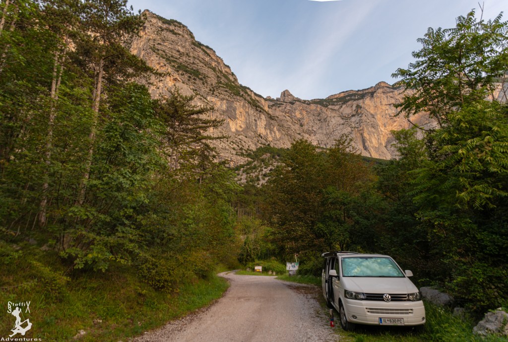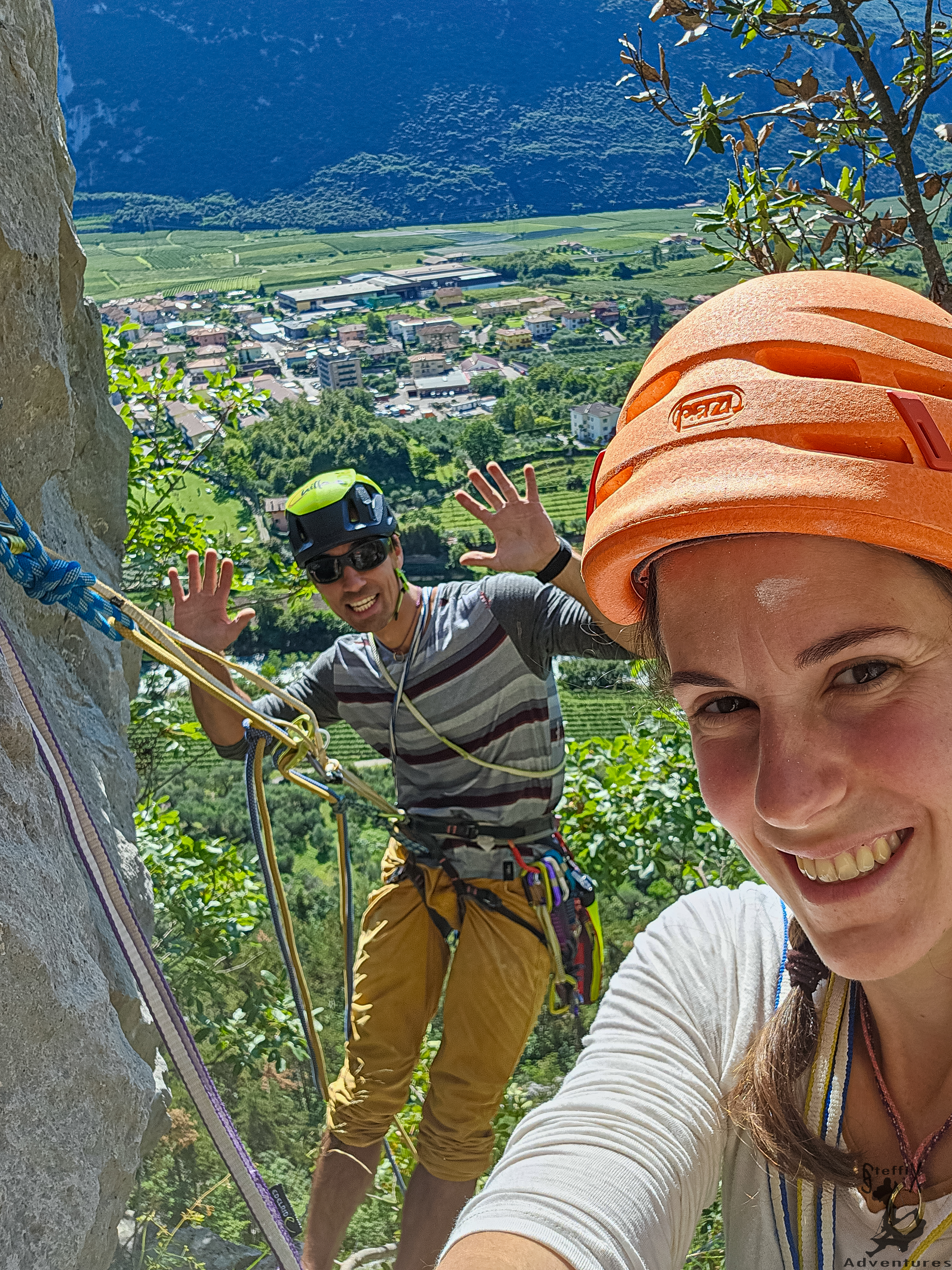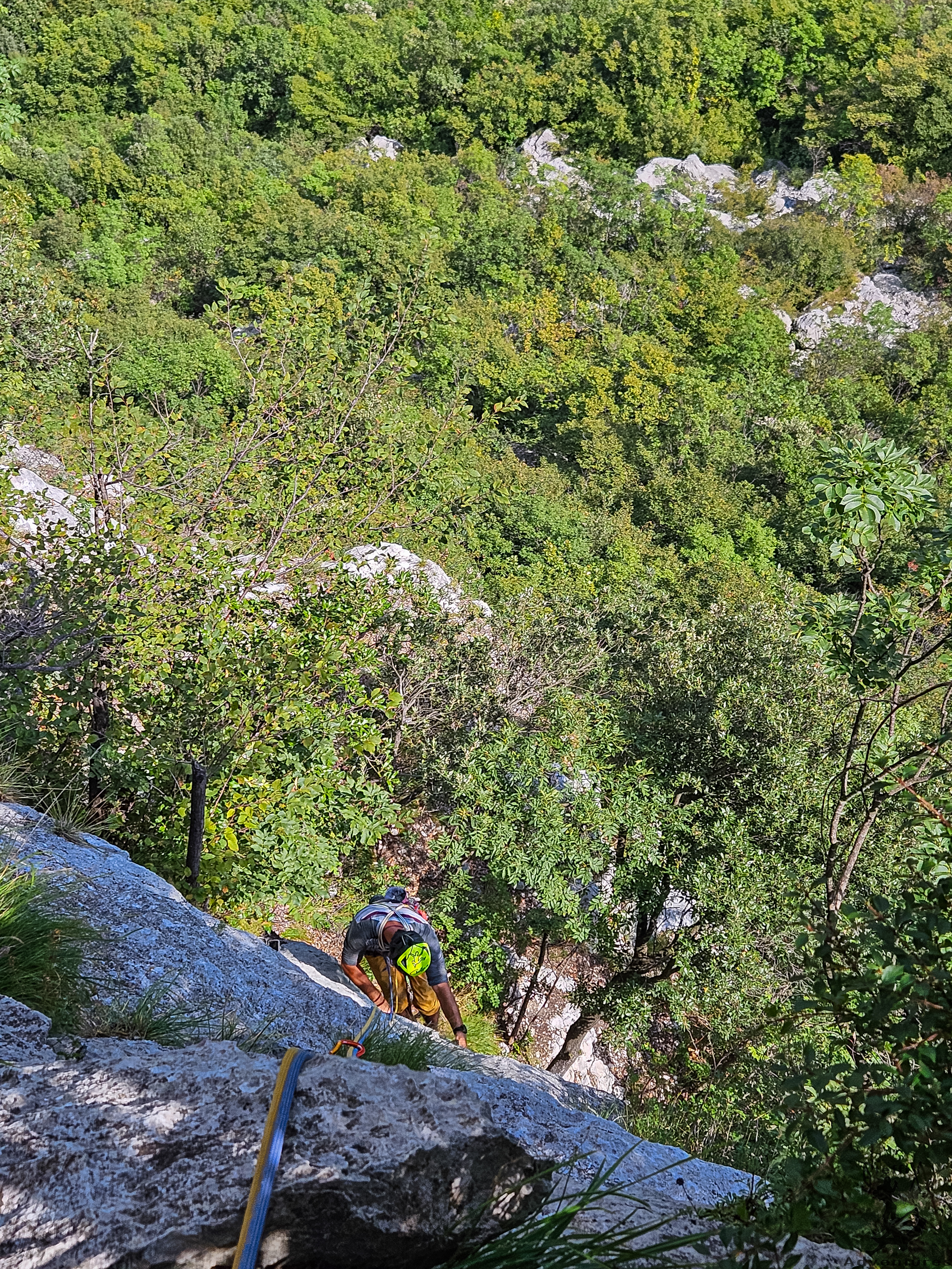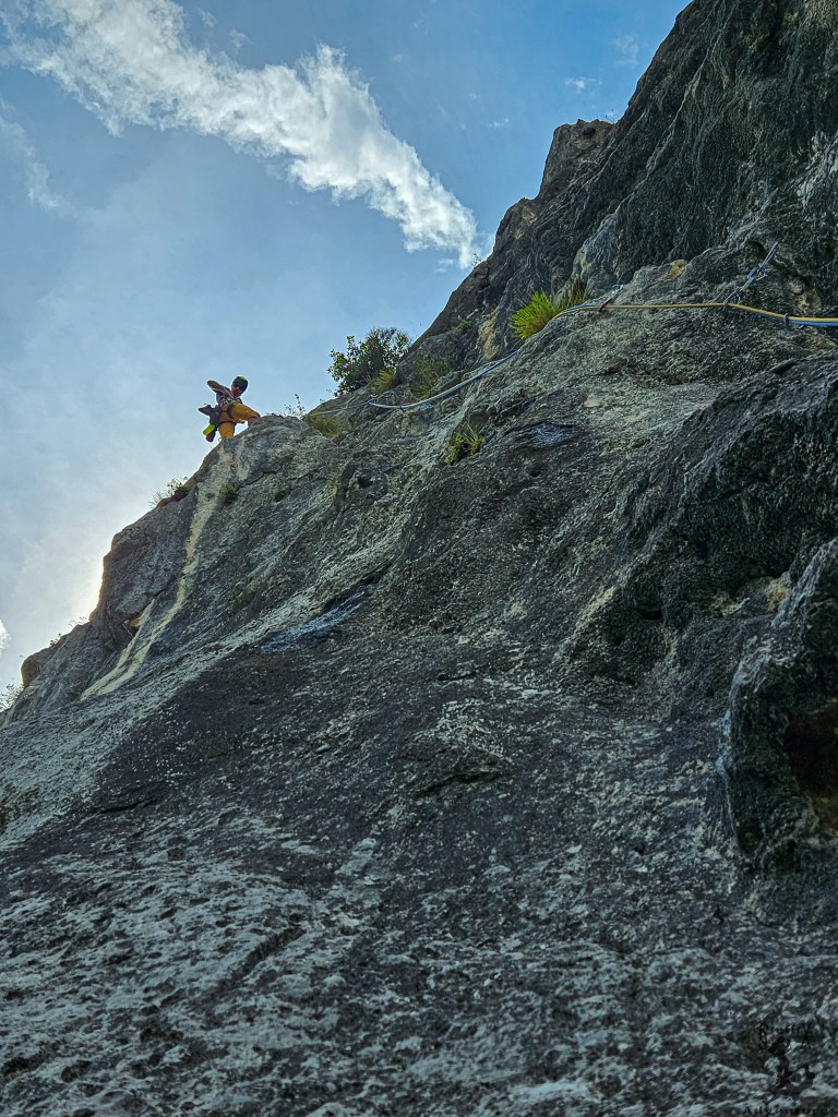 Seit unserer Hochzeit im Juni 2021 wollten wir einmal ein Wochenende zu zweit verbringen, um nochmal anzustoßen und eine schöne gemeinsame Zeit zu haben. Norwegen 2021 „erschwerte“ das natürlich erst einmal und nicht allzu lang nach unserer Rückkehr ging die Zeit in der Klinik los, was ein solches Vorhaben natürlich ebenfalls unmöglich machte. Ende August 2022 sollte es nun aber endlich soweit sein und wir machten uns fast wie früher nur zu zweit auf den Weg gen Süden. Nur diesmal mit neuem Bus und um viele Erfahrungen reicher. Der Nachwuchs war sicher bei Omi und Opi verstaut und der Hochzeitswein eingepackt. Natürlich wollten wir aber nicht nur herumsitzen und über in vino veritas philosophieren, sondern uns auch am Fels bewegen. Das Wetter versprach trockene Verhältnisse, wir hätten aber auch auf die Temperaturen achten sollen. Es war derart heiß, dass es uns aus der für den ersten Tag angepeilten Tour Archangelo gleich in der ersten Seillänge herausbrannte. Ein wenig ärgerte es uns, weil sie wirklich genial klingt, aber bereits die erste Länge bereitete uns große Schwierigkeiten, evtl. wegen der Hitze, evtl. weil wir noch gar nicht im Modus waren. Was auch immer der Grund war, wir entschieden abzuseilen und etwas zu warten, bis die ärgste Sonne aus den Wänden war und gingen dann noch nach etwas Einstiegssuche die Via Crucis. Eine sehr schöne und abwechslungsreiche Mehrseillängentour, die von Plattenkletterei, über Querungen und leicht überhängende Kletterei alles zu bieten hatte.