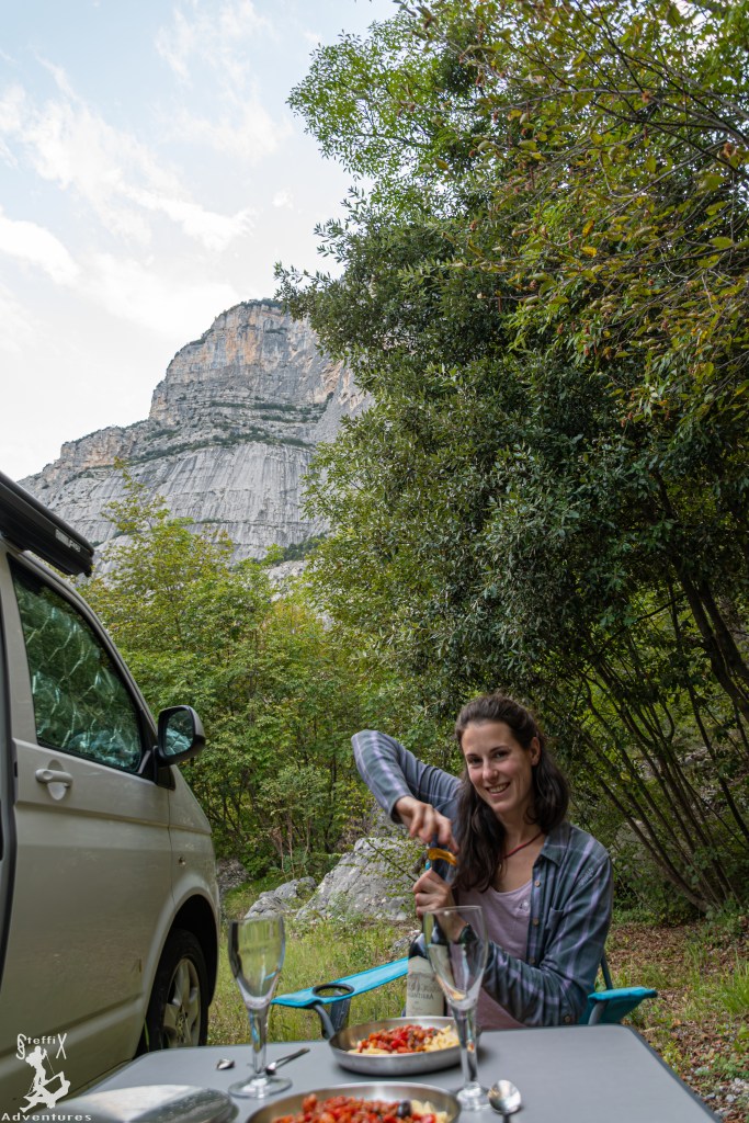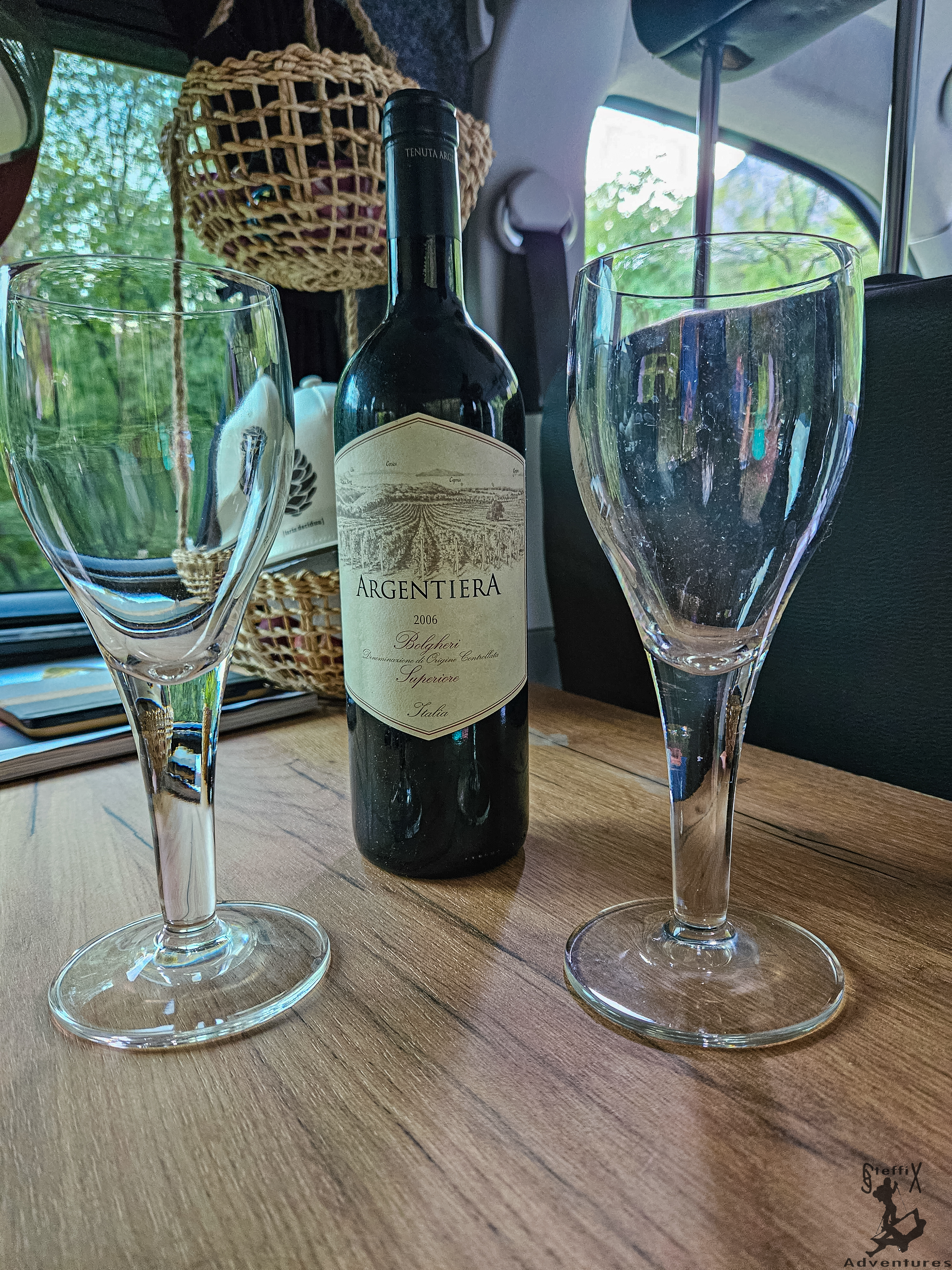 Wir verbrachten eine ruhige Nacht in unserer Josi-Nana und guckten uns für den nächsten Tag die La piccola Verticalita aus. Zunächst musste am Abend aber noch der Hochzeitswein verkostet werden. Tipp an alle: Immer Mückennetz dabeihaben, falls man mal Kork aus dem Wein filtern muss, weil der Korken abbricht 😀