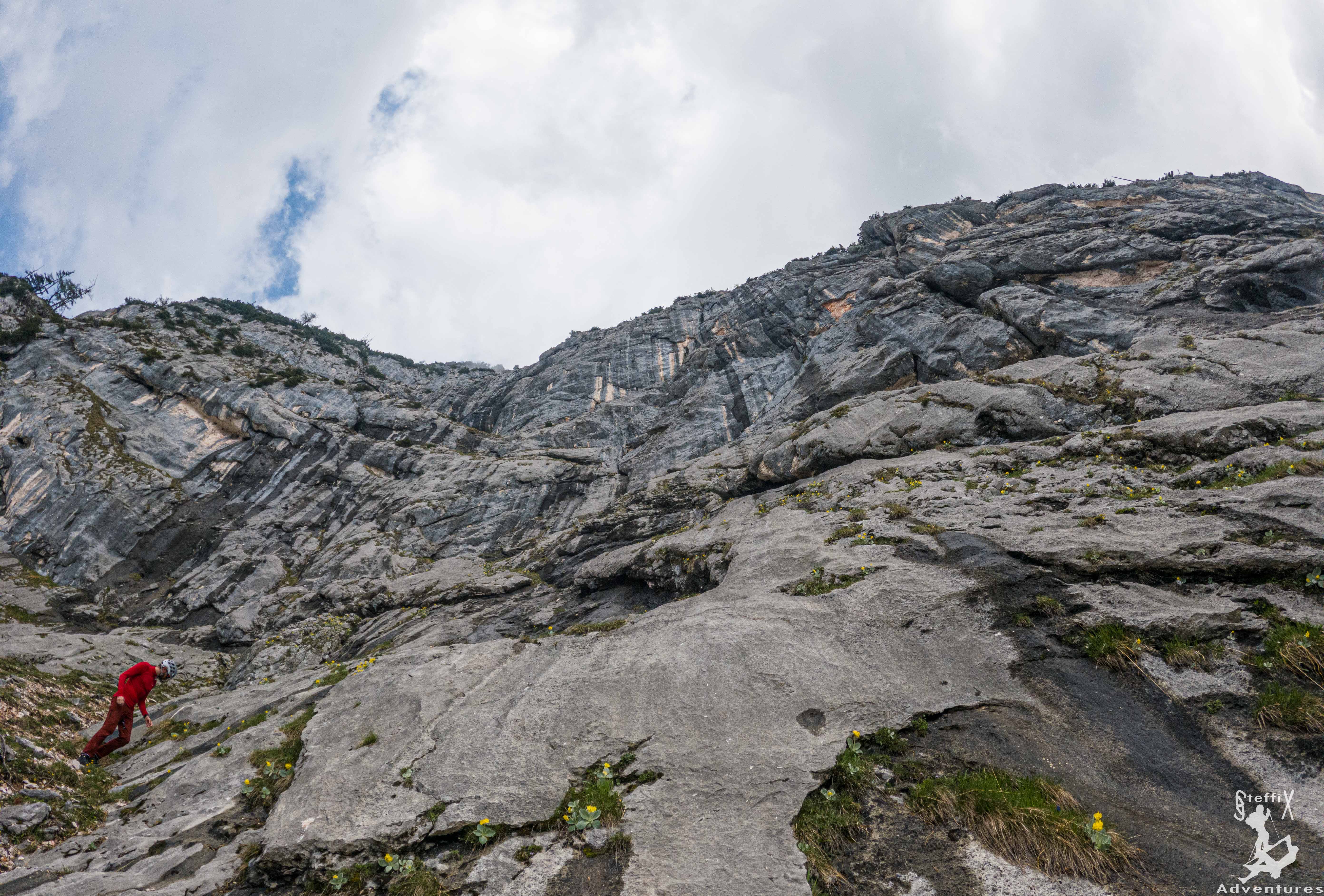 WandfußTalblickQuergang in der 3. SeillängePlattigSelfie beim Abseilen