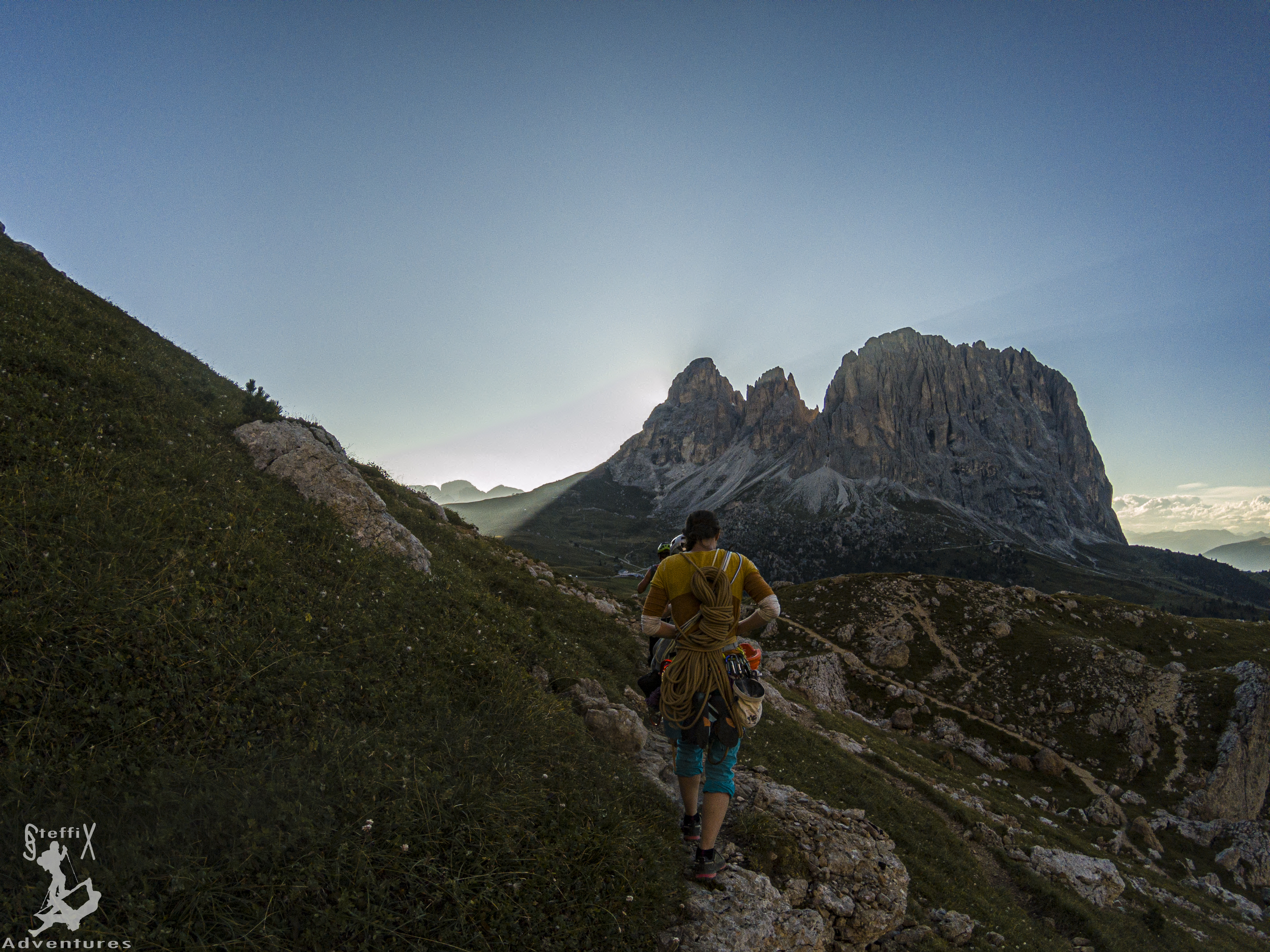 Irgendwie war es dieses Jahr etwas verhext, das Wetter sollte, dann wenn wir Zeit hatten, nie so sein, dass alpine Touren möglich waren. Das erste Septemberwochenende sollte aber endlich perfekt passen. Wir hatten den Freitag frei und so erwarteten uns 3 Tage mit Josi und Fels. Da in Österreich ab Samstagmittag das Wetter nicht mehr so gut sein sollte, entschieden wir uns zum Sellajoch zu fahren.