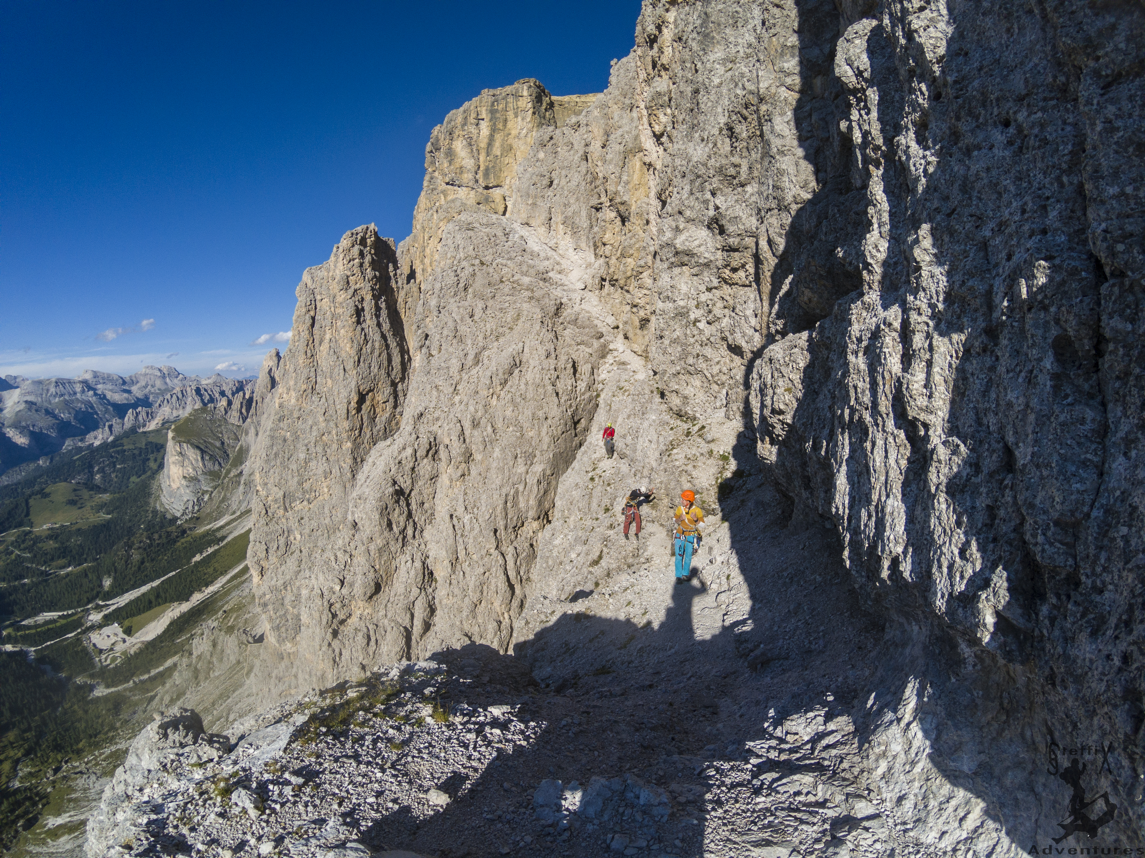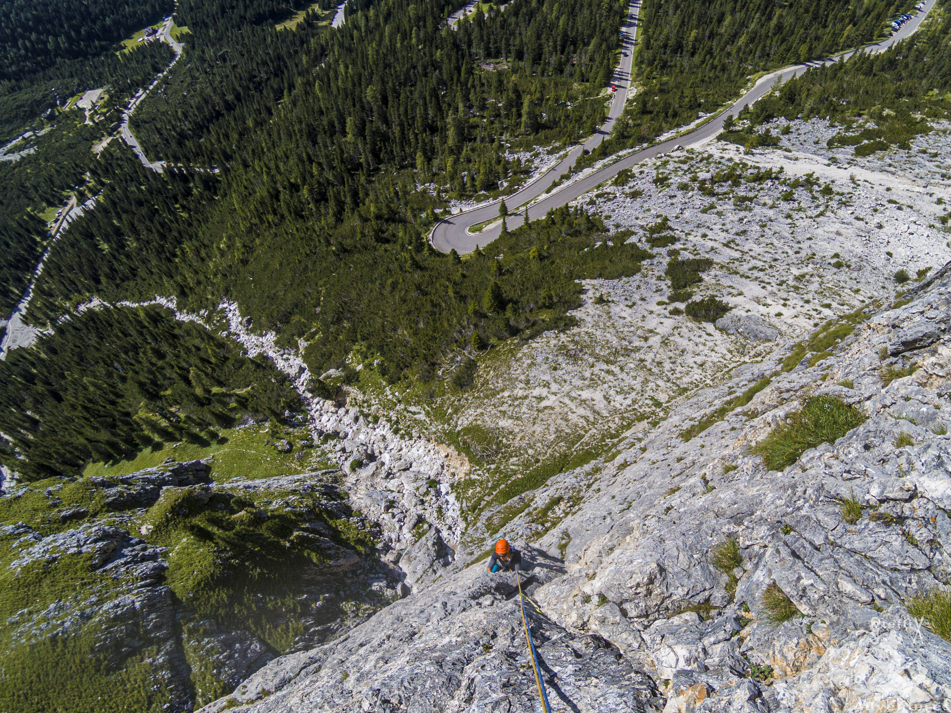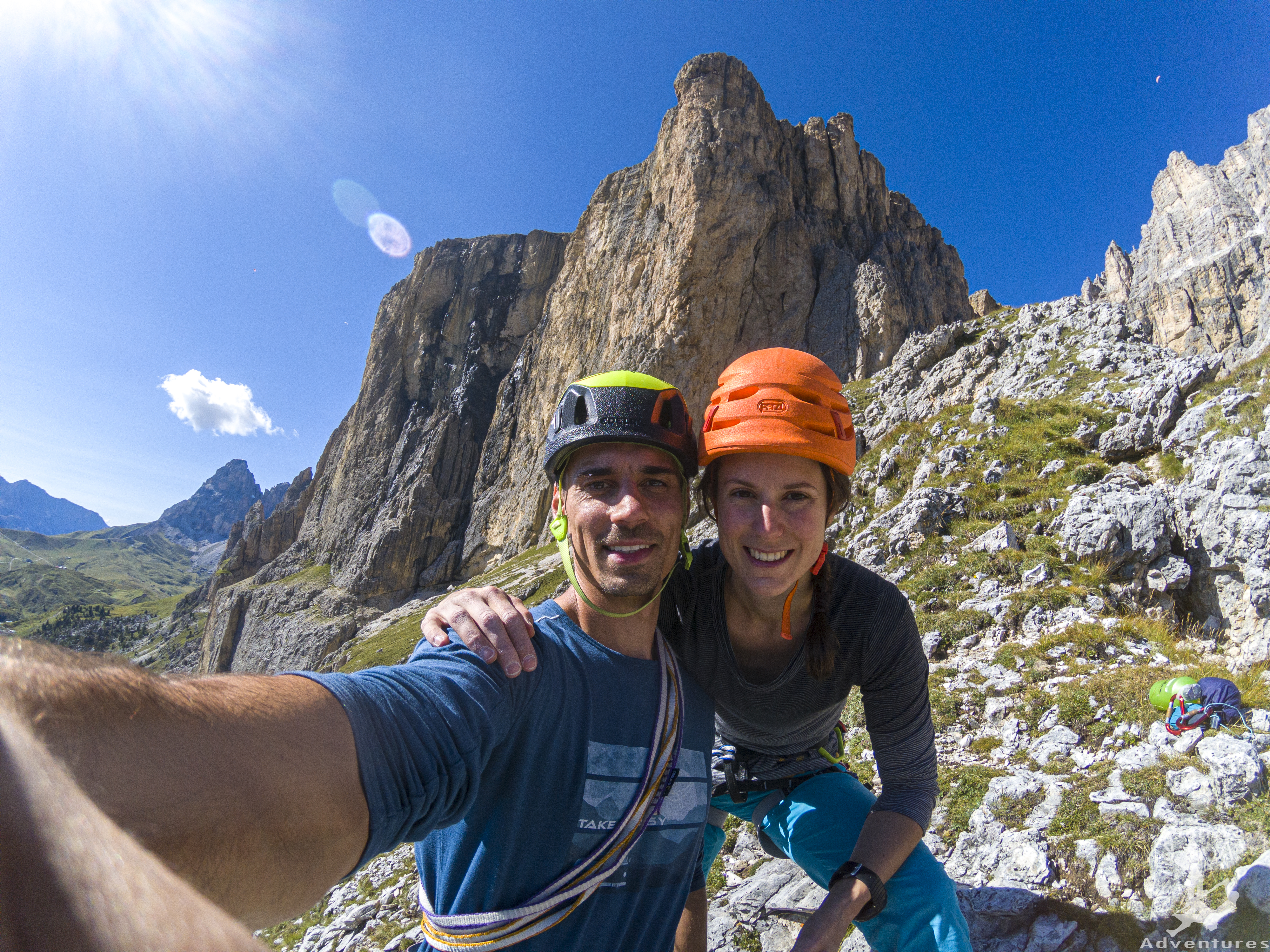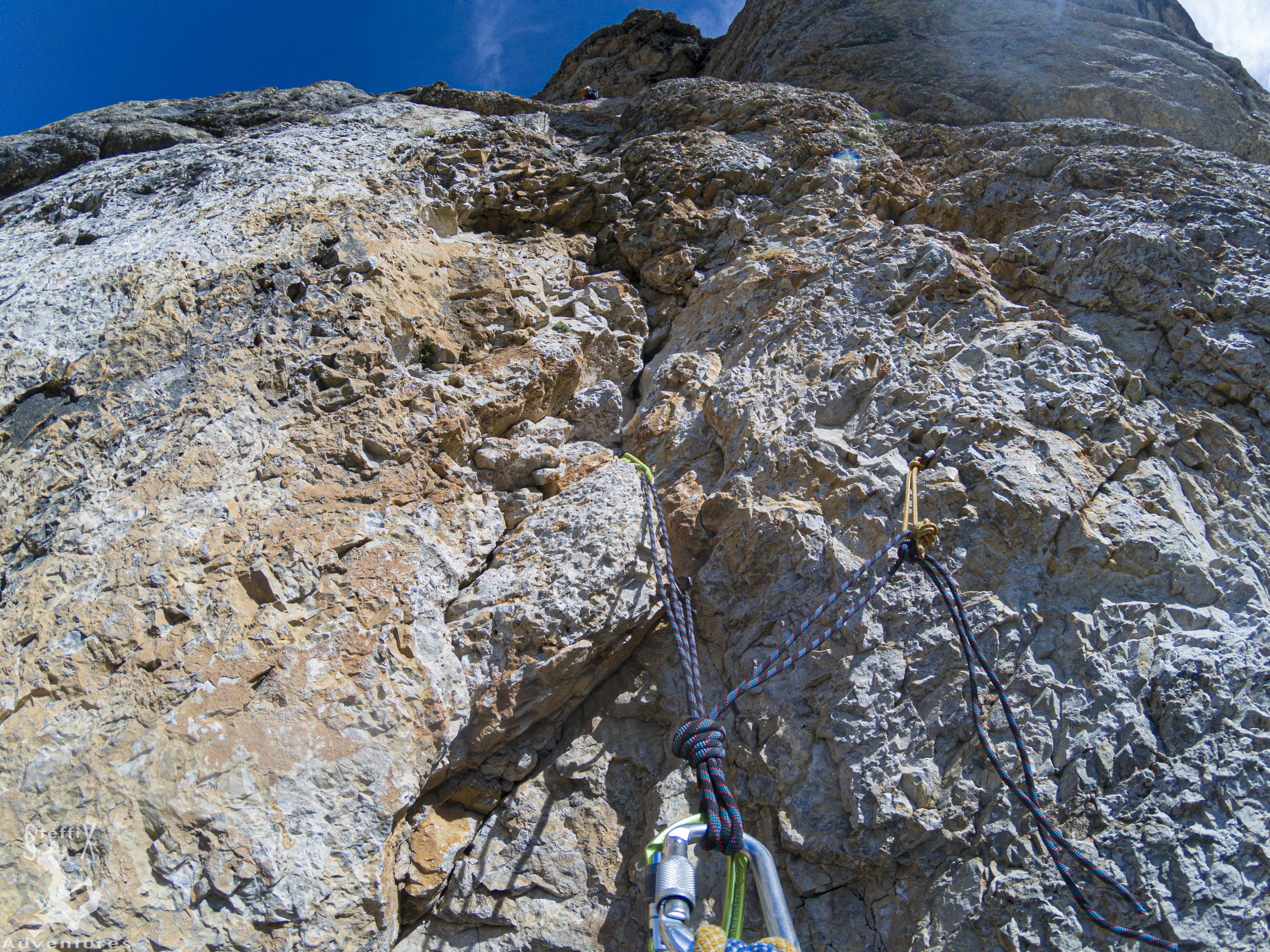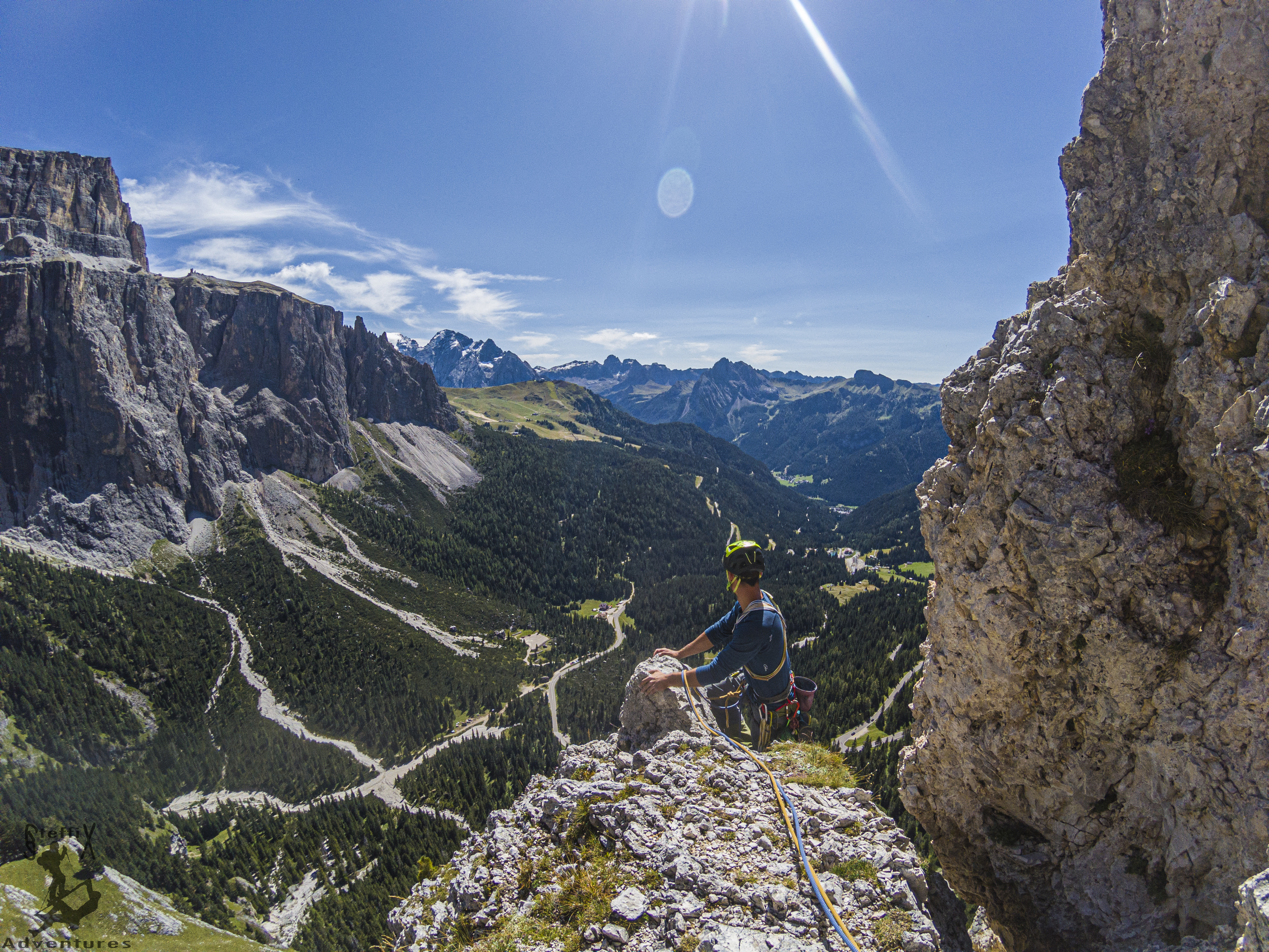 Wir kamen Freitagabend an, jausneten noch schnell und schliefen voller Vorfreude zeitig ein. In der Früh wollten wir dann aber nicht so recht aus dem warmen Bus raus und da die Tage ja noch relativ lange sind und auf über 2000 Meter die Sonne dann schon gut tut, starteten wir erst um 09:30 Uhr vom Auto weg. Der Zustieg zur Abram-Führe am Piz Ciavazes ist schön kurz, dafür war unsere Tour aber besetzt und so warteten wir noch etwas in der Sonne. Danach ging es aber relativ zügig voran und die Schlüssellängen konnten gut gemeistert werden.