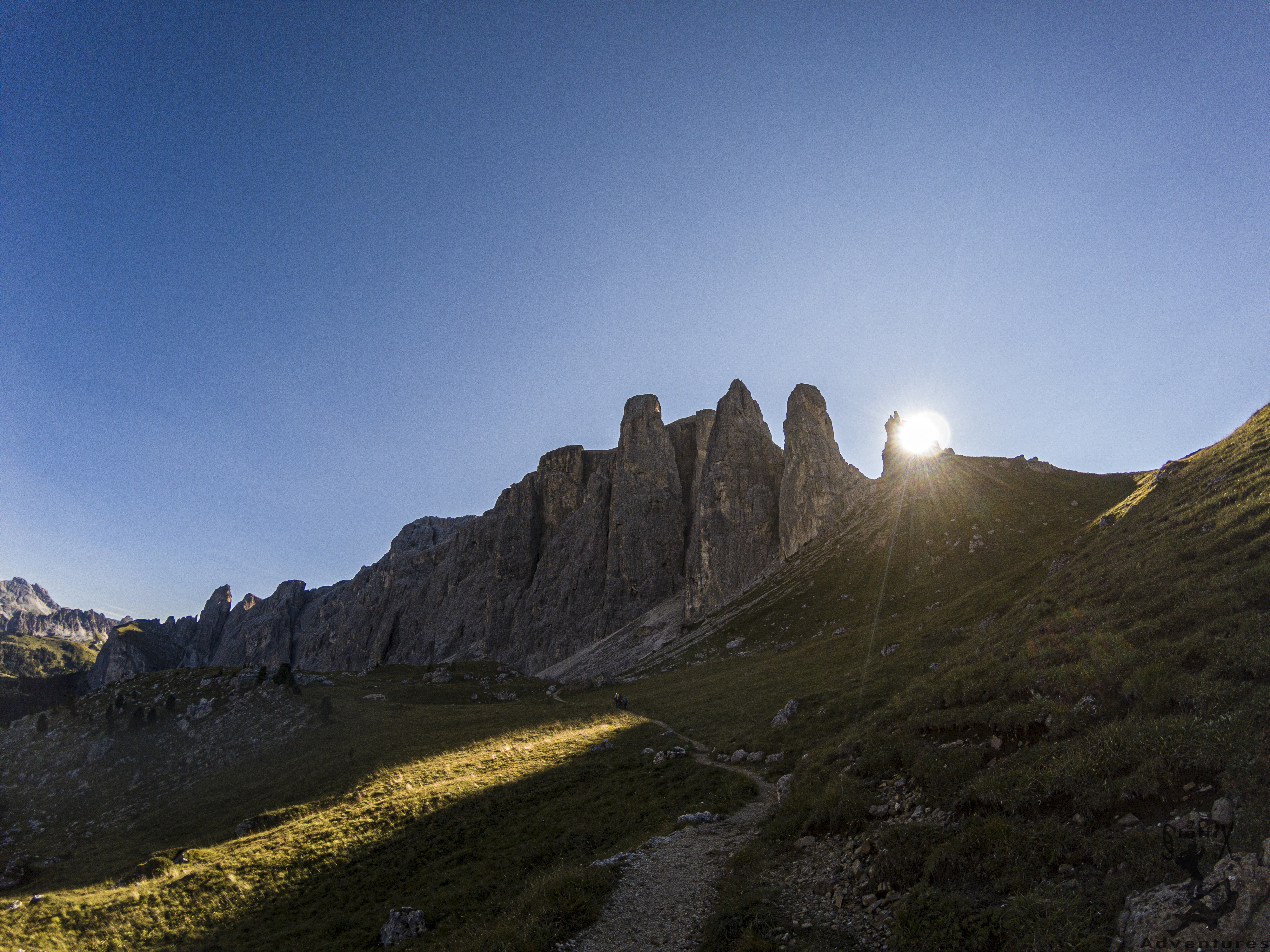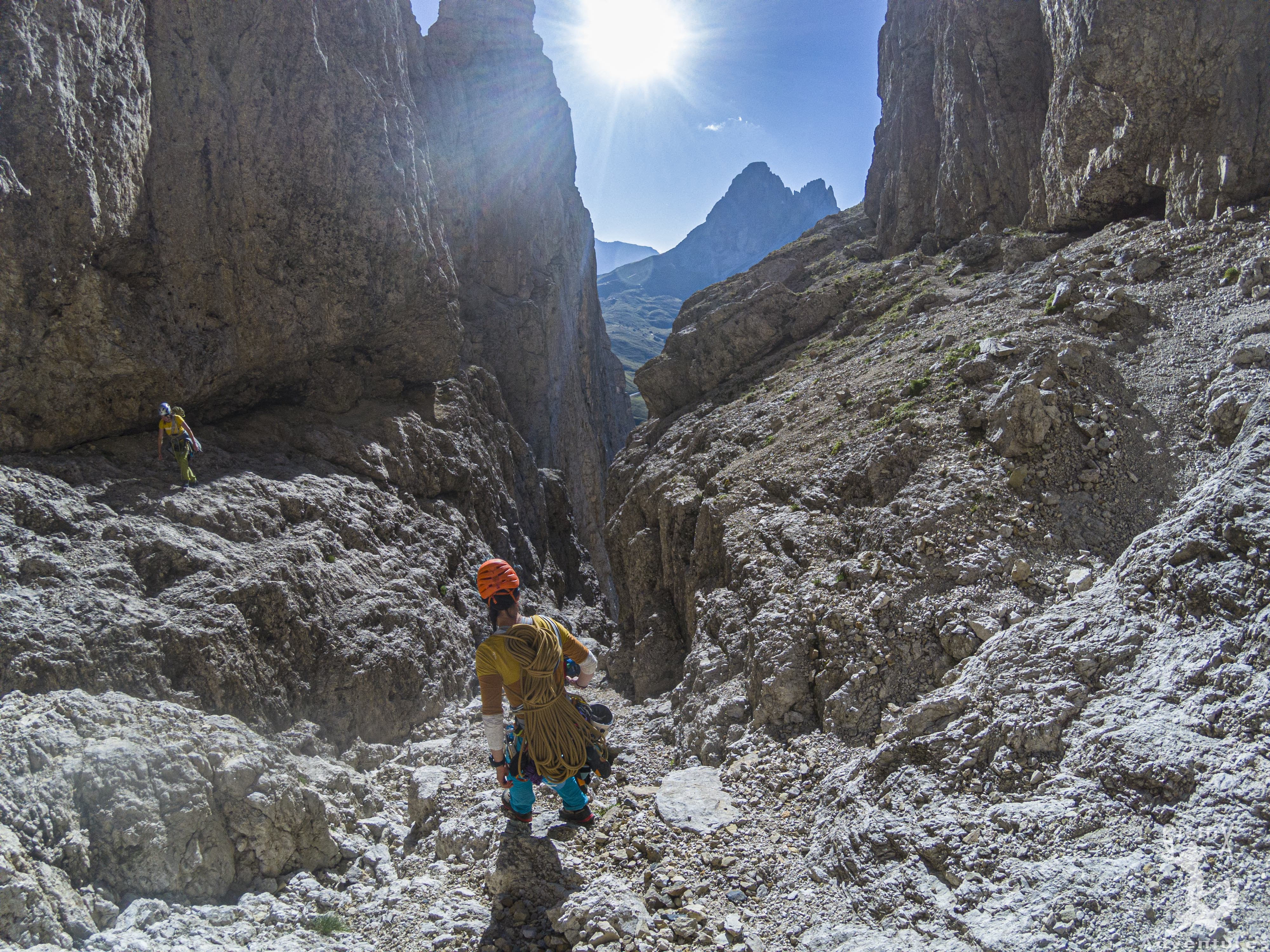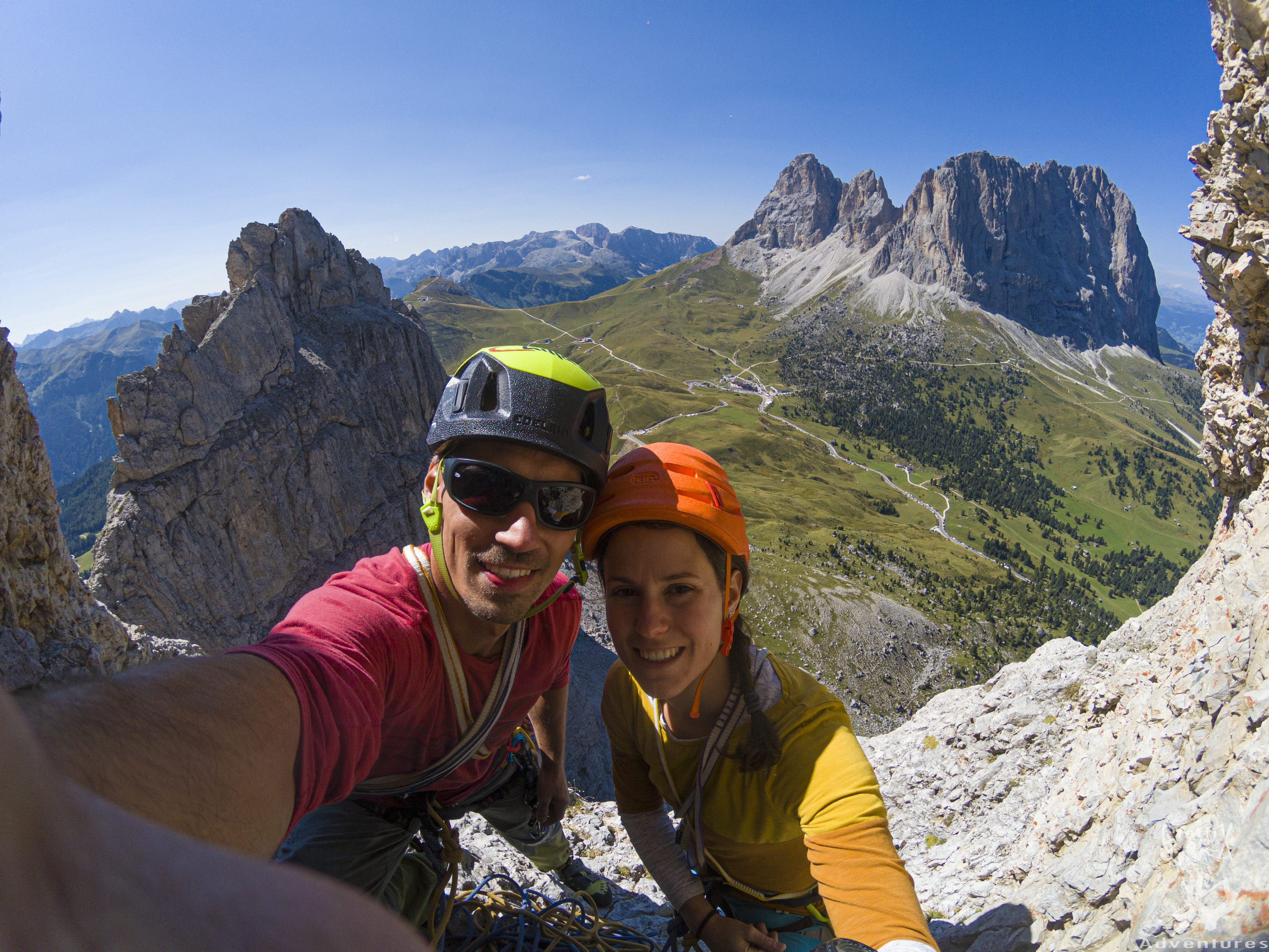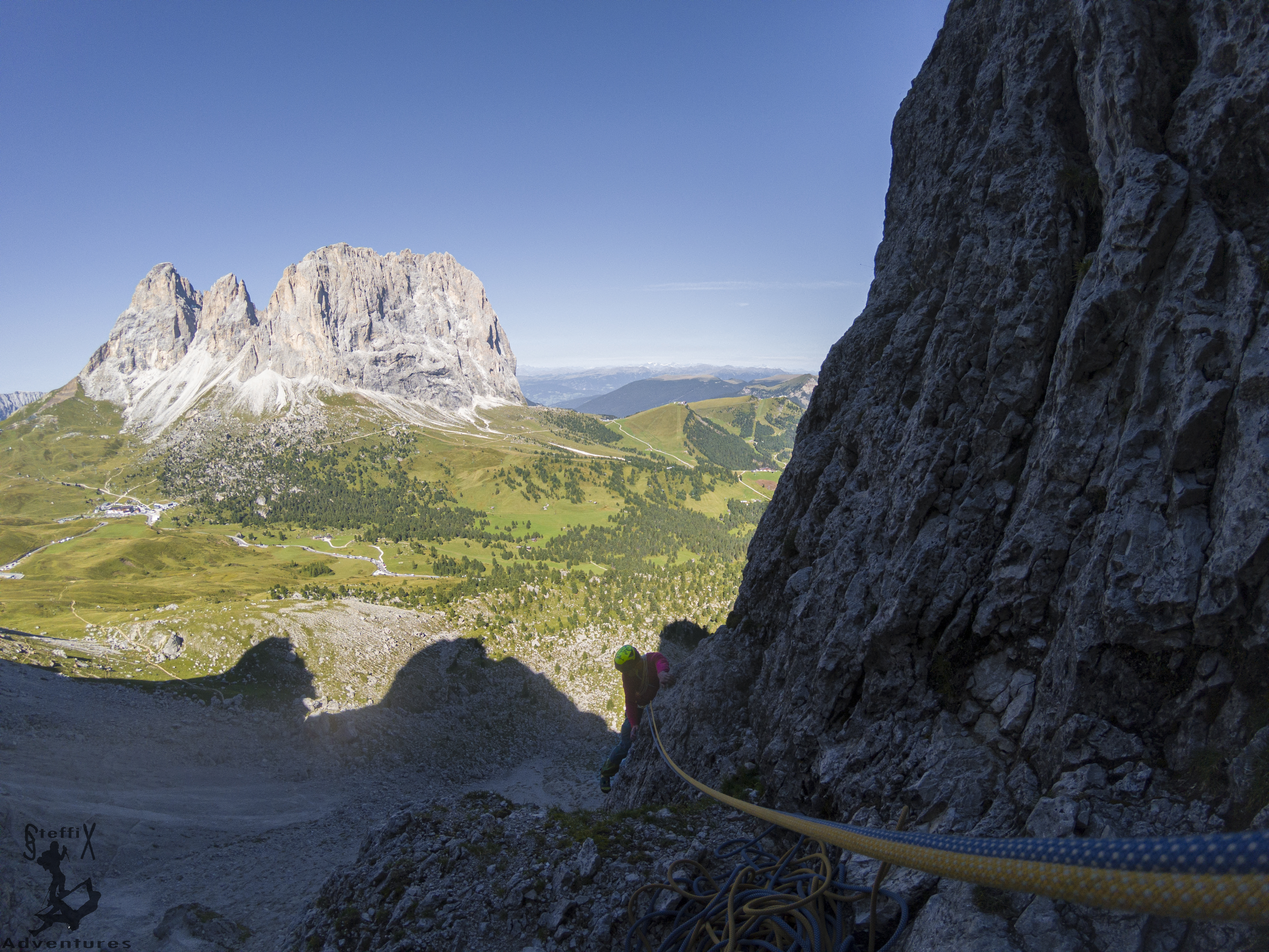 Nach der 5. Länge war die Hauptschwierigkeit vorbei und es erwartete uns bis oben hin Plaisirkletterei. Die Routenfindung war einfach, die Linie logisch oder das Topo einfach so gut-in jedem Fall genossen wir die Kletterei in vollen Zügen. Das Panorama in dieser Tour und vom Gamsband oben, einfach immer wieder atemberaubend. Der Abstieg löste sich auch ganz logisch auf und so waren wir bereits um 16:00 Uhr beim Auto konnten uns bei Sonnenschein waschen und die Abendsonne mit Blick auf den Langkofel genießen, was für ein schöner Tag.