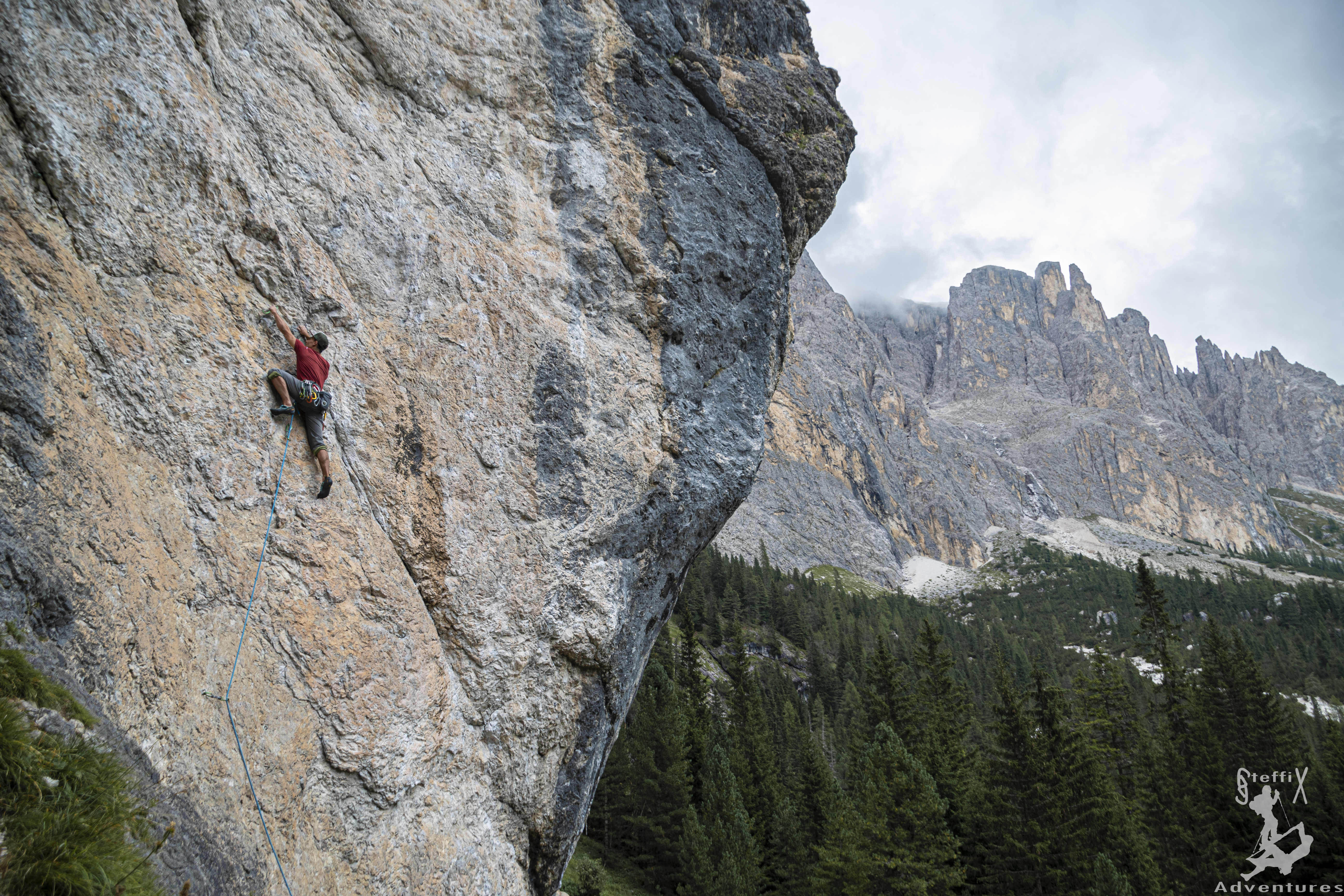 Am nächsten Tag schliefen wir in Erwartung von dem eintreffenden Regen aus, wurde aber von einem blauen Himmel überrascht. Da am Vorabend Kletterer an uns vorbeigingen, forschten wir nach, ob in unserer Nähe ein Sportklettergarten ist und siehe da, keine 10 Minuten von unserem Parkplatz entfernt befand sich das traditionsreiche Gebiet Cogoi – Pian Schiavaneis. Da es regensicher beschrieben wurde, packten wir nach ausgiebigem Frühstück unsere Sachen und verbrachten noch recht unverhofft einen lässigem Sportklettertag in dem Gebiet. Auch wenn manche Touren geschlagene Griffe haben, ist das Ambiente genial und die Kletterei dafür umso athletischer. Am Abend ging es durch Starkregen und eine leider recht volle Autobahn gen Innsbruck. Wir waren aber durchwegs zufrieden und kamen erholt und mit vollen Akkus in Innsbruck an.