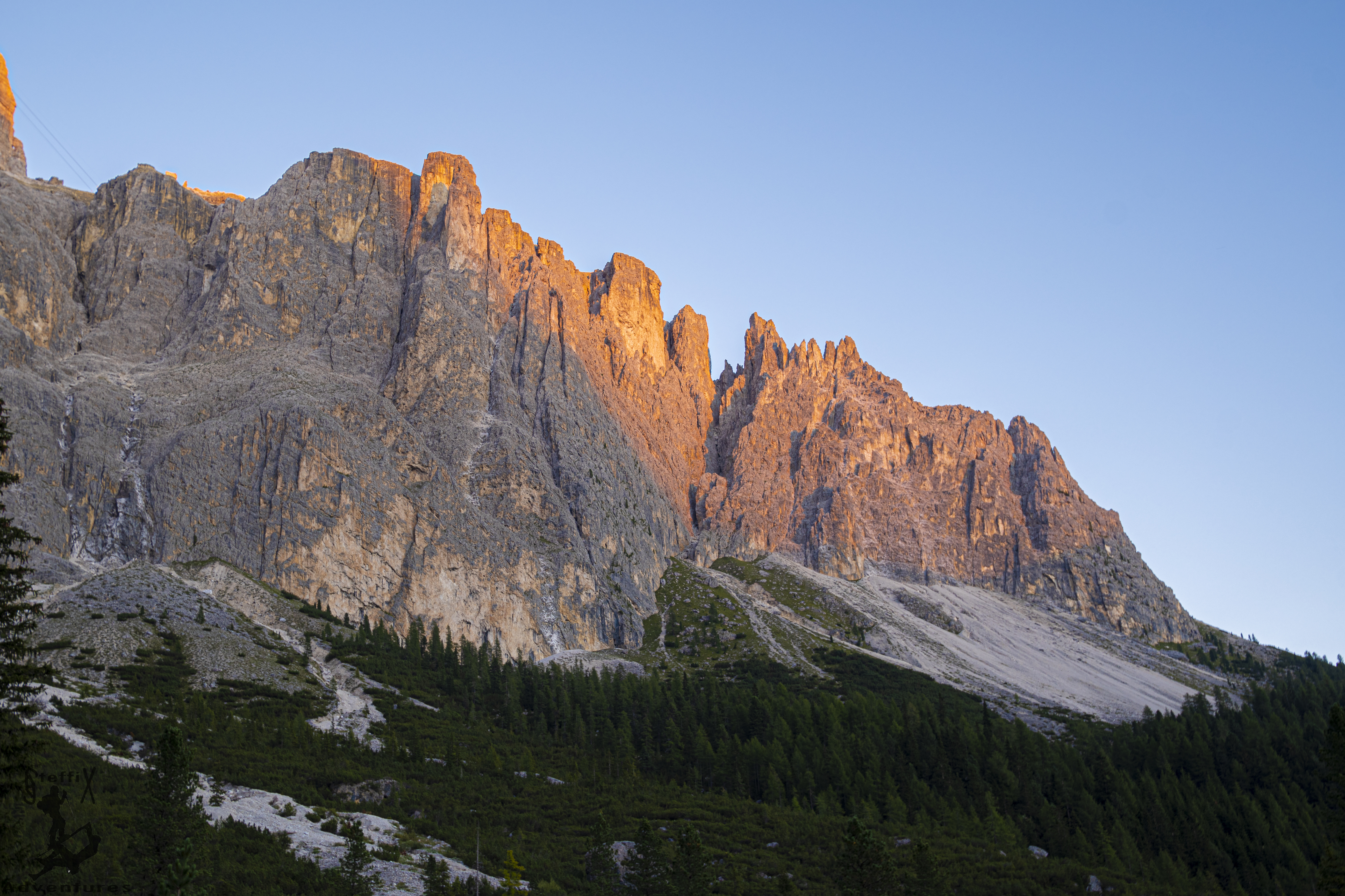 Aber dann fing es an: Der Fels wurde brüchiger, die Wegfindung schwierig und so brauchten wir in den Seillängen 9 und 10 sehr lange und mussten die Stände selber bauen. Bei der 9. Seillänge wie im Link beschrieben zum Doppelhaken, dann nach links durch den brüchig wirkenden Fels, bis sich ein Riss über einem auftut. In diesem steckt ein alter Schlaghaken und von dort immer noch ca. 10 Meter weiter leicht rechts dem Riss folgend. Der Stand befindet sich dann unter einem kleinen Überhang, von dem es nach rechts dem Riss folgend weitergeht. Es stellte sich zwar heraus, dass wir grundsätzlich auch immer richtig waren, bauten den Stand zwischen 9. Und 10. Seillänge einfach zu früh. Der Seilschaft hinter uns ging es witzigerweise gleich. Die Stände sind dann zwar immer aufgetaucht, aber einfach etwas später als vermutet. Dieser brüchige Abschnitt hat uns ordentlich gefordert und viel Zeit und Energie gekostet, aber wir schafften es dann doch noch auf den Gipfel, jucheheee. Nach einer ausgiebigen Gipfelpause mit den Südtirolern machten wir uns zusammen auf den Abstieg, teilten Abseilpisten und hatte super nette Gespräche, so wurde es beim Abstieg in der Abendsonne auch nie langweilig und das Ende der Wand war bald erreicht. Bei den letzten Metern zum Auto konnten wir das Lichtspiel der untergehenden Sonne hinter der Grohmannspitze beobachten und nach einer kurzen Dusche schmeckten die Nudeln mit Pesto besser als jedes 5 Sternemenü. Es muss manchmal nicht viel sein 😊