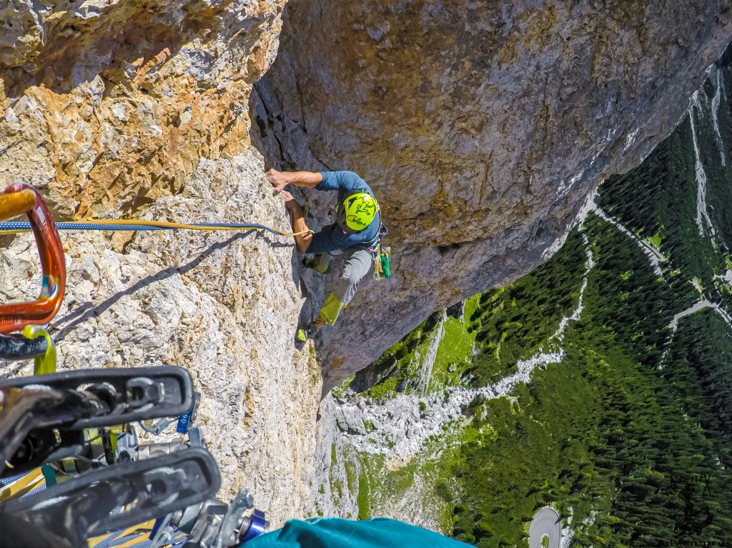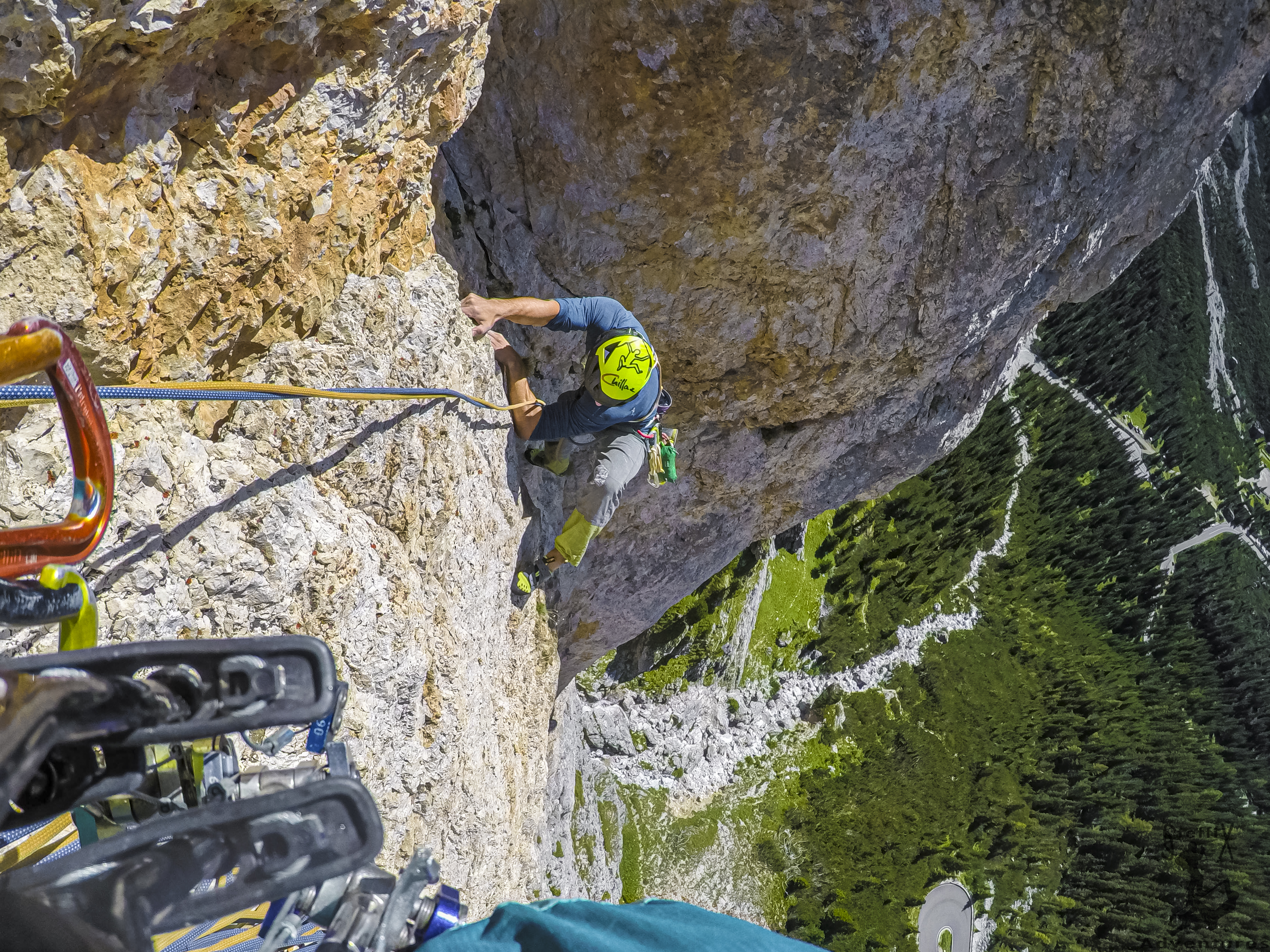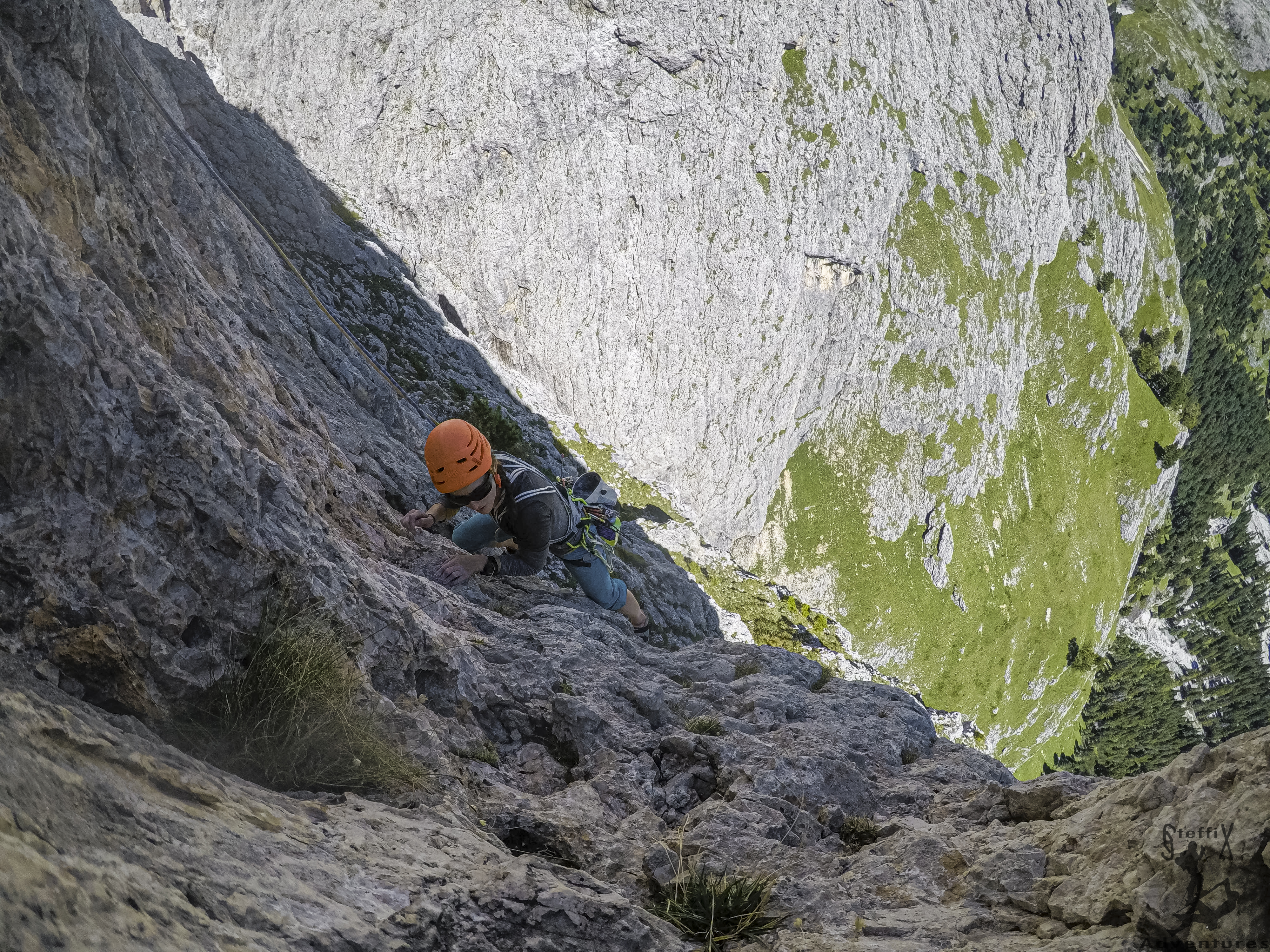 SL #5: Die wahrscheinlich fordernste Länge, da die Schwierigkeit sehr anhaltend ist, zieht die sich nach oben erstreckende Rinne entlang und fordert von Platten-, über Verschneidungs- und Piaz-Klettern einiges an Bewegungstalent ab. Geniale Länge!