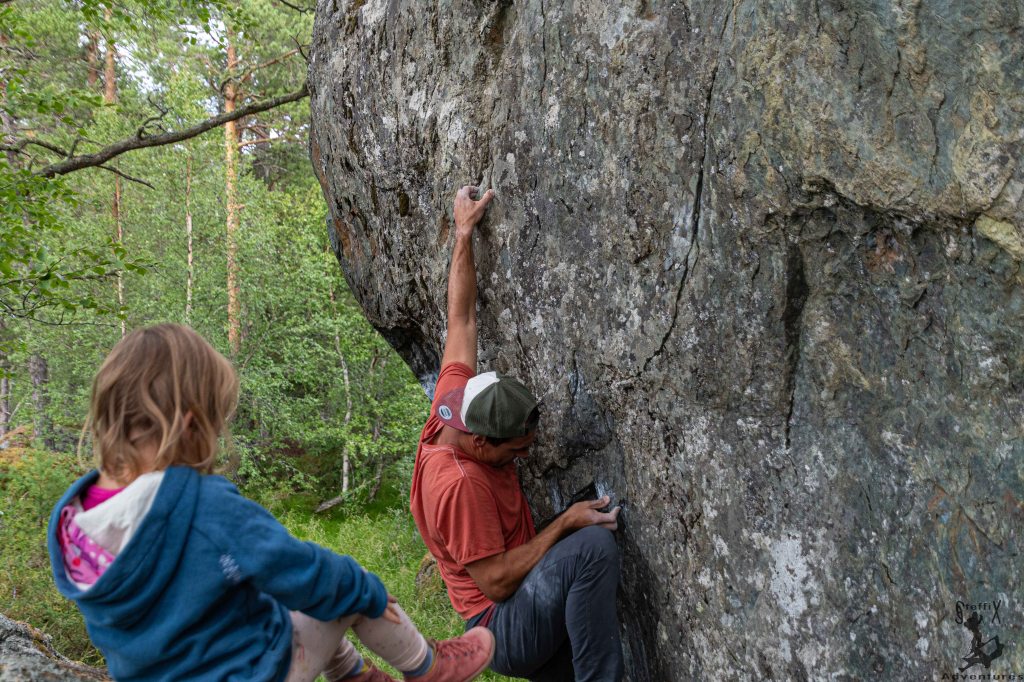 Der geplante Start mit 3 Nächten am Campingplatz Ivö Camping ist die absolut richtige Entscheidung, wir können als Familie sehr entspannt ins Josi-Nana (unser Auto 😊) Leben reinkommen. Das Bouldergebiet ist abermals ganz nett und das Wetter testet uns dann auch gleich. Eine Gewitterböe zerstört unsere Markisenhalterung, welche leider nicht reparierbar war und so geht es am schnellsten Weg mit Markise im Auto in Richtung Ferienhaus von Steffi und Martin, wo die Ersatzteile geliefert werden sollen. Die Reise zum Ferienhaus in Ramsberg funktioniert gut und wir feiern ein Revival mit Clemens, Sandra und Nachwuchs. Wir genießen wie schon vor 3 Jahren die Zeit bei Steffi, Martin und Junior sehr, pflücken Heidelbeeren und machen sogar Marmelade für die Reise, fahren mit dem Boot, angeln, schwimmen, planschen, saunieren und spielen Kubb. Danke euch abermals für die unvergesslichen schönen Tage in eurem kleinen Paradis. Die Teile kommen zeitnah und die Markise kann wieder aufs Auto. So geht es dann am 17.07 weiter in den Norden. Ganz nach dem Motto Treiben lassen, ist für uns nach der Wetterberichtrecherche klar, dass wir in den Norden müssen. Da im Norden Reisen einfach keinen Mühen macht haben wir die Reisetage tatsächlich eher als Badetage abgespeichert, denn jede Pause wird bei sehr warmen Temperaturen bei einem schöneren See als dem anderen, meist fast allein, genutzt. Luxus pur und so sind wir zwei Tage später bei Mosjoen, eigentlich mal als eventueller nördlichster Punkt gedacht, war dann nicht so 😊 In Mosjoen gibt es jedenfalls eine neue Angel für Felix. Beim Einweihen der Angel beißt dann gleich mal ein Dorsch und unsere Große möchte ihn rauskeschern, dabei macht sie allerdings an den Scheren einen Abgang und landet im Wasser. Zum Glück geht die Situation gut aus und was in Erinnerung bleibt, ist, dass es sich am Meer und Wasser auszahlt immer sehr vorsichtig zu sein.